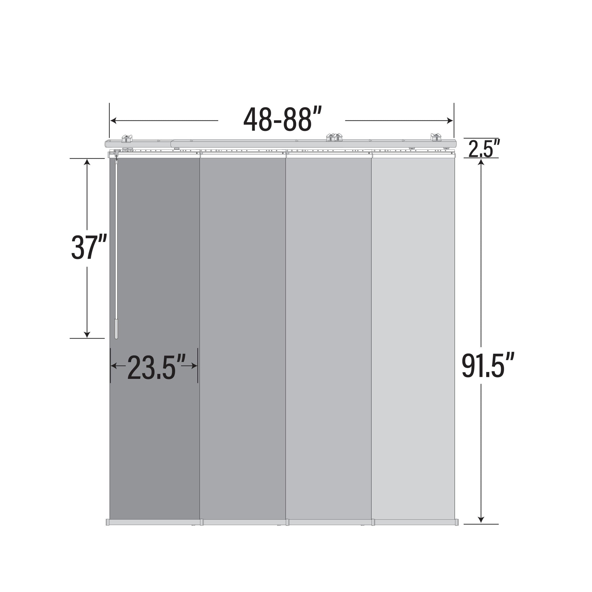 Each panel is measured 23.5" wide and 91.4" tall. Adding the height of the rail track 2.5", the installation will be 94" tall. To adjust the height of the panels, simply trim the panel, re-attach the liner and install the panel weight. Detailed instructions included.
