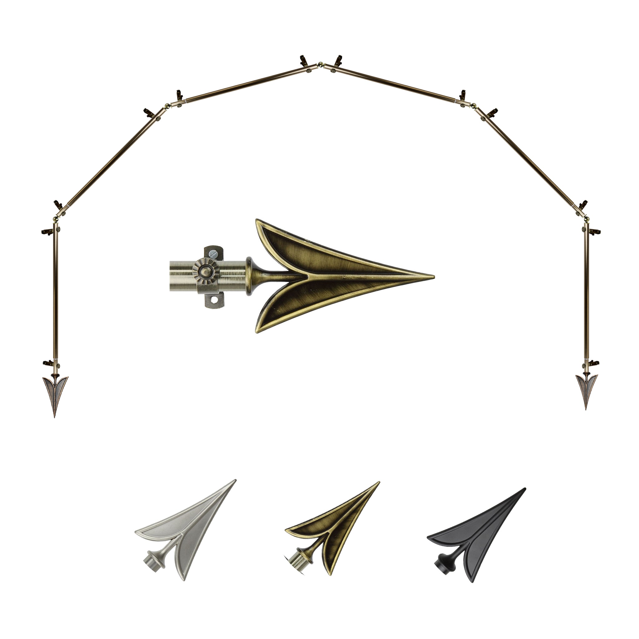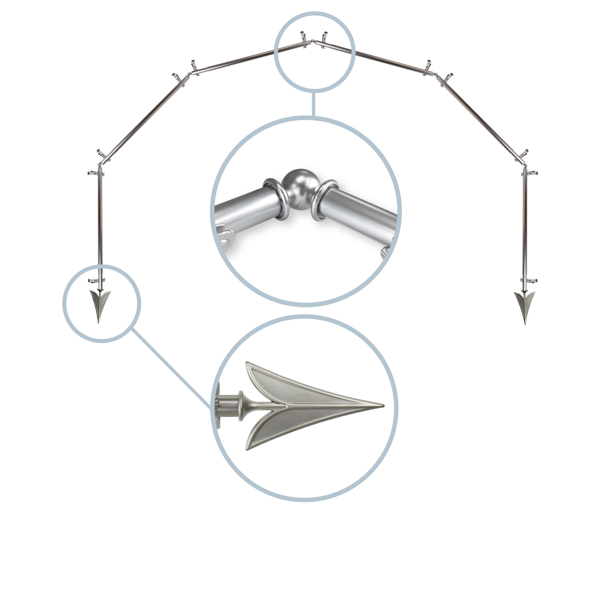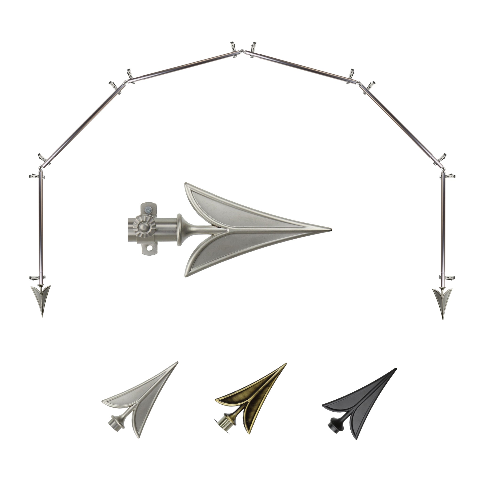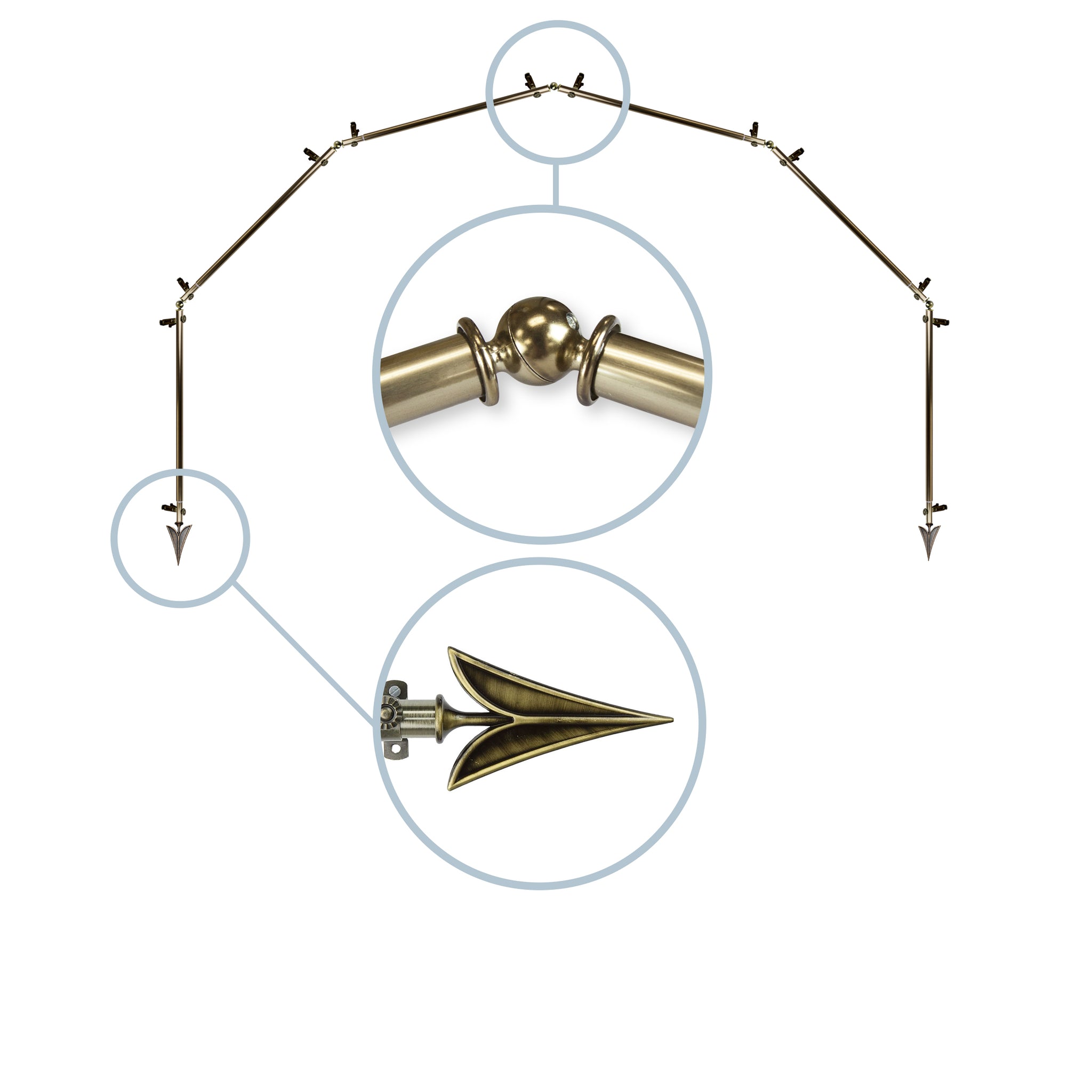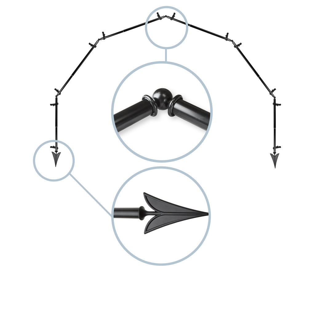 Includes six 13/16" diameter adjustable poles, one pair of decorative finials, 12 single brackets, 5 corner connectors, and mounting hardware