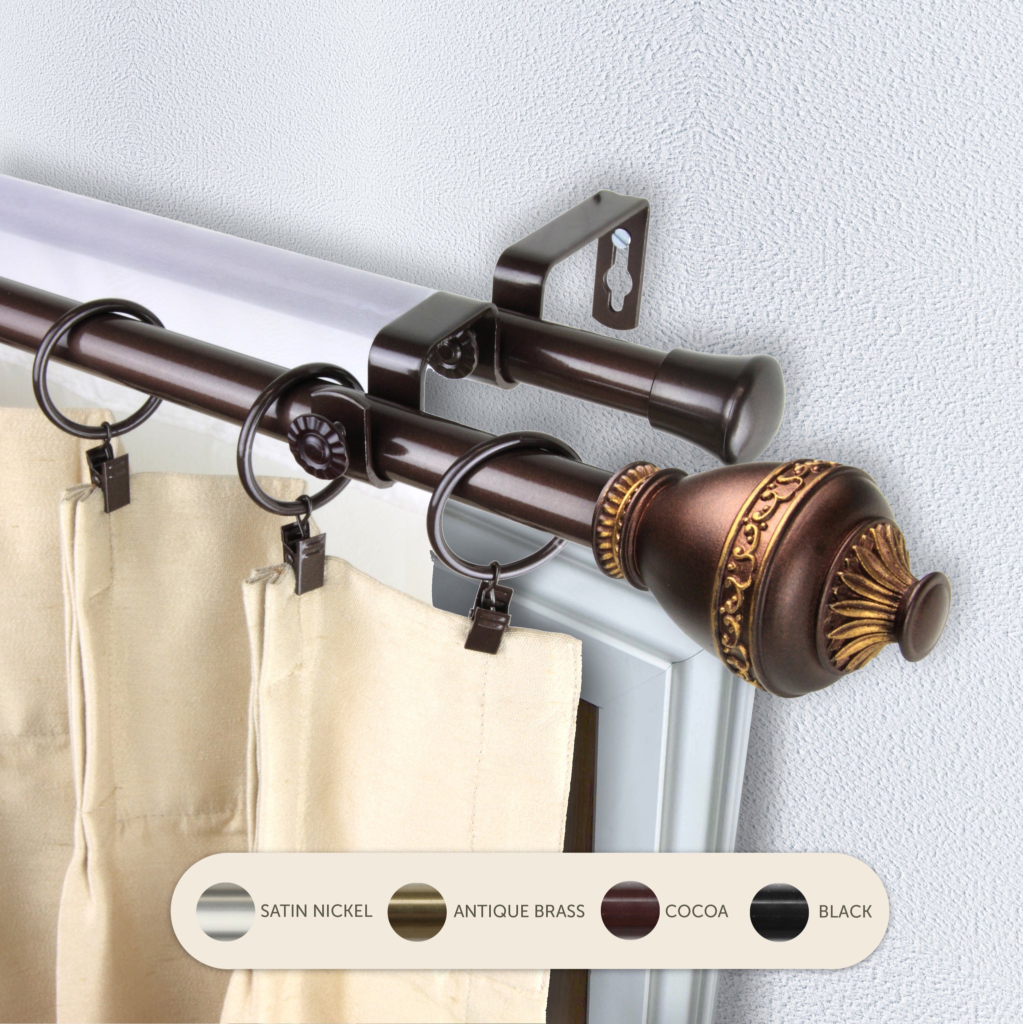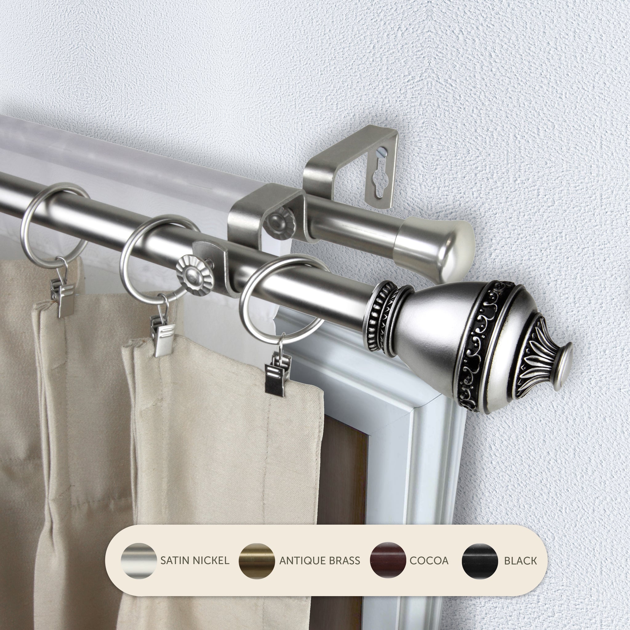 Includes two 13/16" adjustable high-quality steel telescoping poles, two finials, double brackets, and mounting hardware