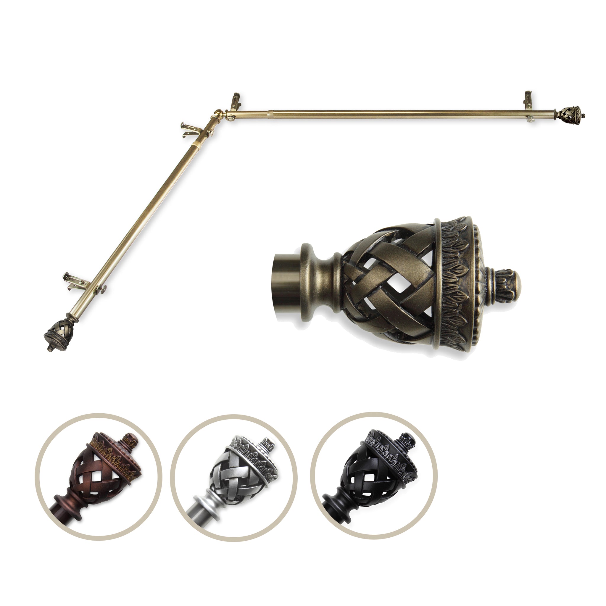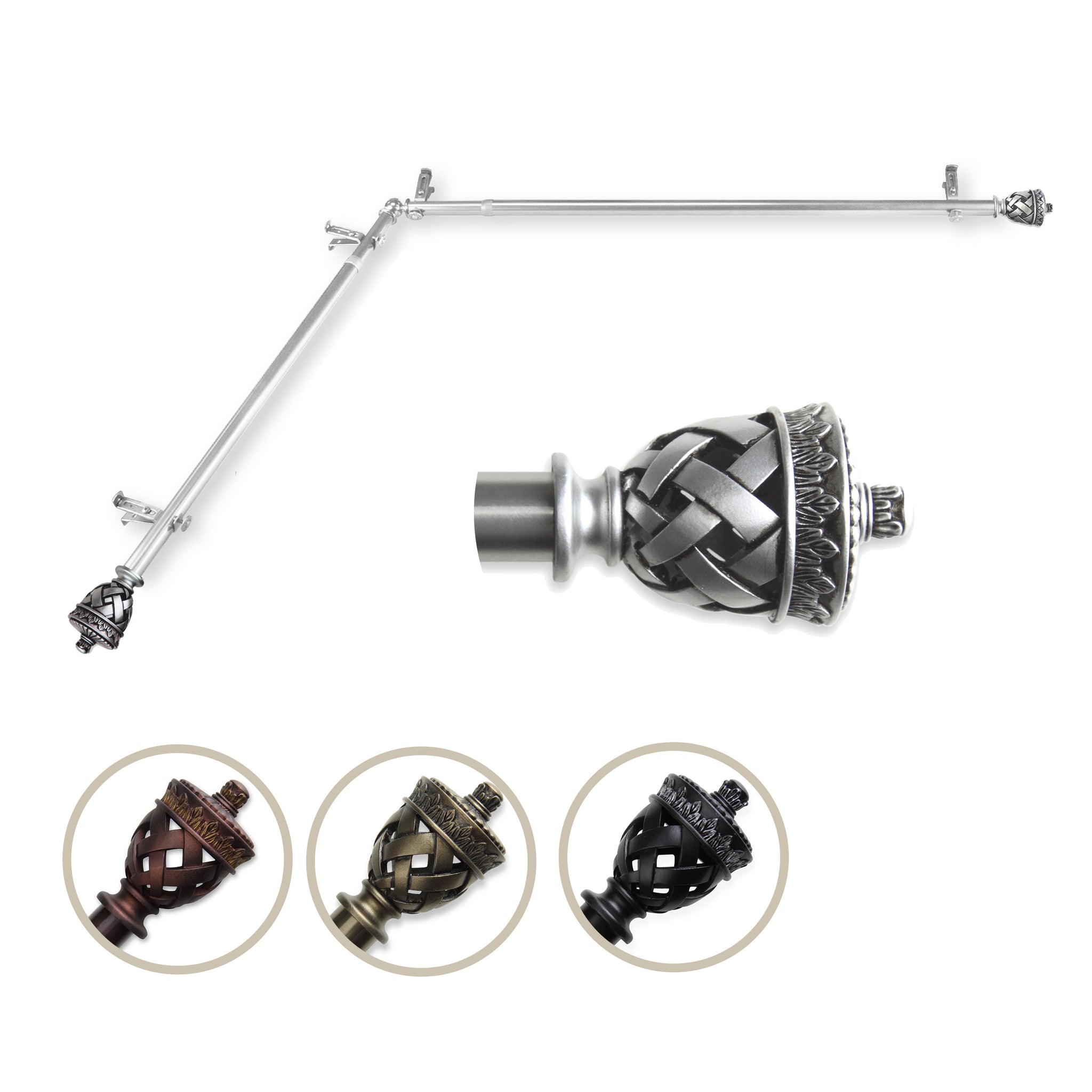 Includes two 13/16" diameter adjustable poles, one pair of decorative finials, one corner connector, brackets and mounting hardware