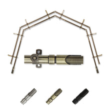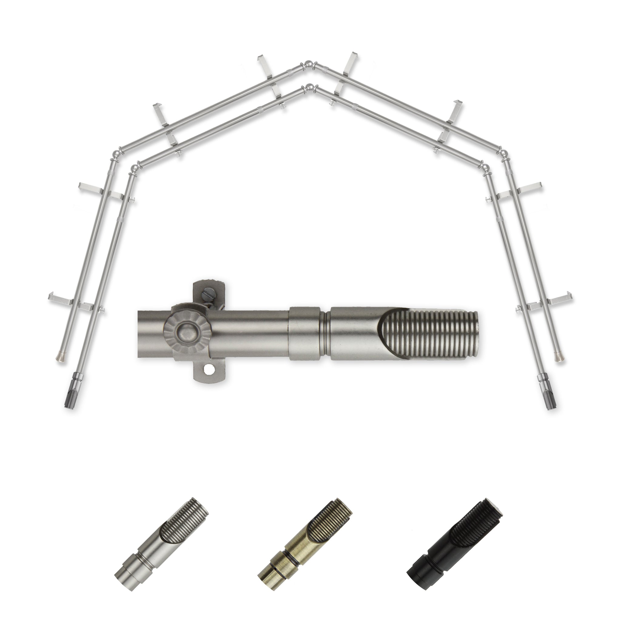 Includes eight 13/16" diameter adjustable poles, one pair of decorative finials, 8 double brackets, 6 corner connectors, and mounting hardware