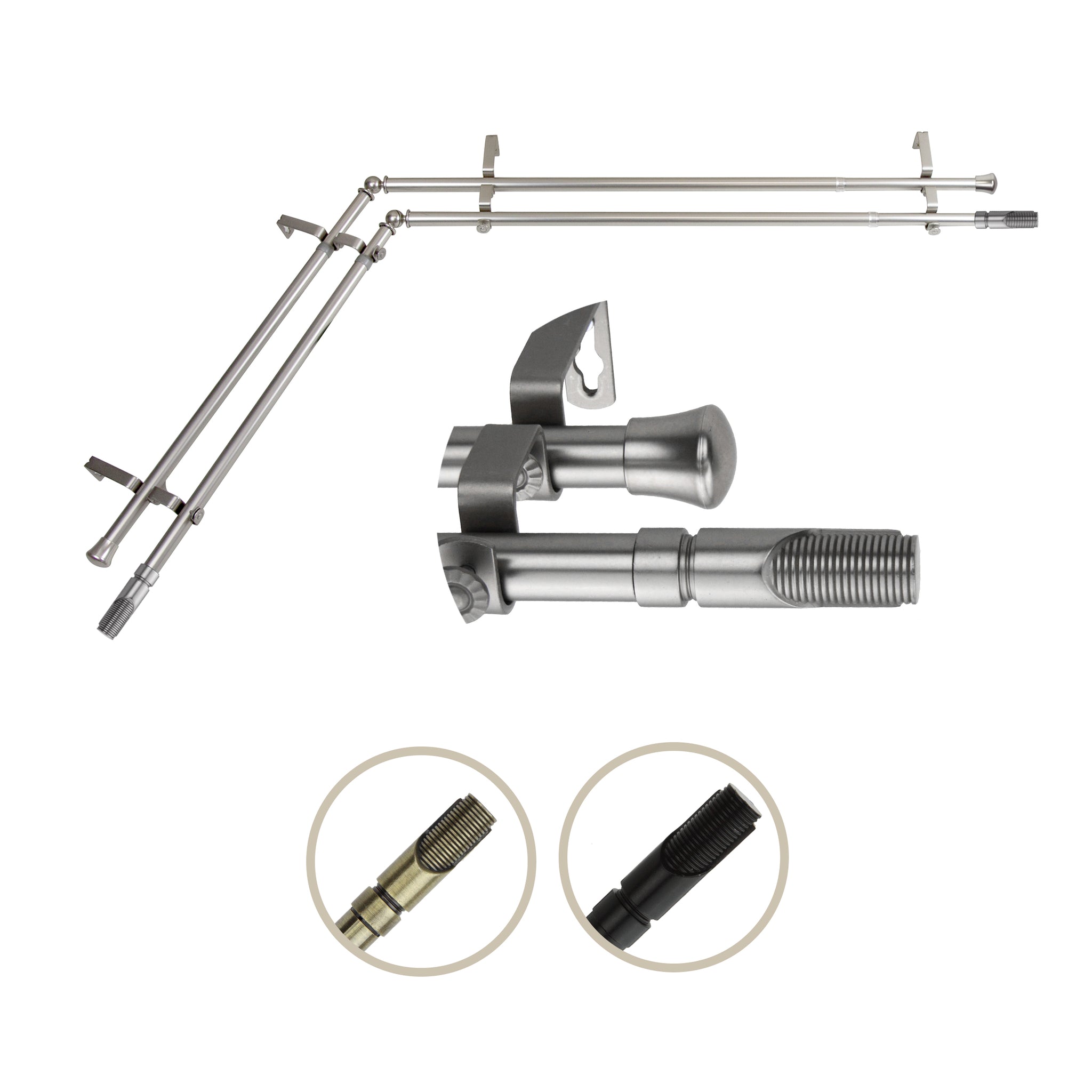 Includes four 13/16" diameter adjustable poles, one pair of decorative finials, one pair of end caps, two corner connectors, brackets, and mounting hardware