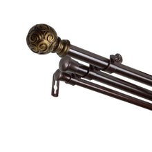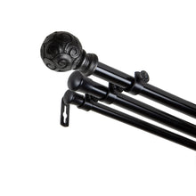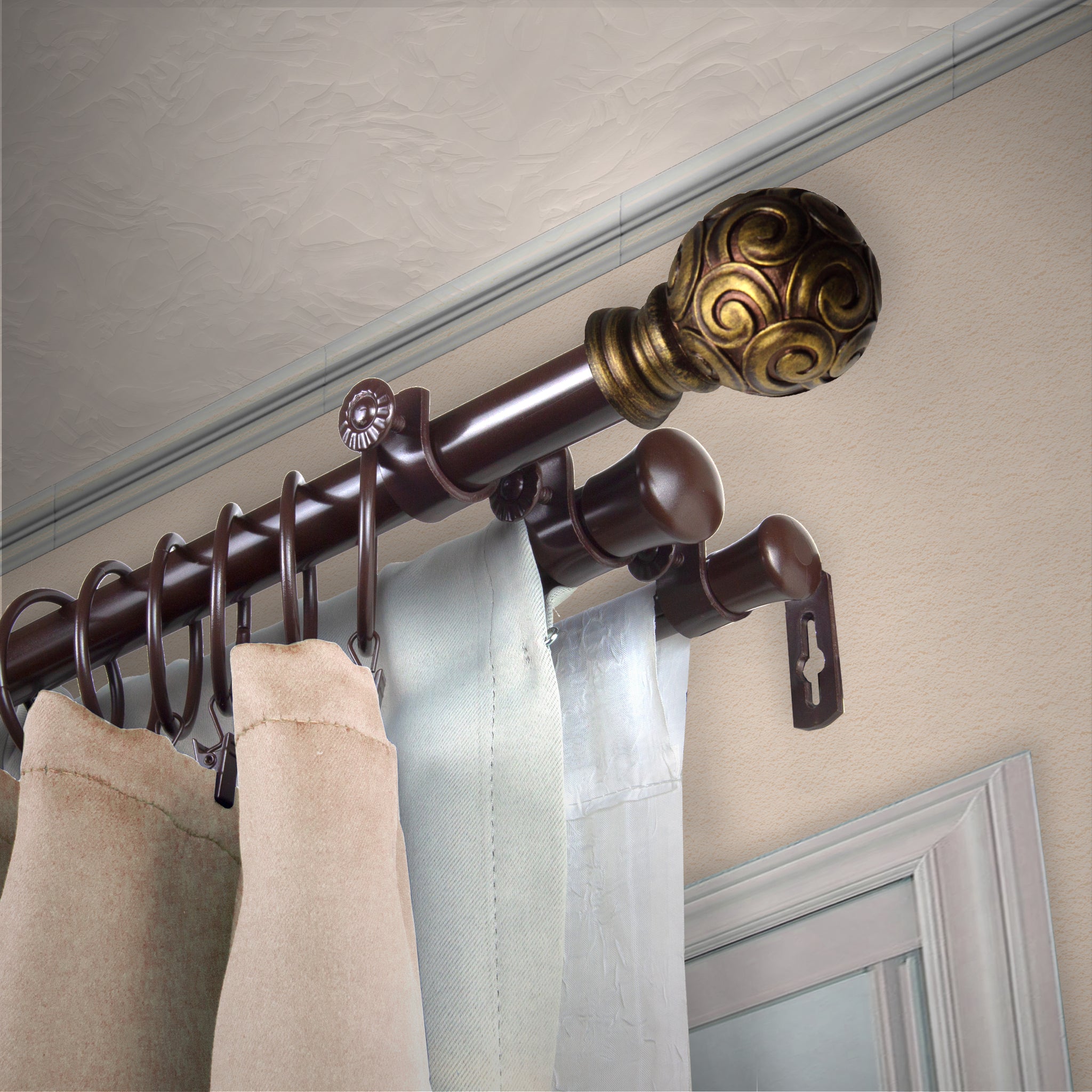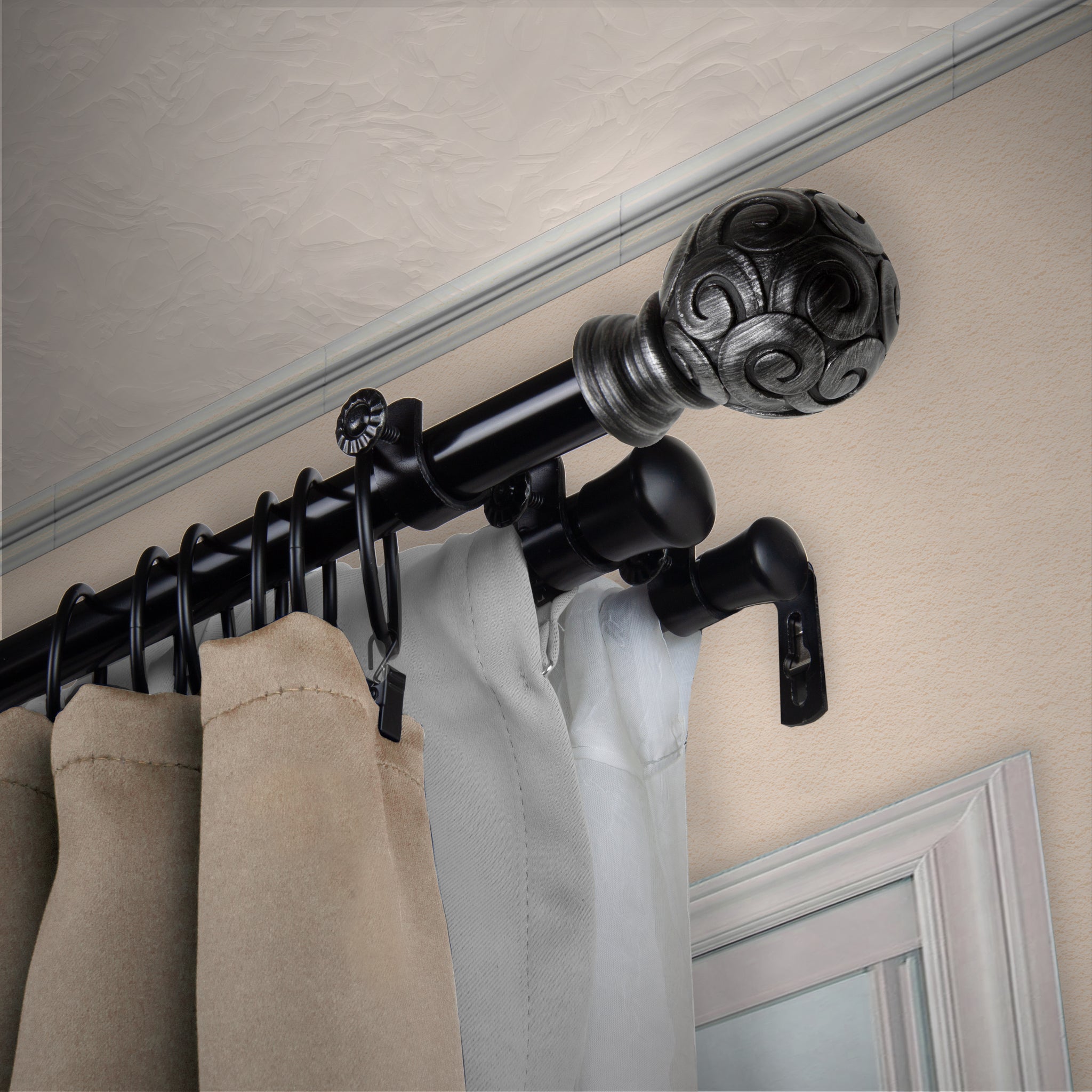 Includes two 13/16" adjustable curtain rods, one 5/8" adjustable back rod, two finials, brackets, and mounting hardware
