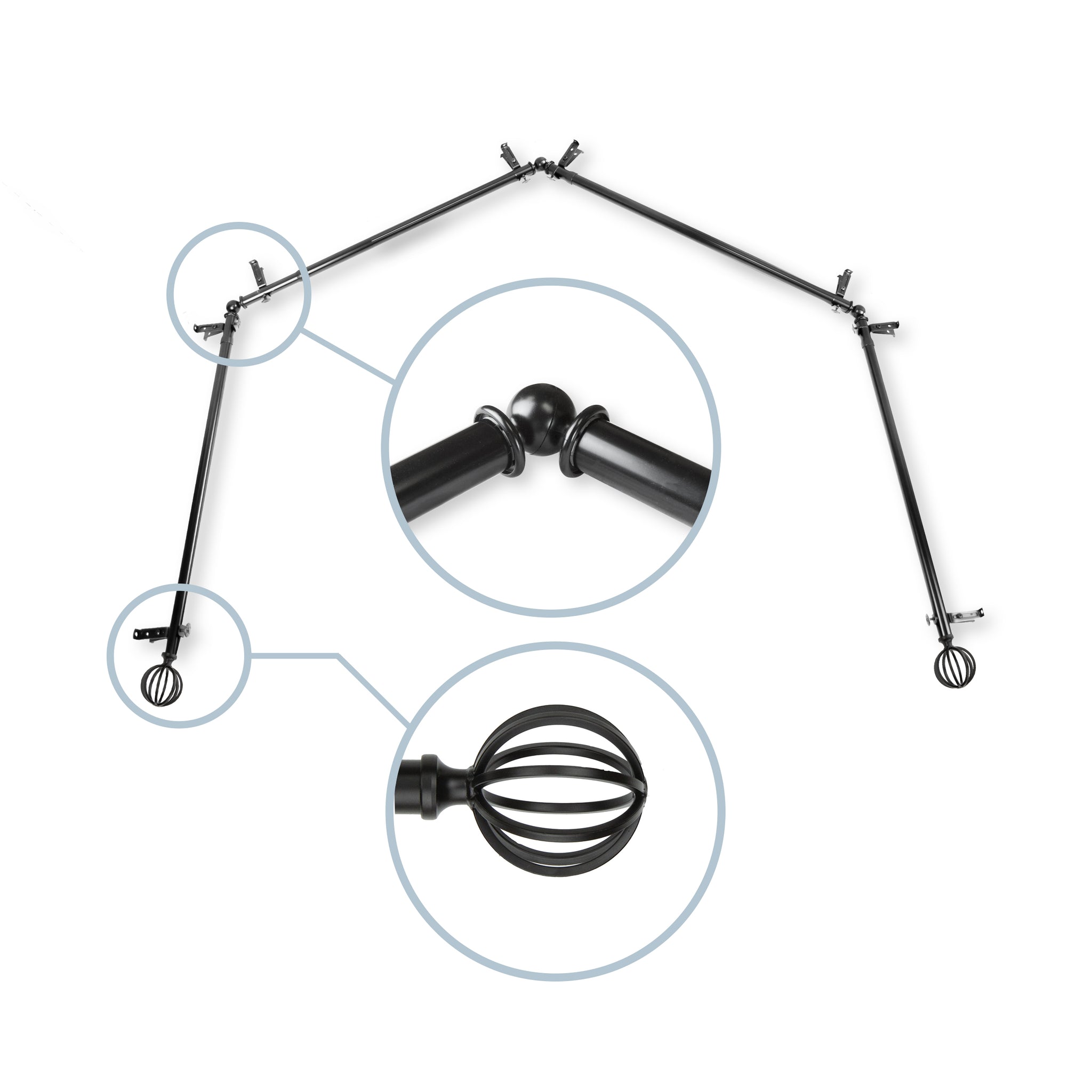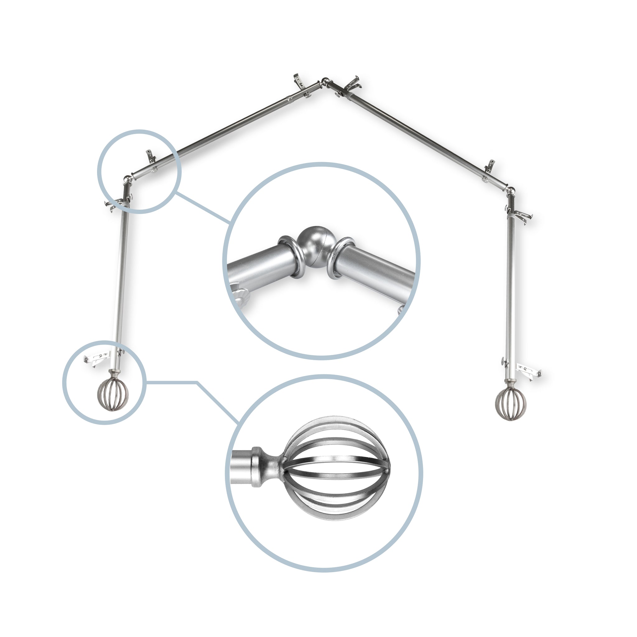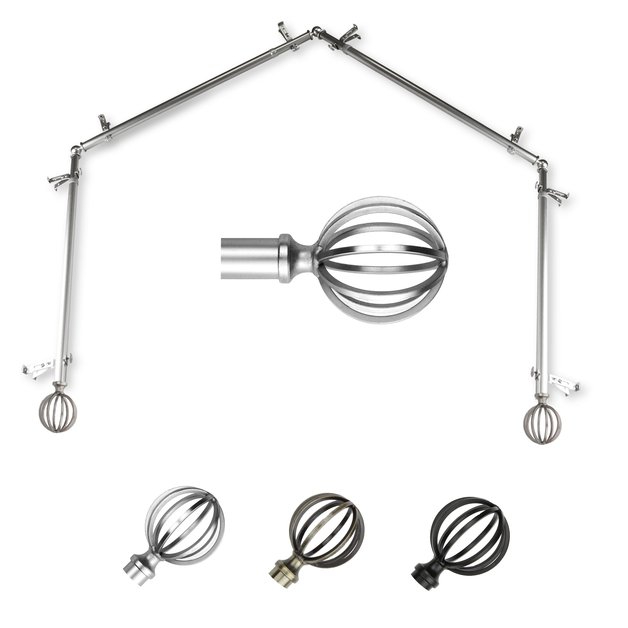 Includes four 13/16" diameter adjustable poles, one pair of decorative finials, 8 single brackets, 3 corner connectors, and mounting hardware