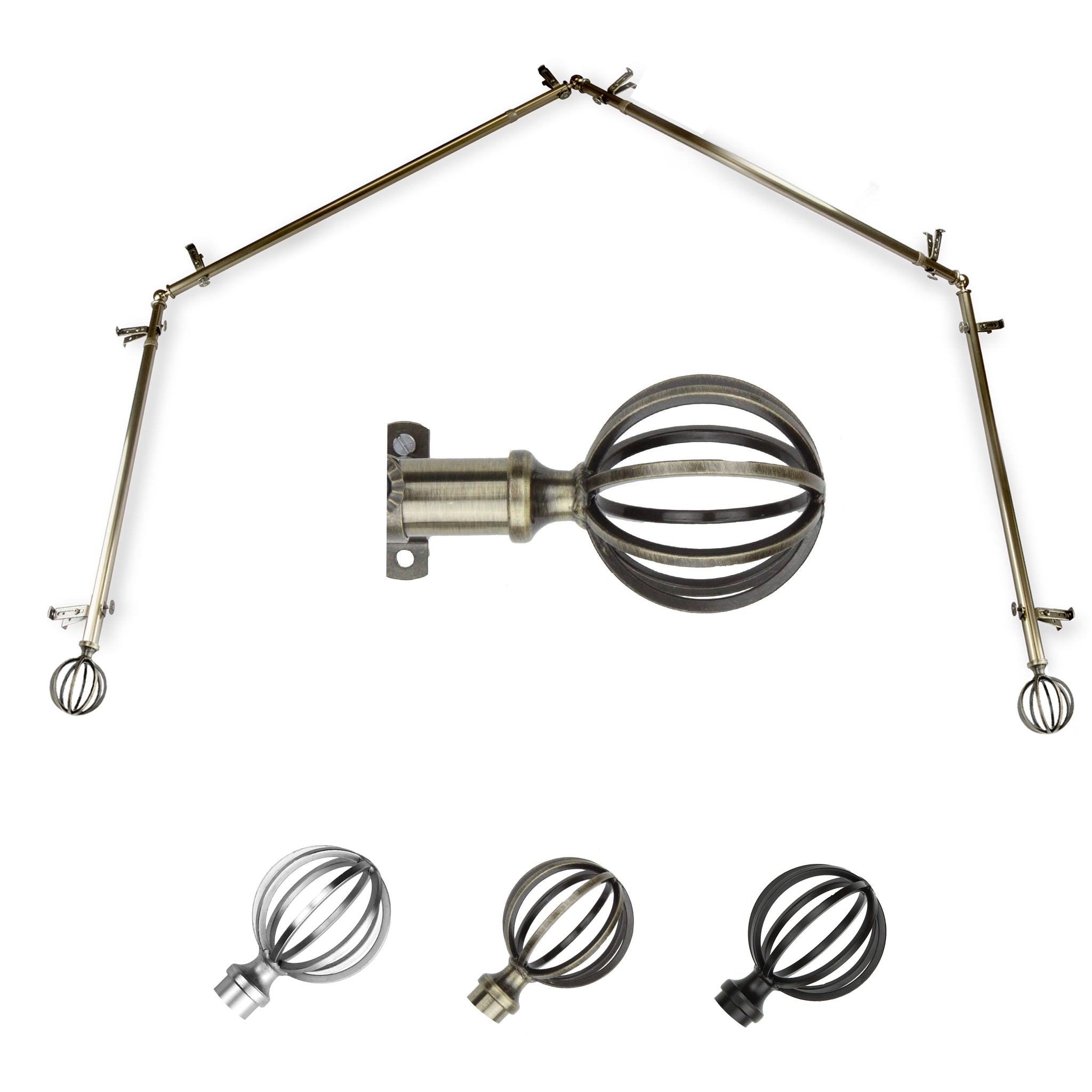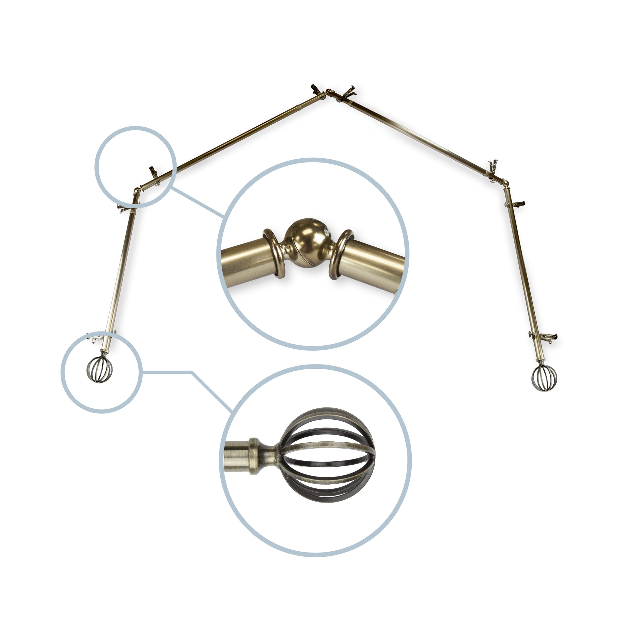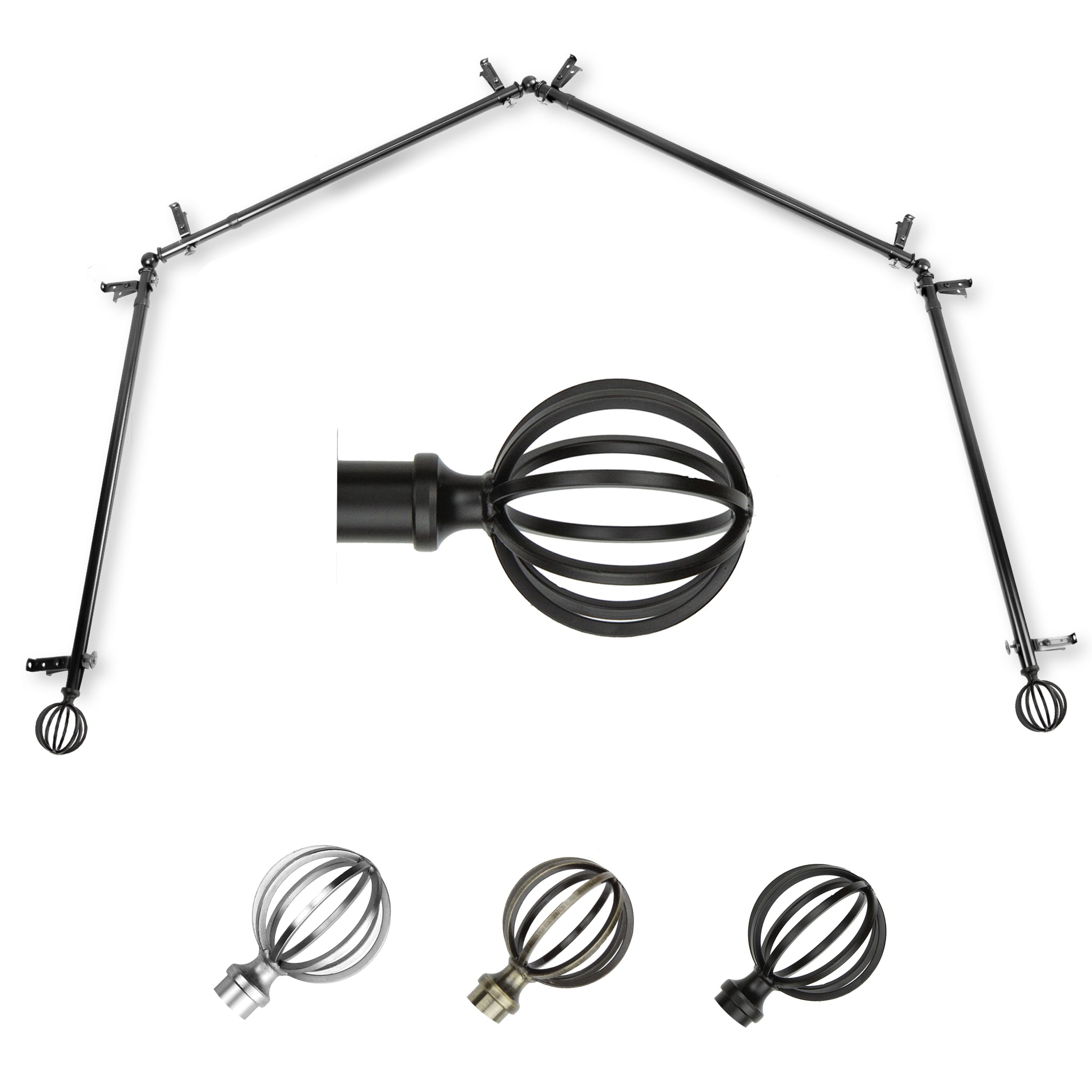 Includes four 13/16" diameter adjustable poles, one pair of decorative finials, 8 single brackets, 3 corner connectors, and mounting hardware