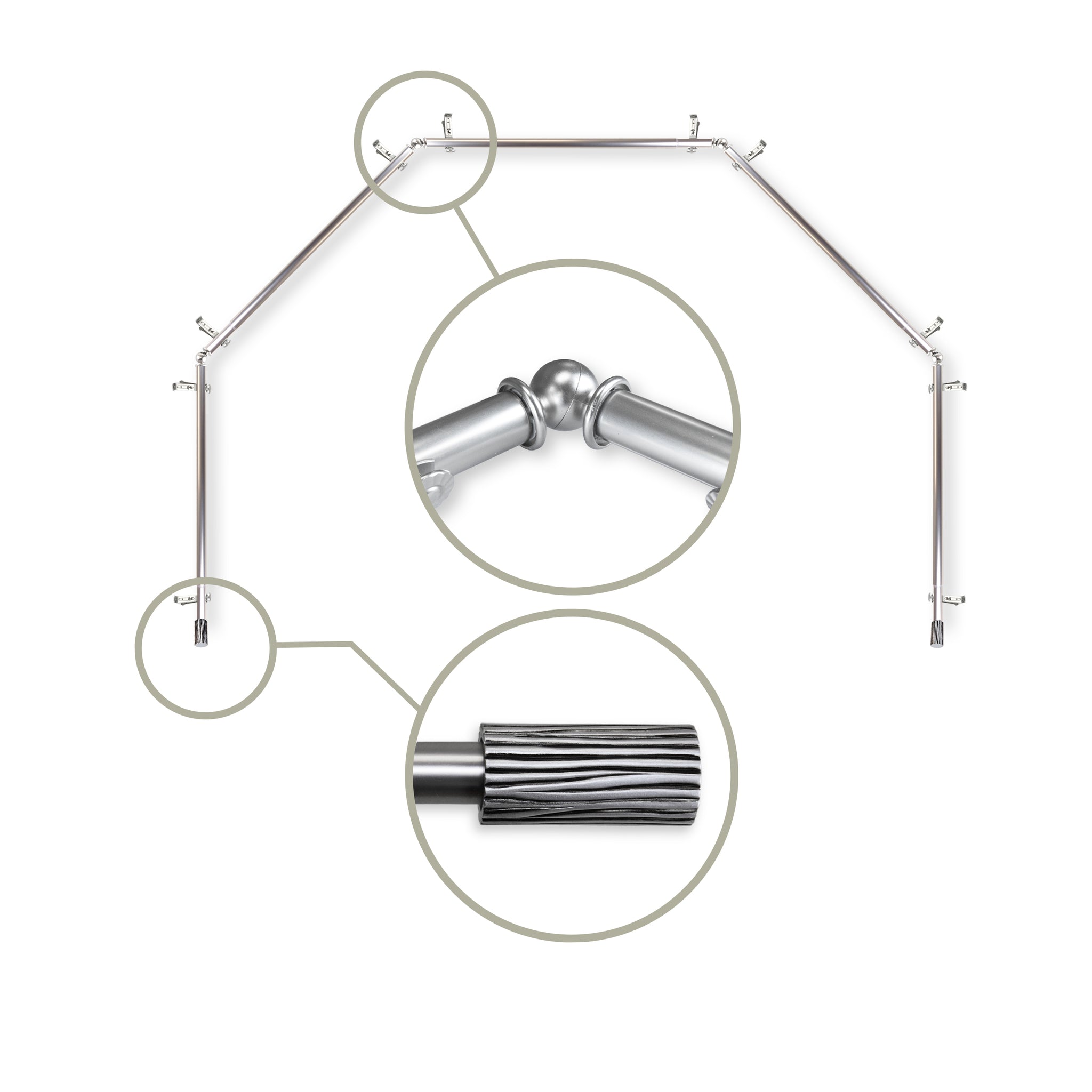 Includes five 13/16" diameter adjustable poles, one pair of decorative finials, 10 single brackets, 4 corner connectors, and mounting hardware