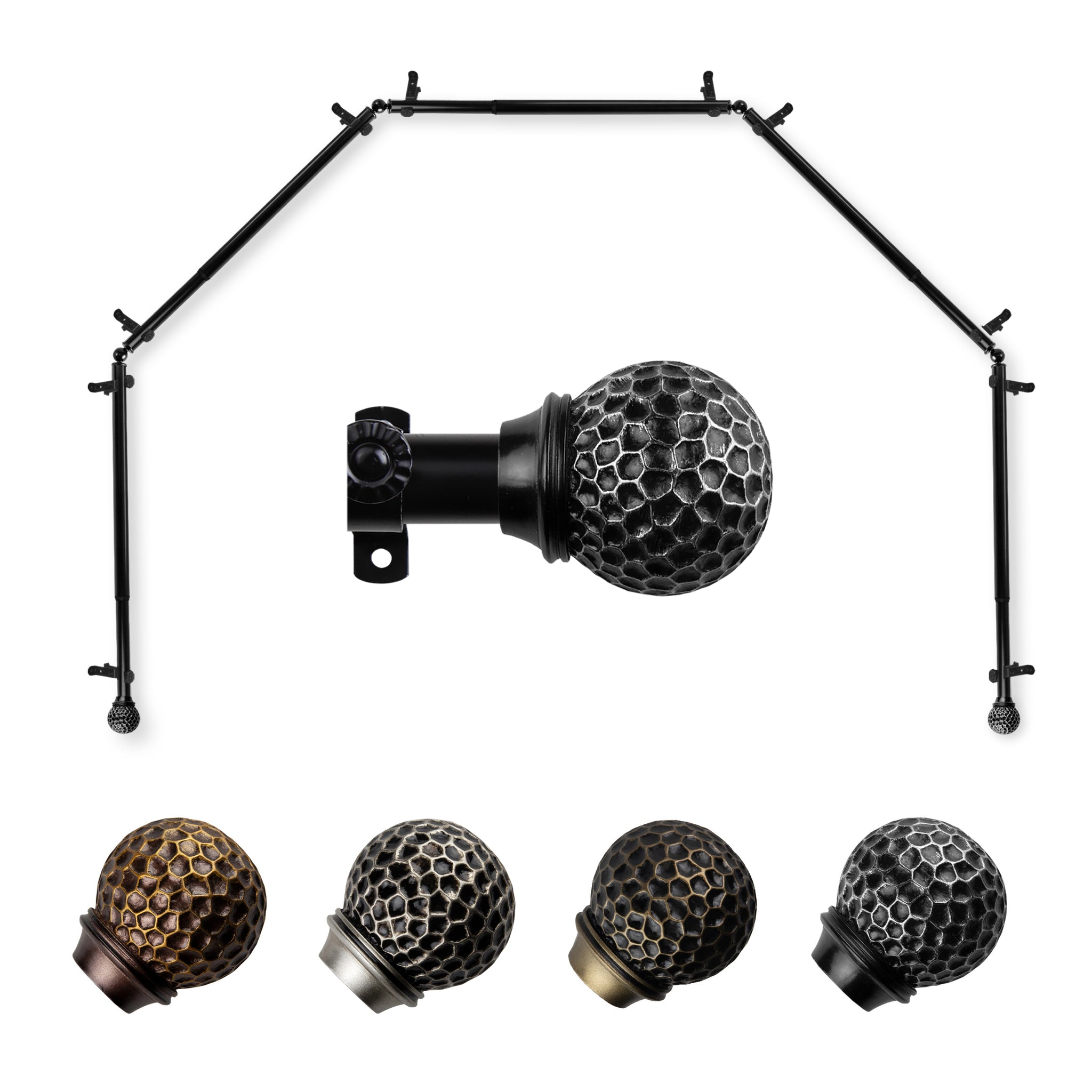 Includes five 13/16" diameter adjustable poles, one pair of decorative finials, 10 single brackets, 4 corner connectors, and mounting hardware