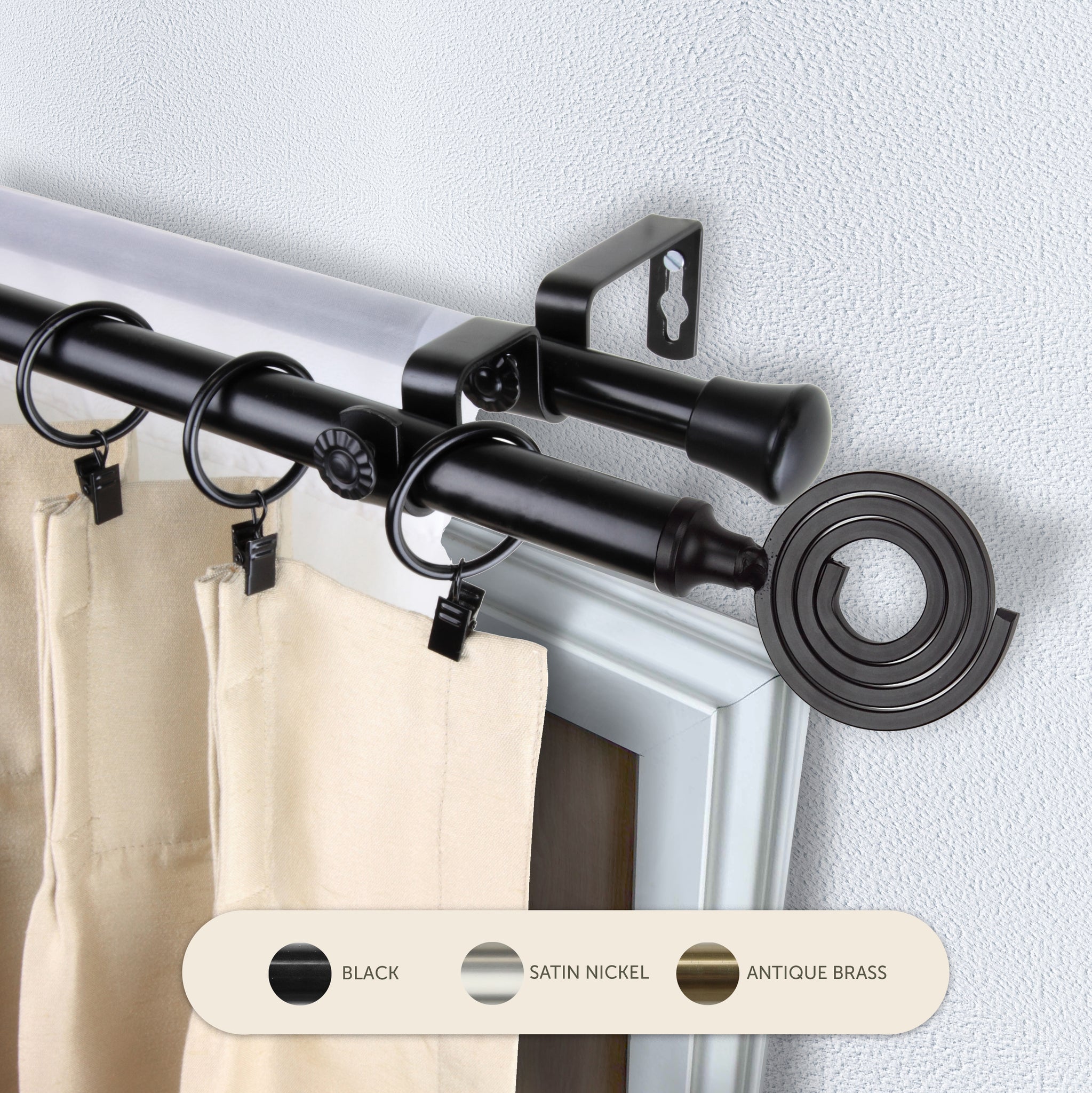 Includes two 13/16" adjustable high-quality steel telescoping poles, two finials, double brackets, and mounting hardware