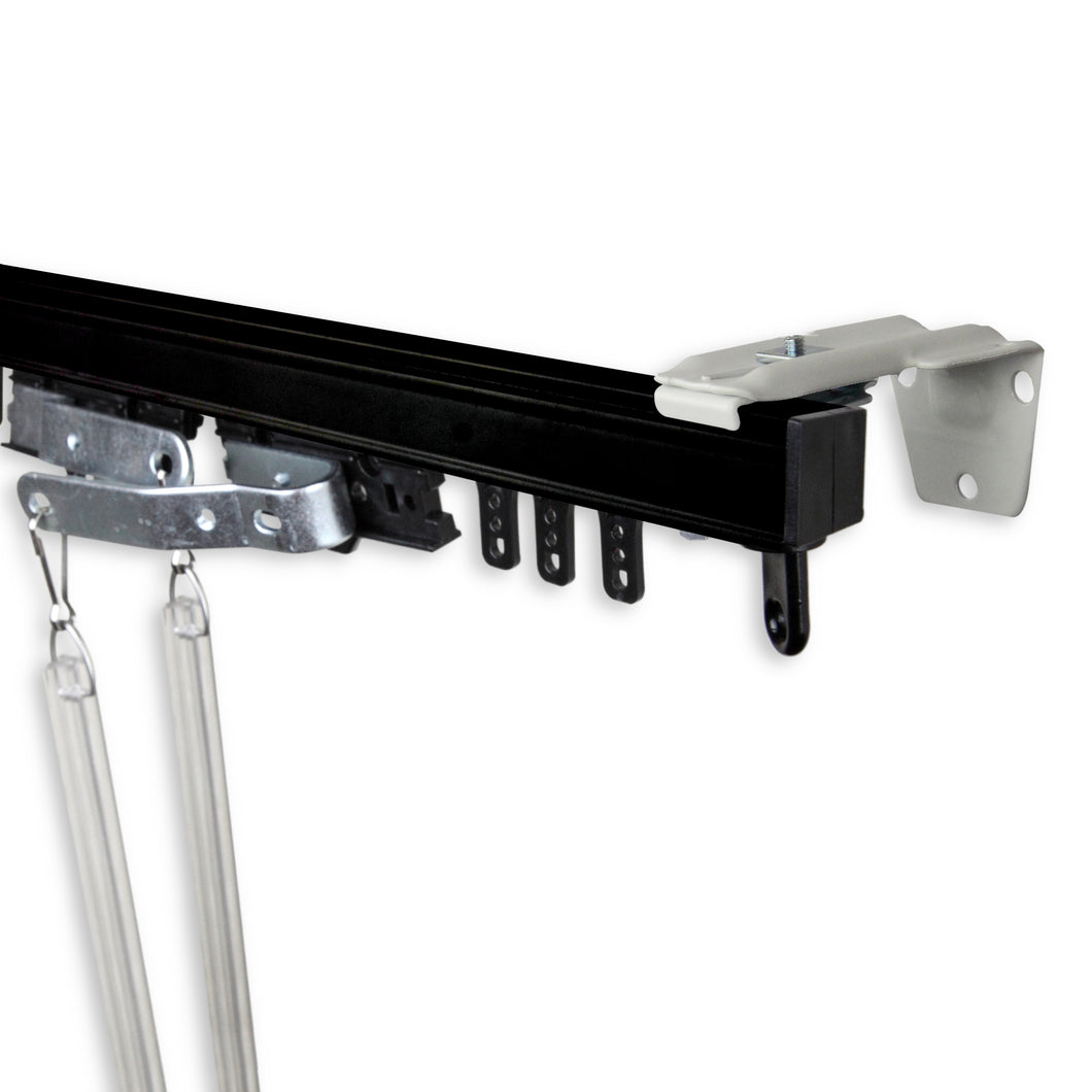 Includes one 3/4 inch tall and 1-1/8 inch wide aluminum ceiling track, one pair of master carrier, 2 batons, 2 metal end stops, sliders, mounting brackets, and mounting hardware