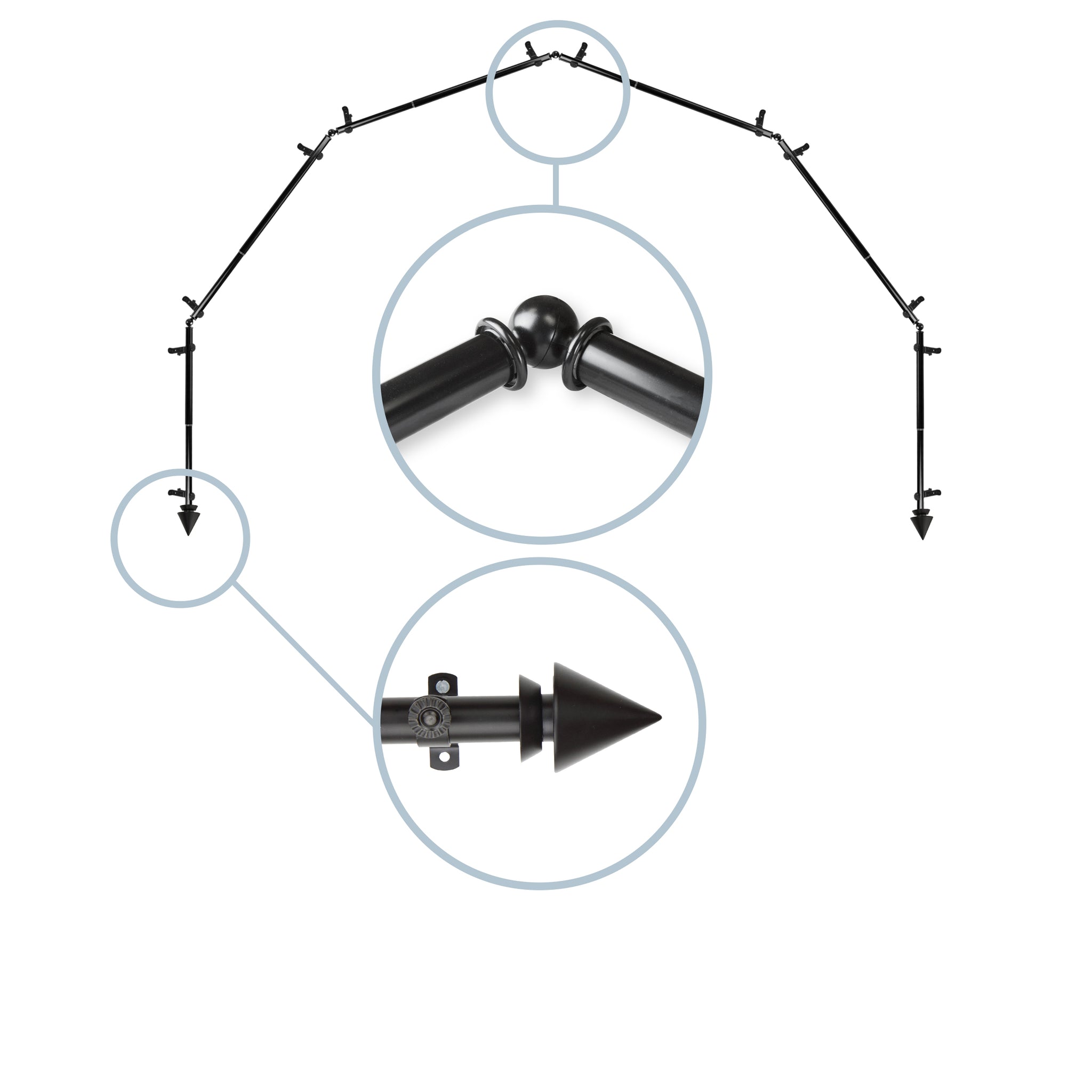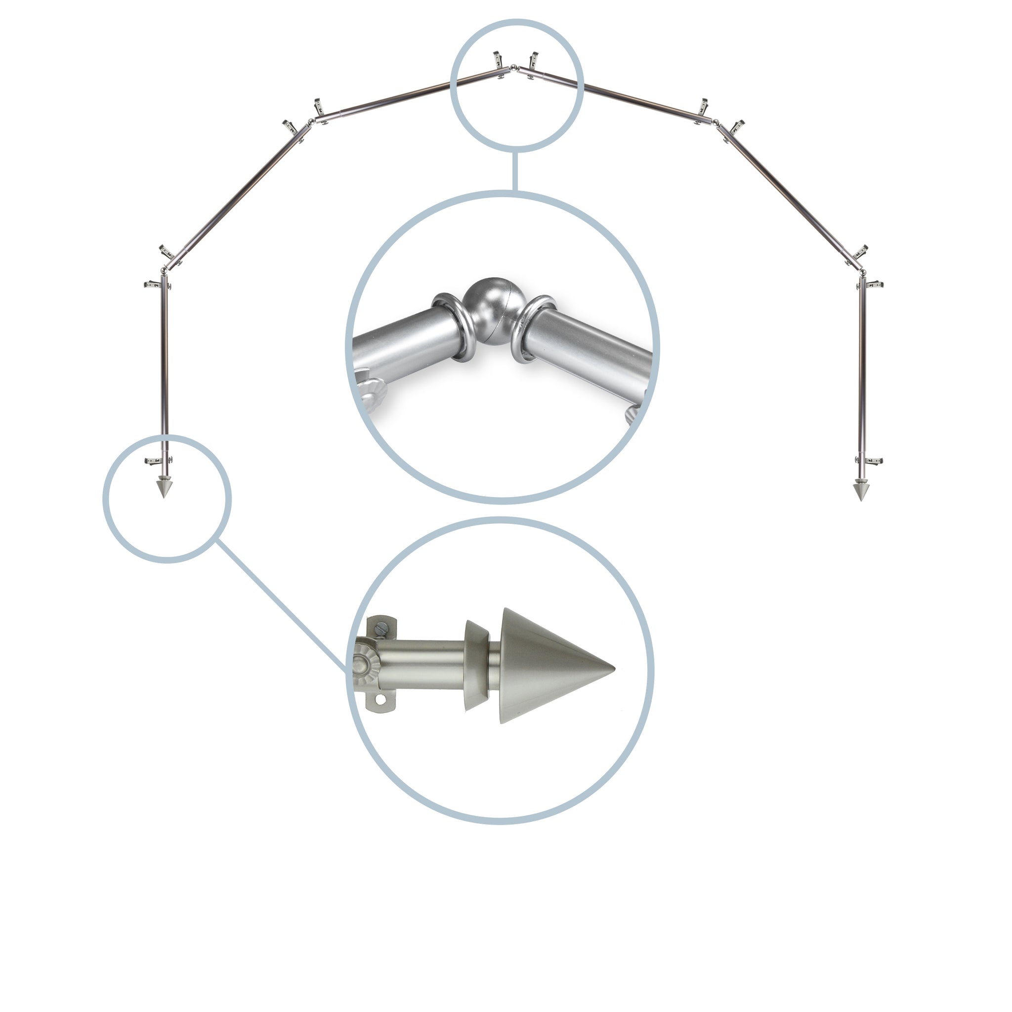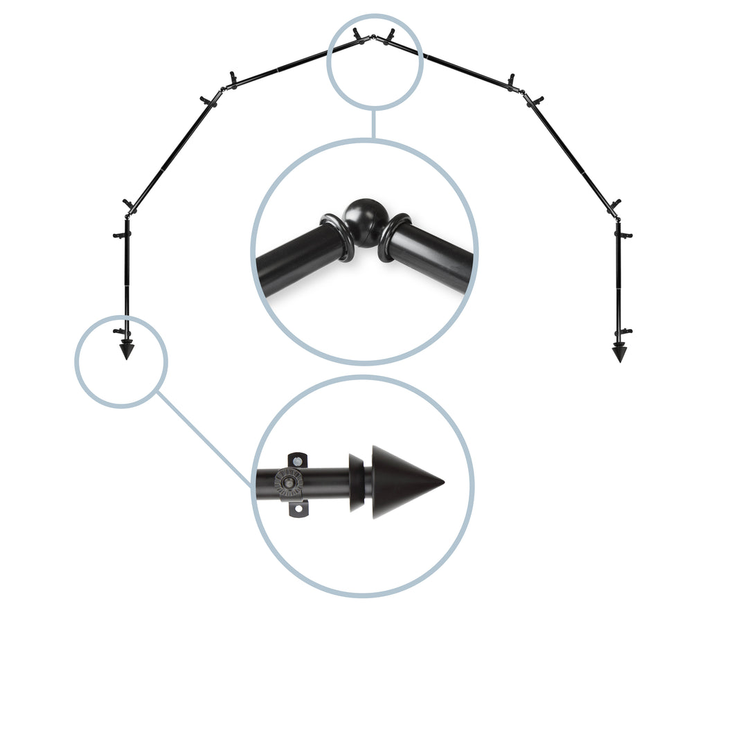 Includes six 13/16" diameter adjustable poles, one pair of decorative finials, 12 single brackets, 5 corner connectors, and mounting hardware