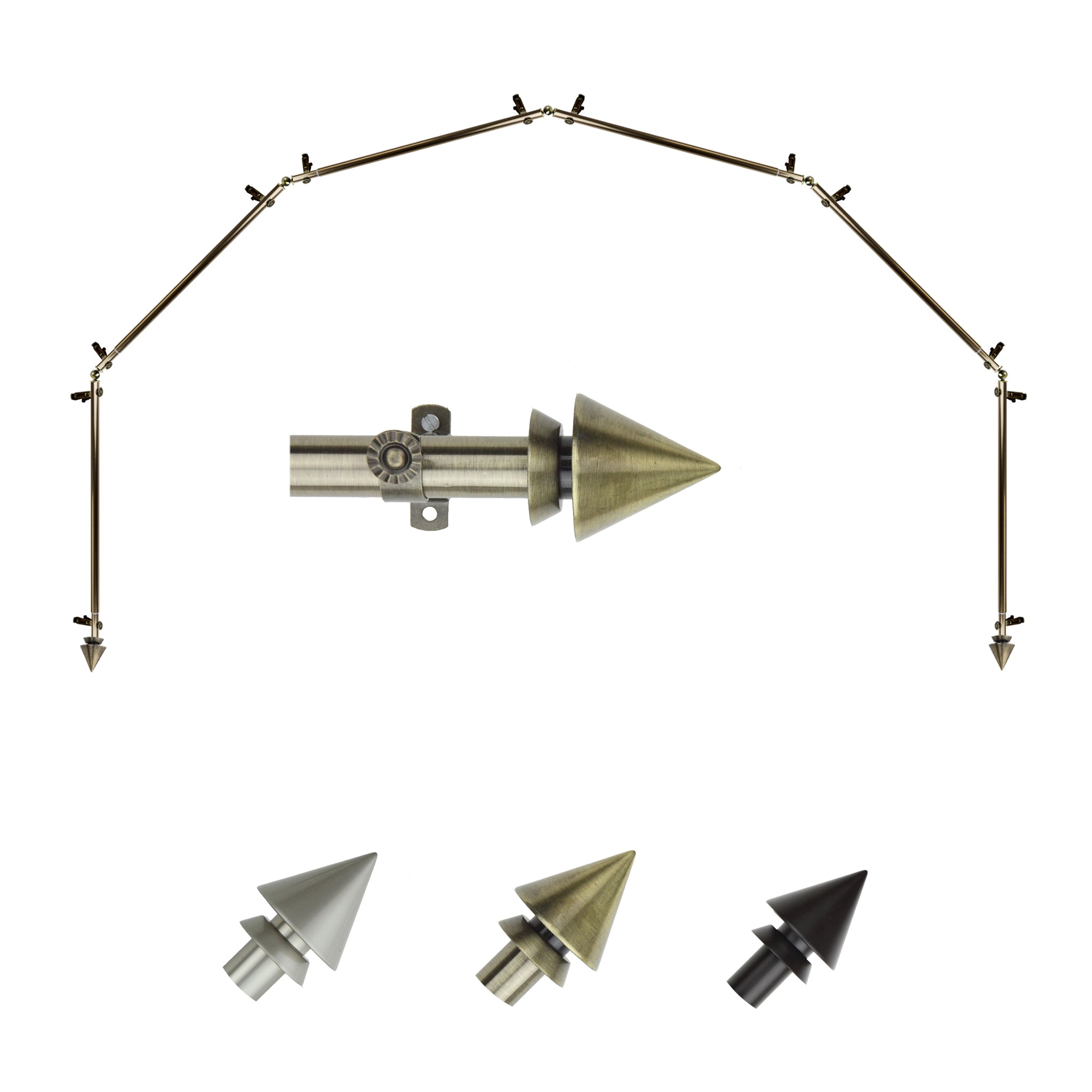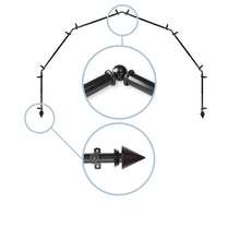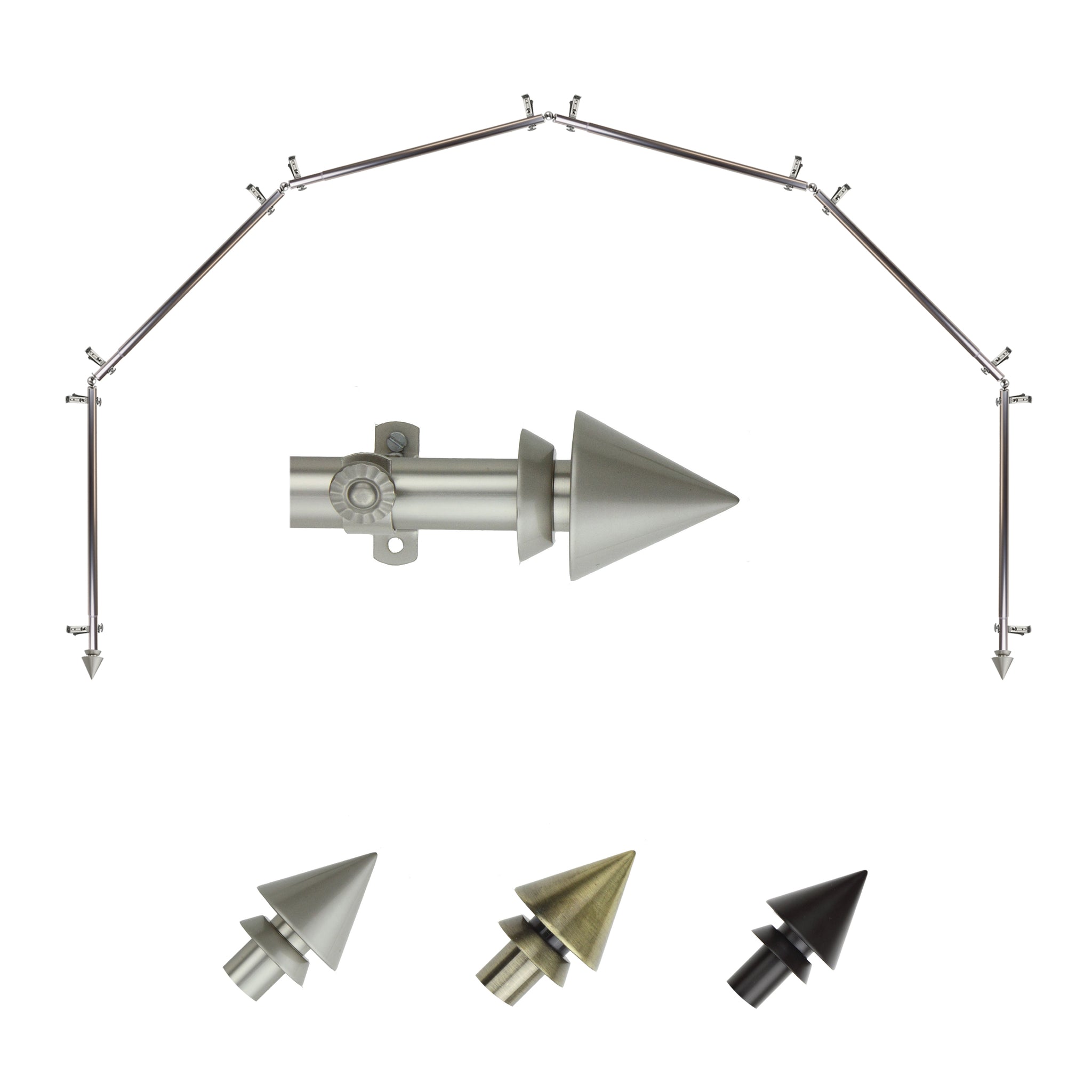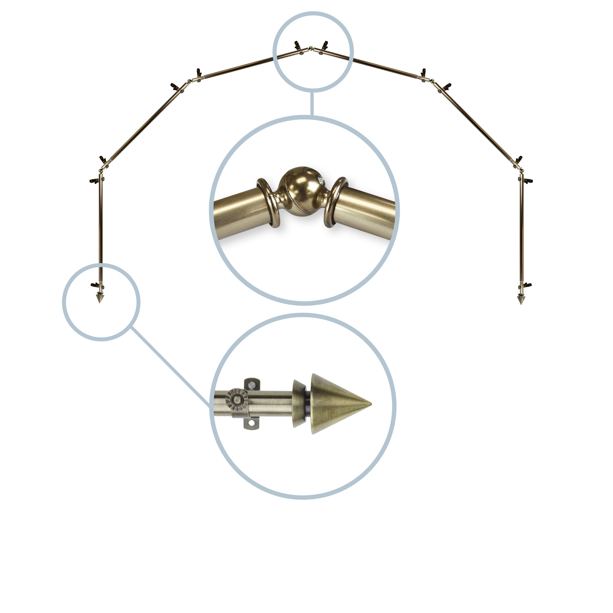 Includes six 13/16" diameter adjustable poles, one pair of decorative finials, 12 single brackets, 5 corner connectors, and mounting hardware