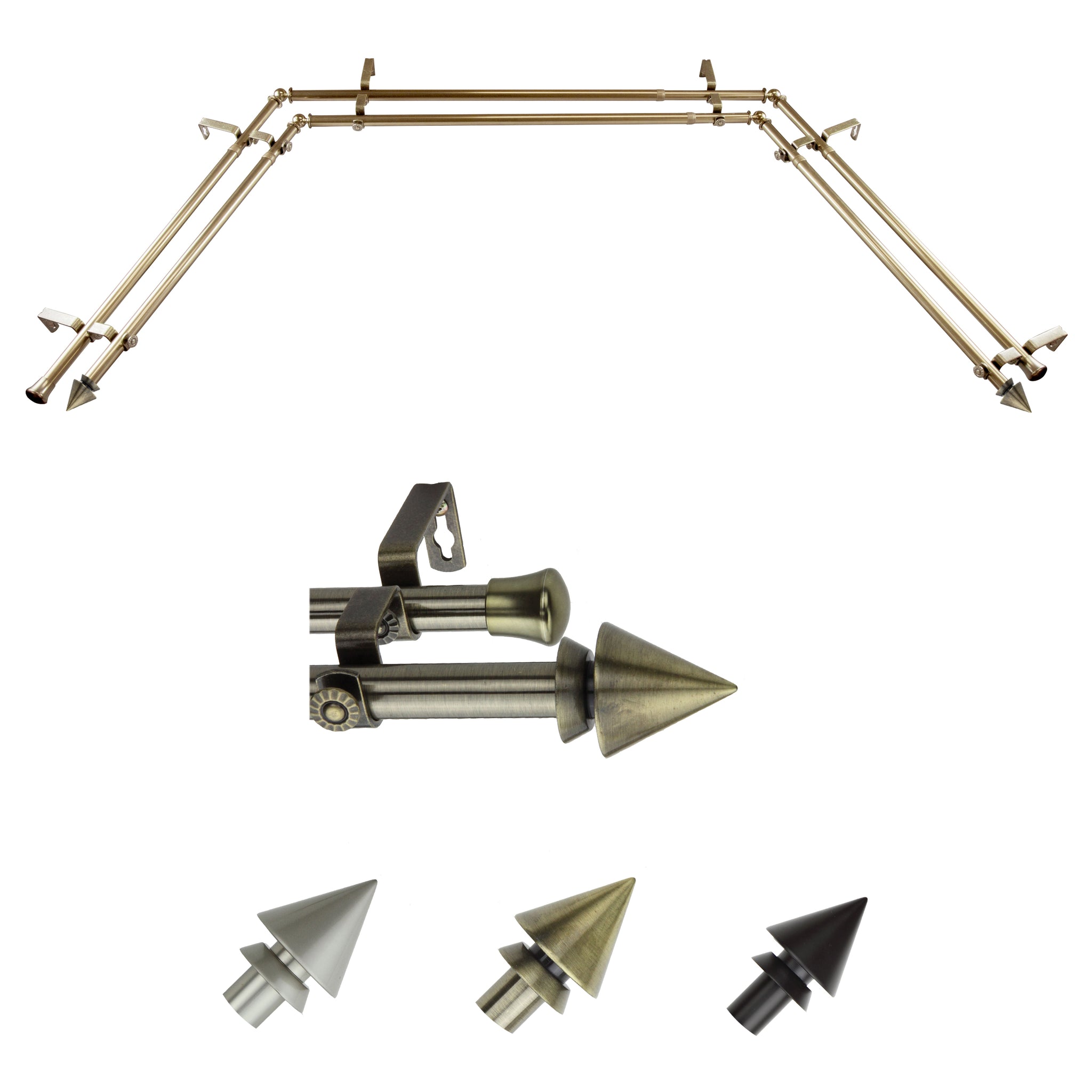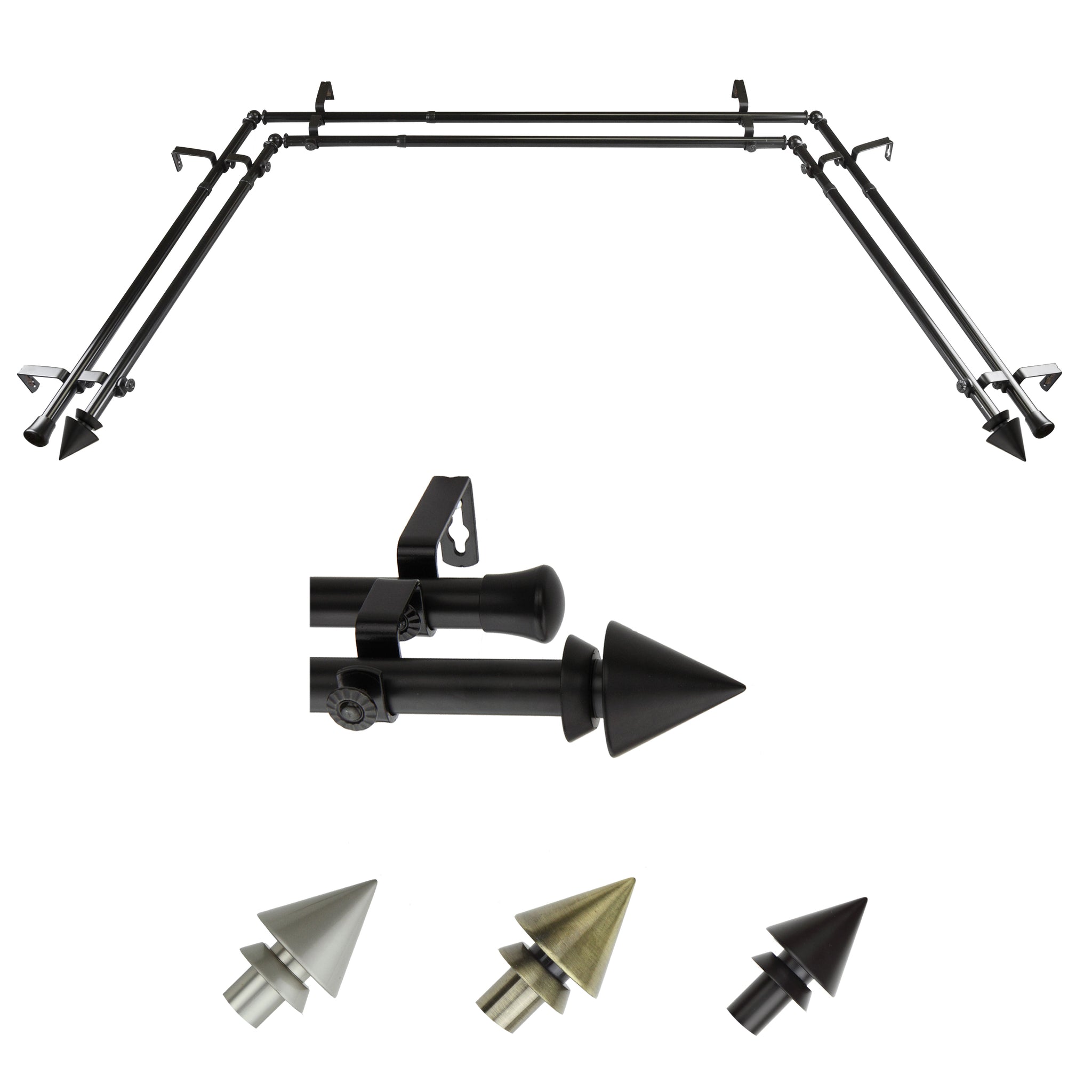 Includes four 13/16" diameter adjustable 20-36 inch poles, two adjustable 38-72 inch poles, one pair of finials, 6 brackets, 4 corner connectors, and mounting hardware