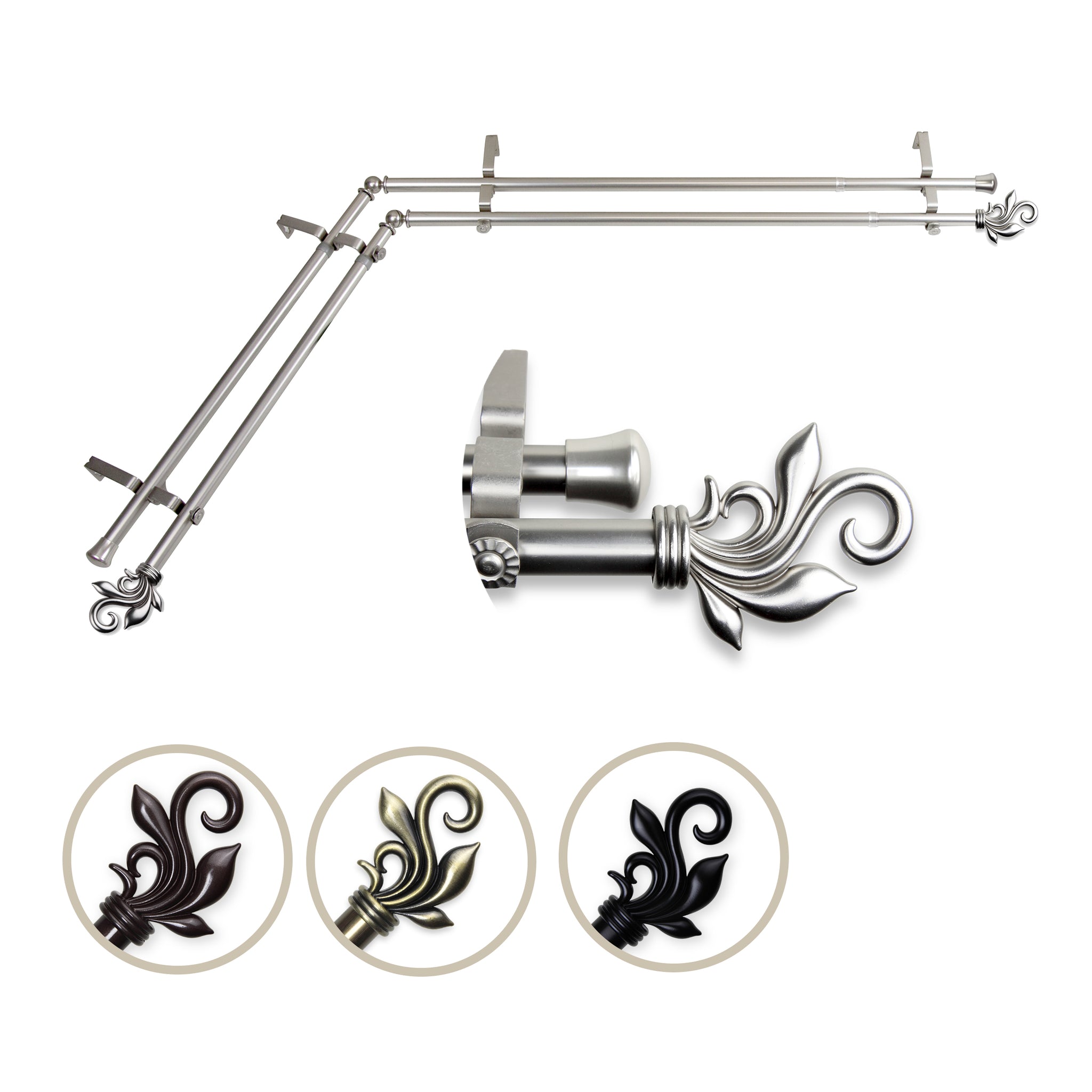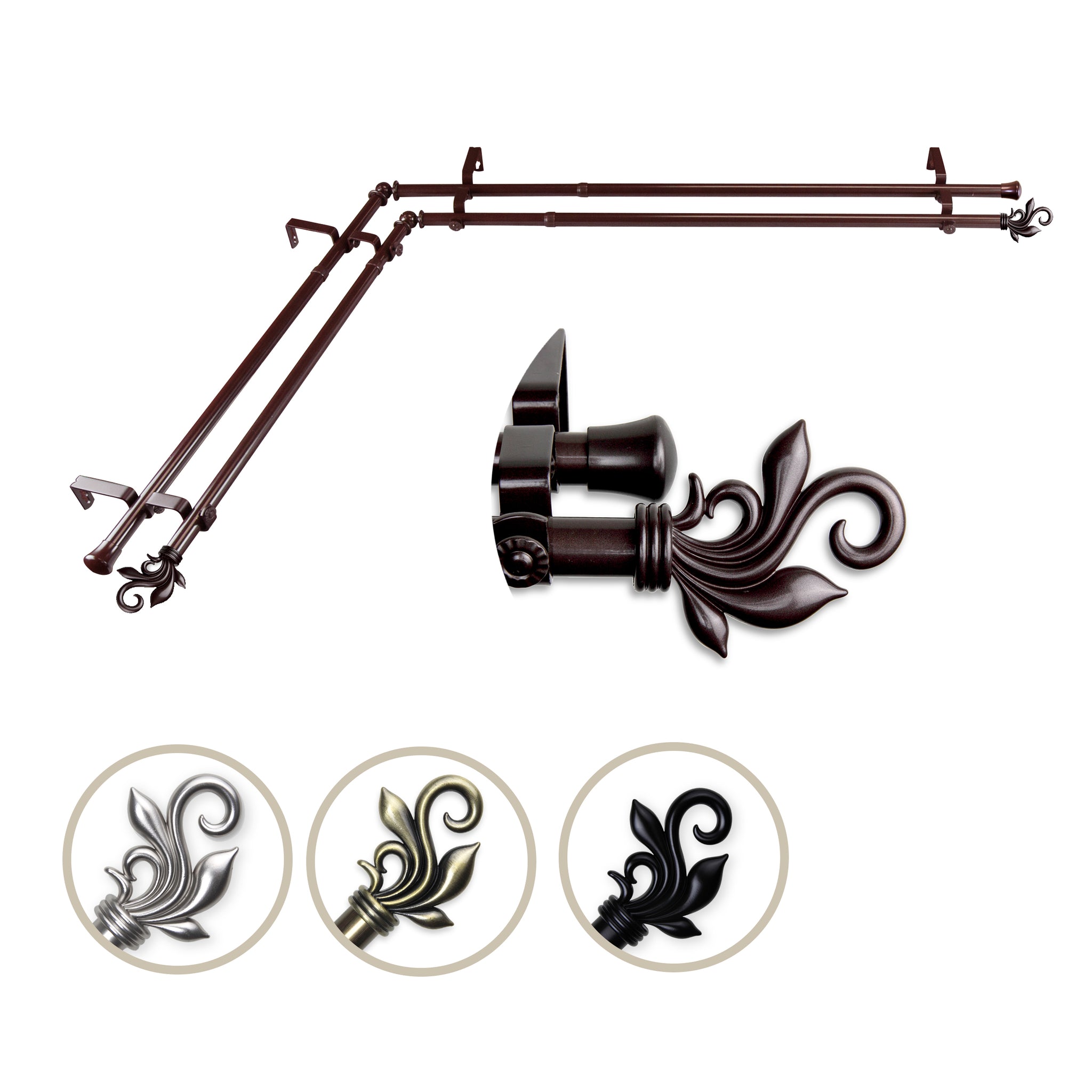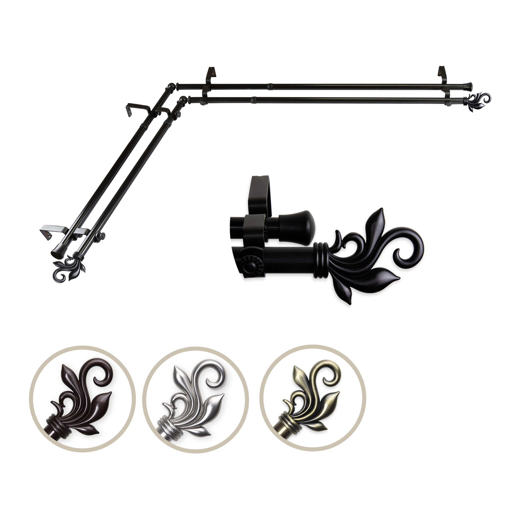 Includes four 13/16" diameter adjustable poles, one pair of decorative finials, one pair of end caps, two corner connectors, brackets, and mounting hardware