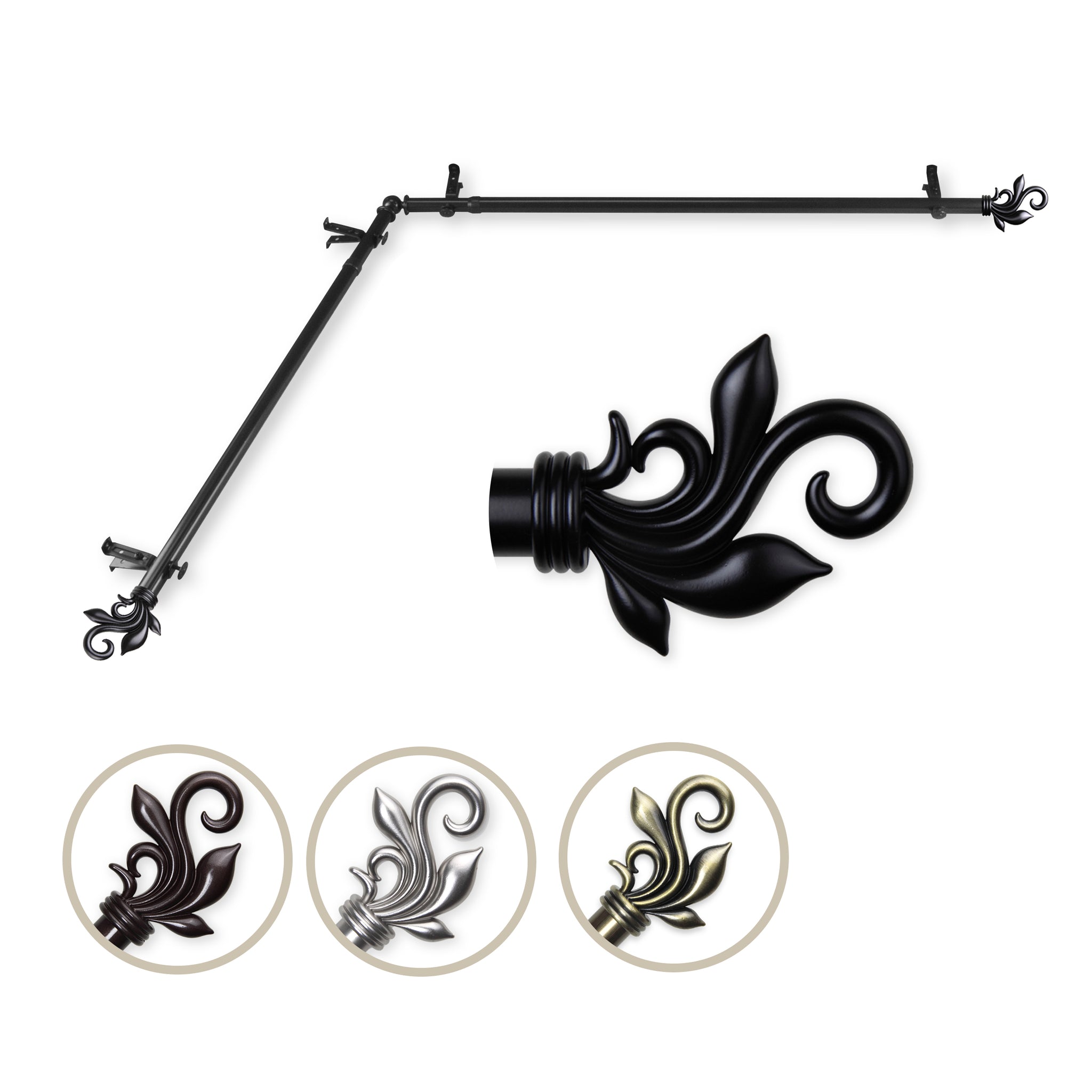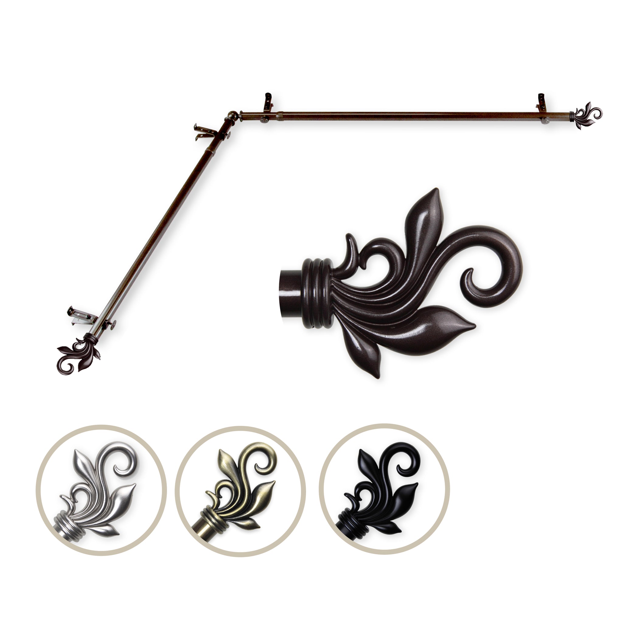 Includes two 13/16" diameter adjustable poles, one pair of decorative finials, one corner connector, brackets and mounting hardware