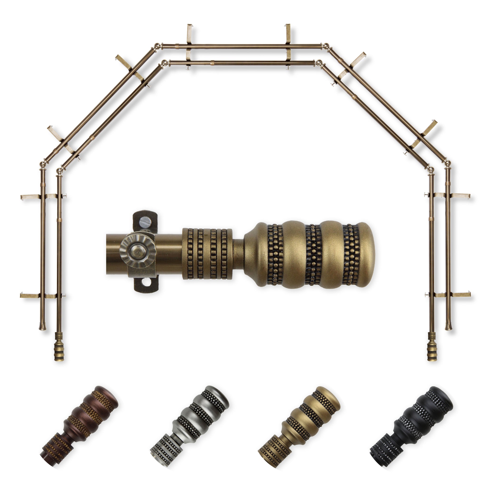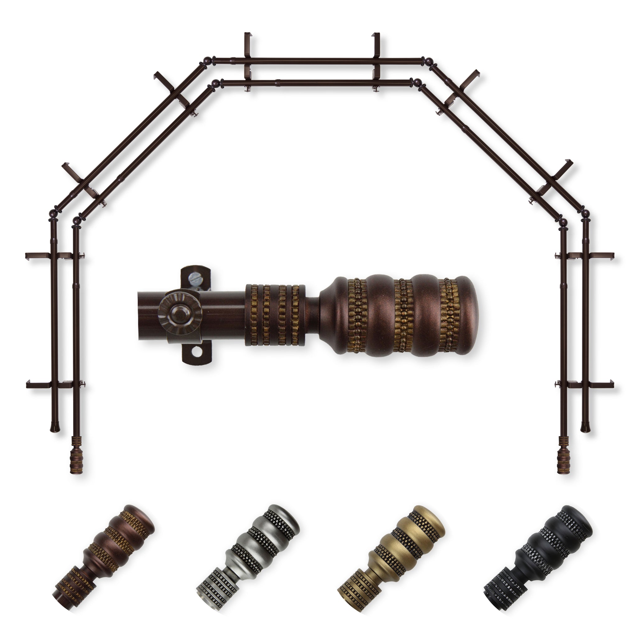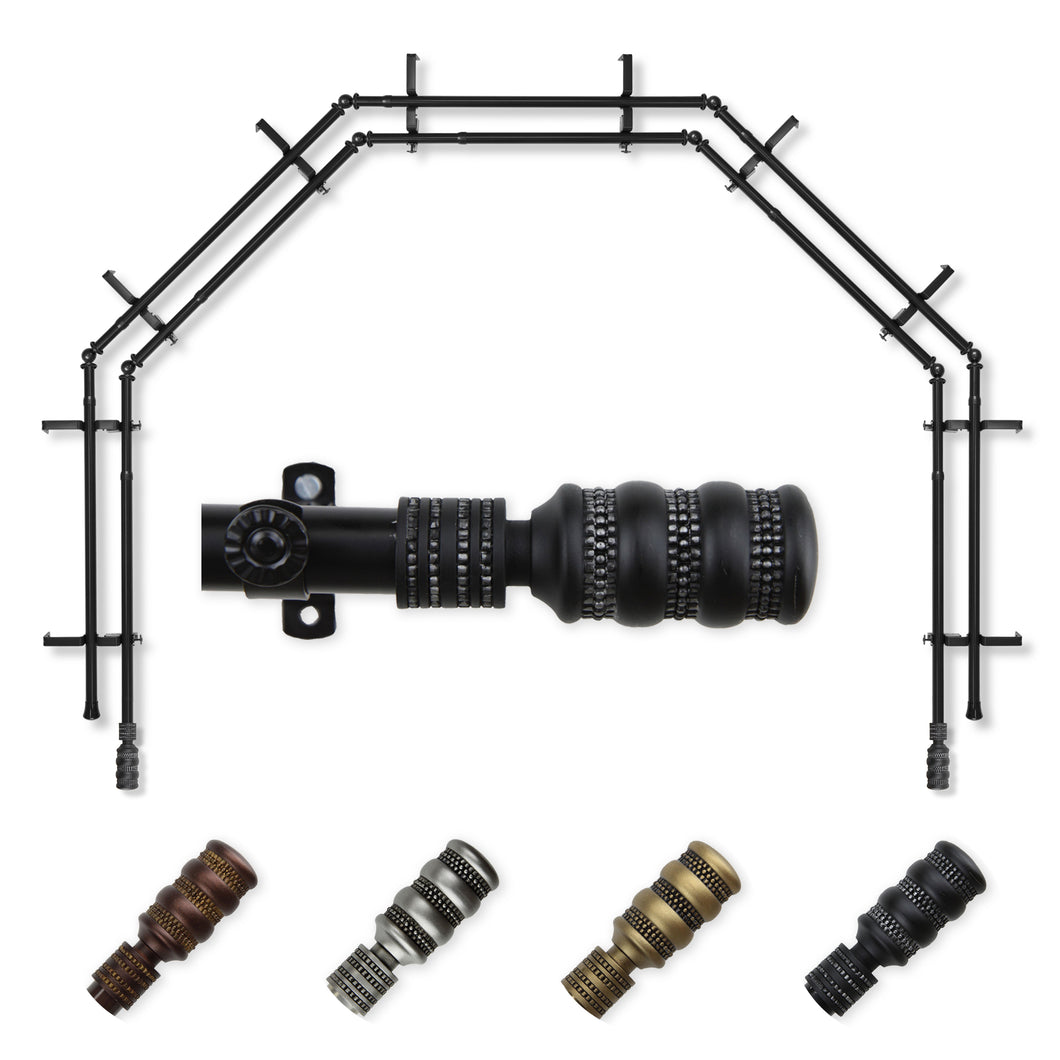 Includes ten 13/16" diameter adjustable poles, one pair of decorative finials, 10 double brackets, 8 corner connectors, and mounting hardware
