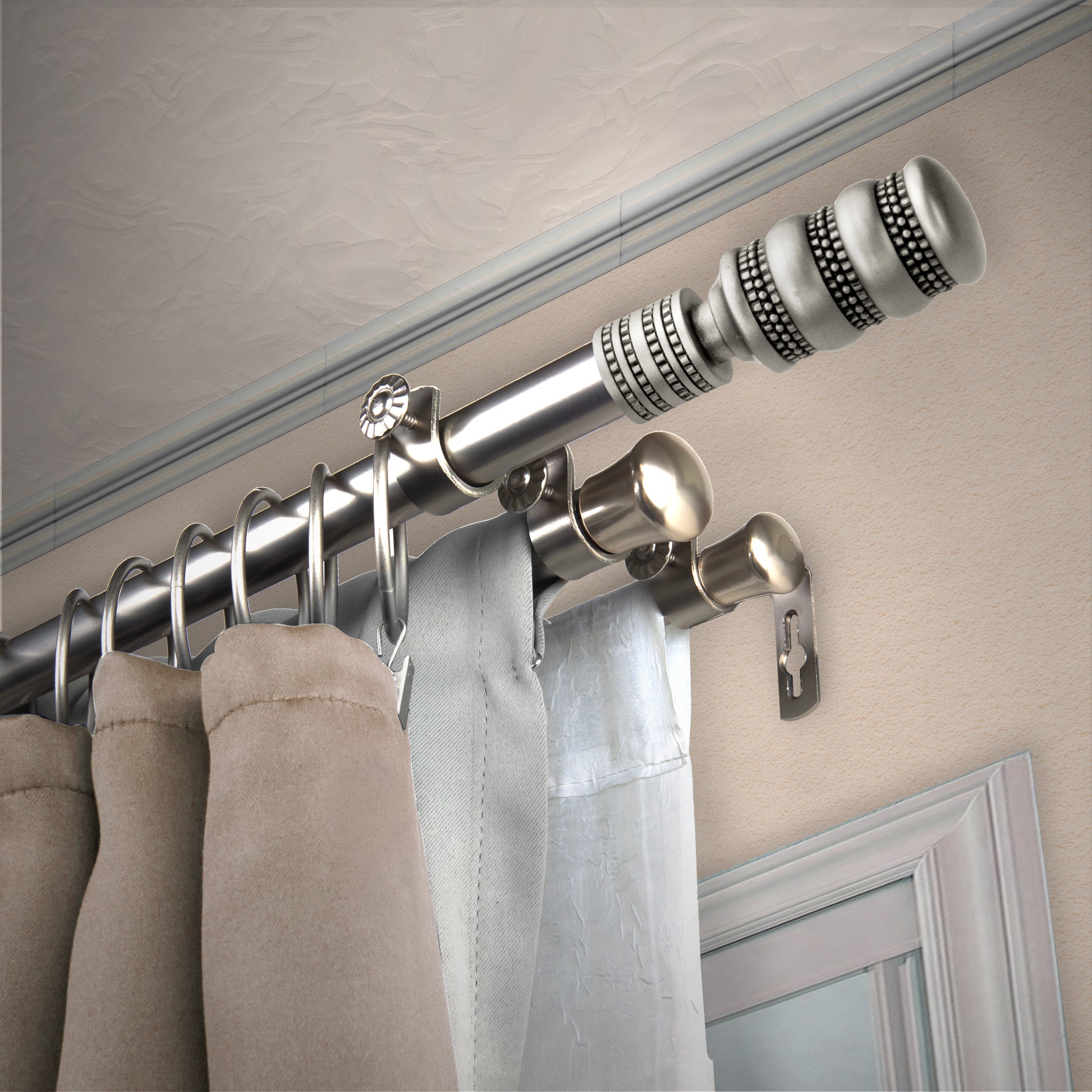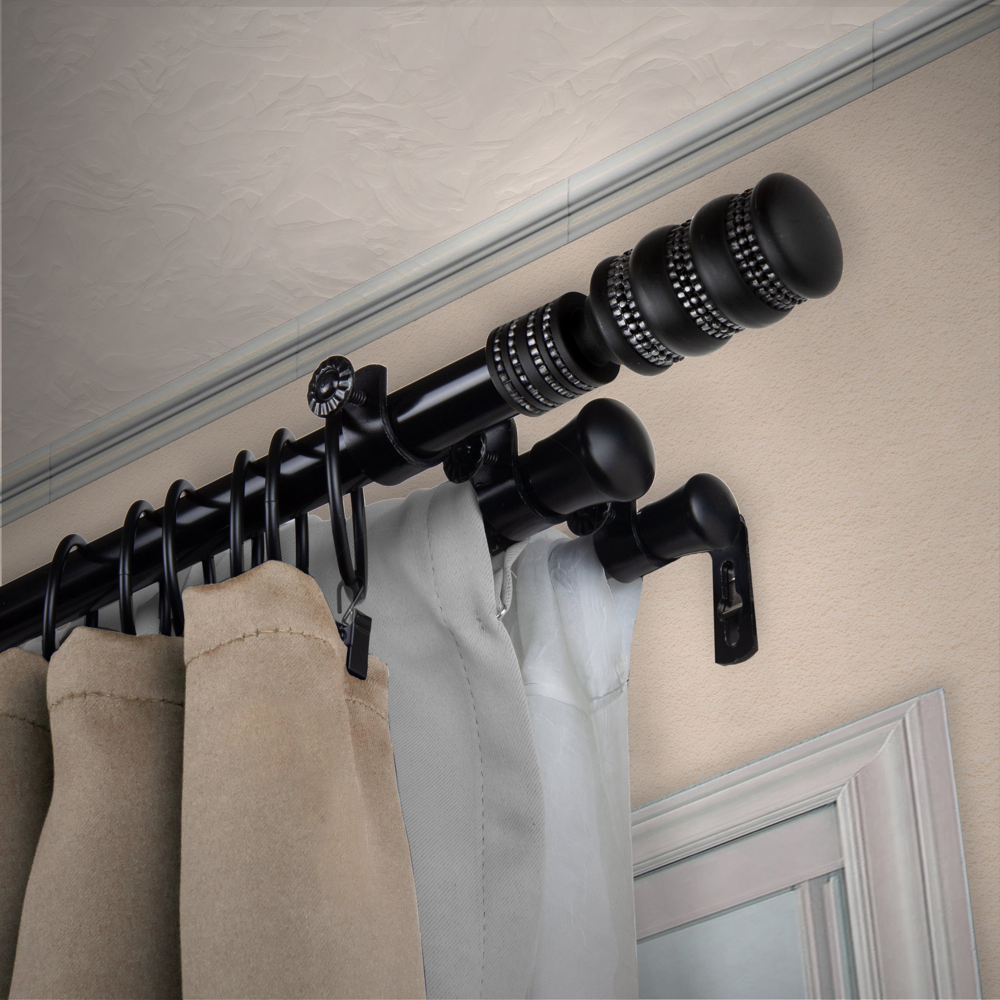 Includes two 13/16" adjustable curtain rods, one 5/8" adjustable back rod, two finials, brackets, and mounting hardware