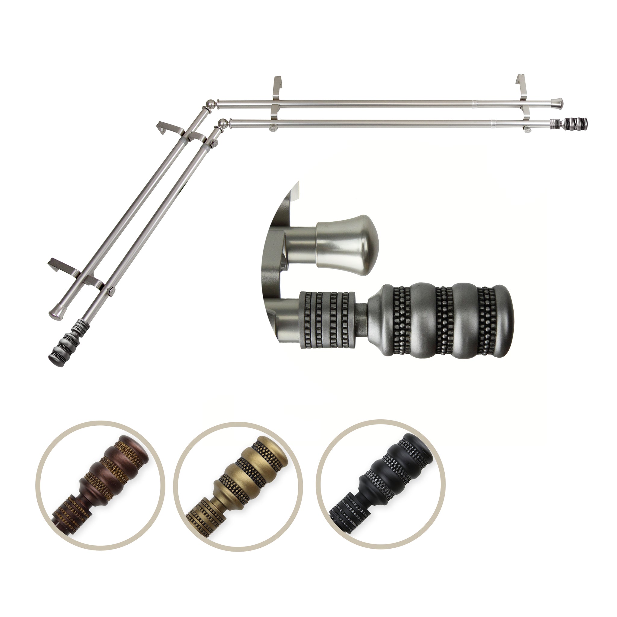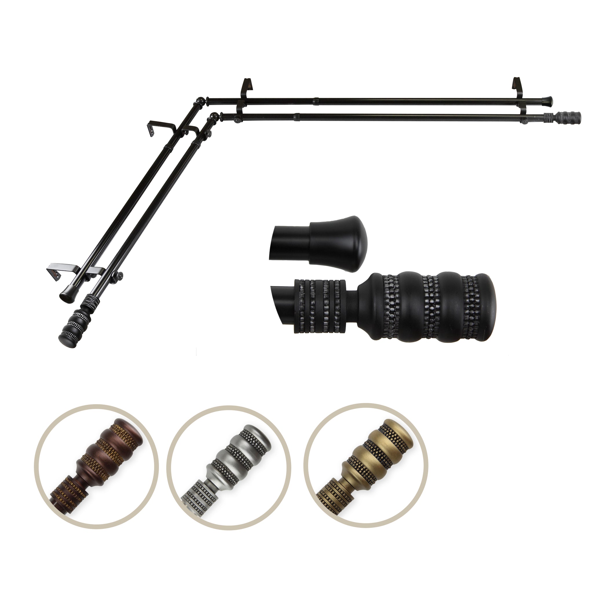 Includes four 13/16" diameter adjustable poles, one pair of decorative finials, one pair of end caps, two corner connectors, brackets, and mounting hardware