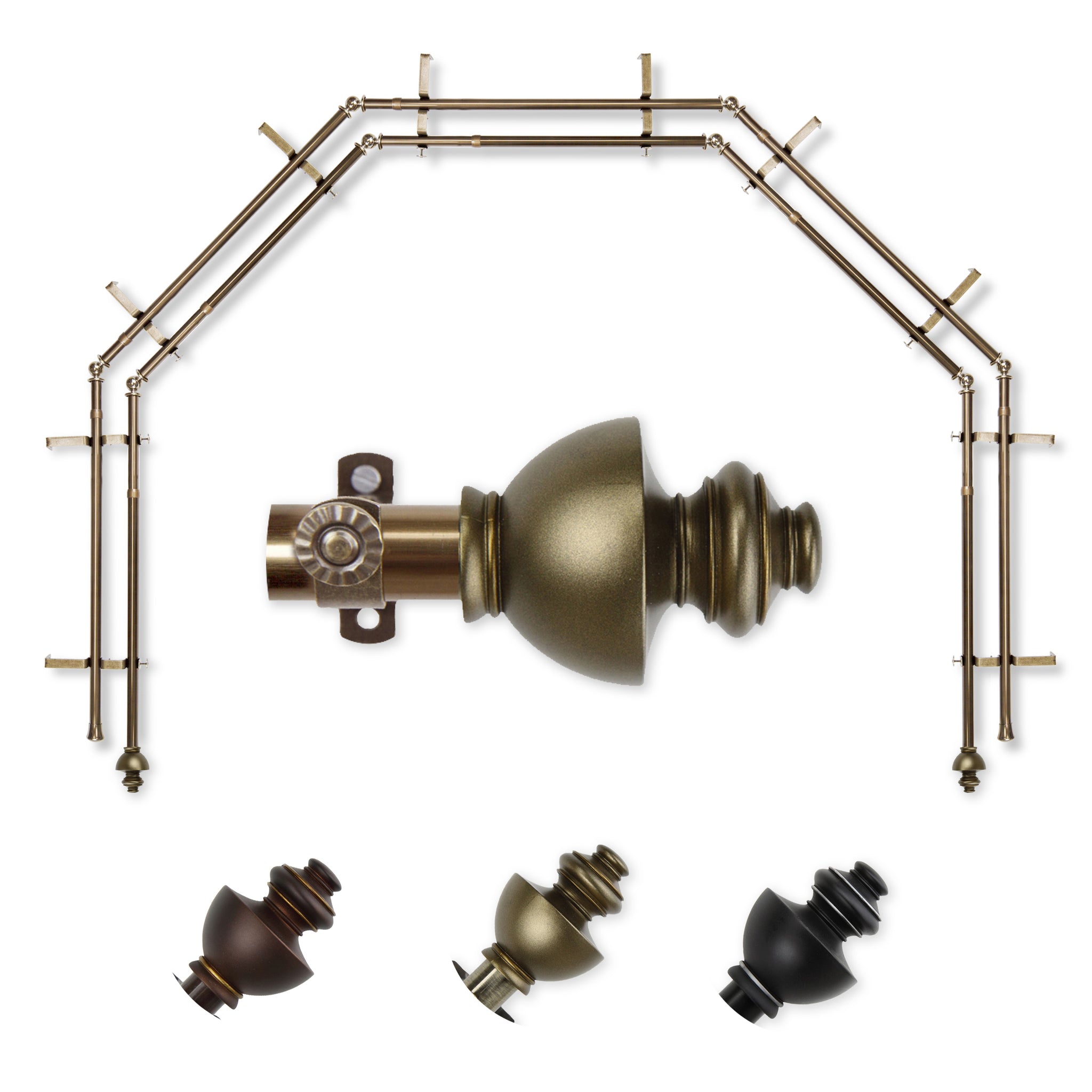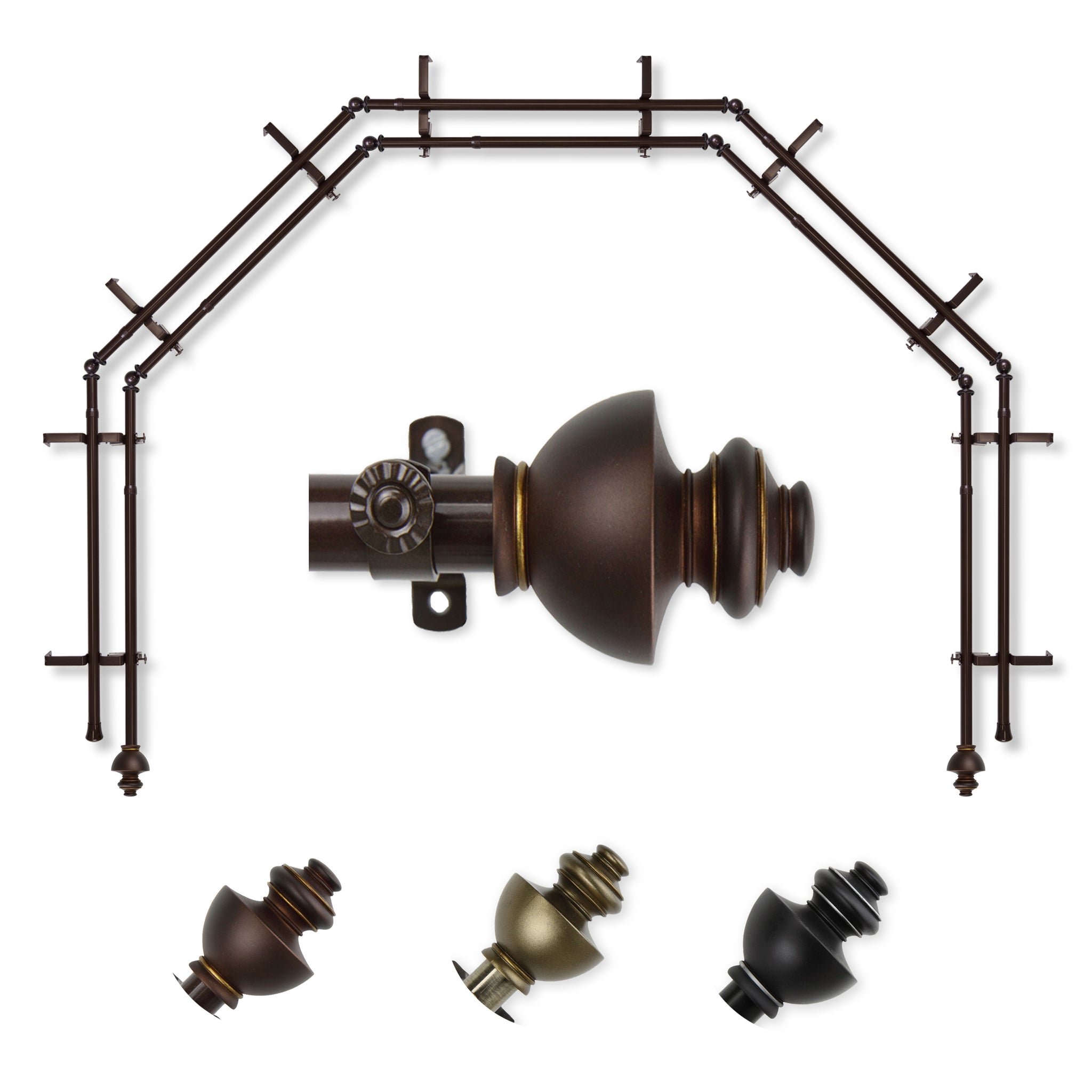 Includes ten 13/16" diameter adjustable poles, one pair of decorative finials, 10 double brackets, 8 corner connectors, and mounting hardware