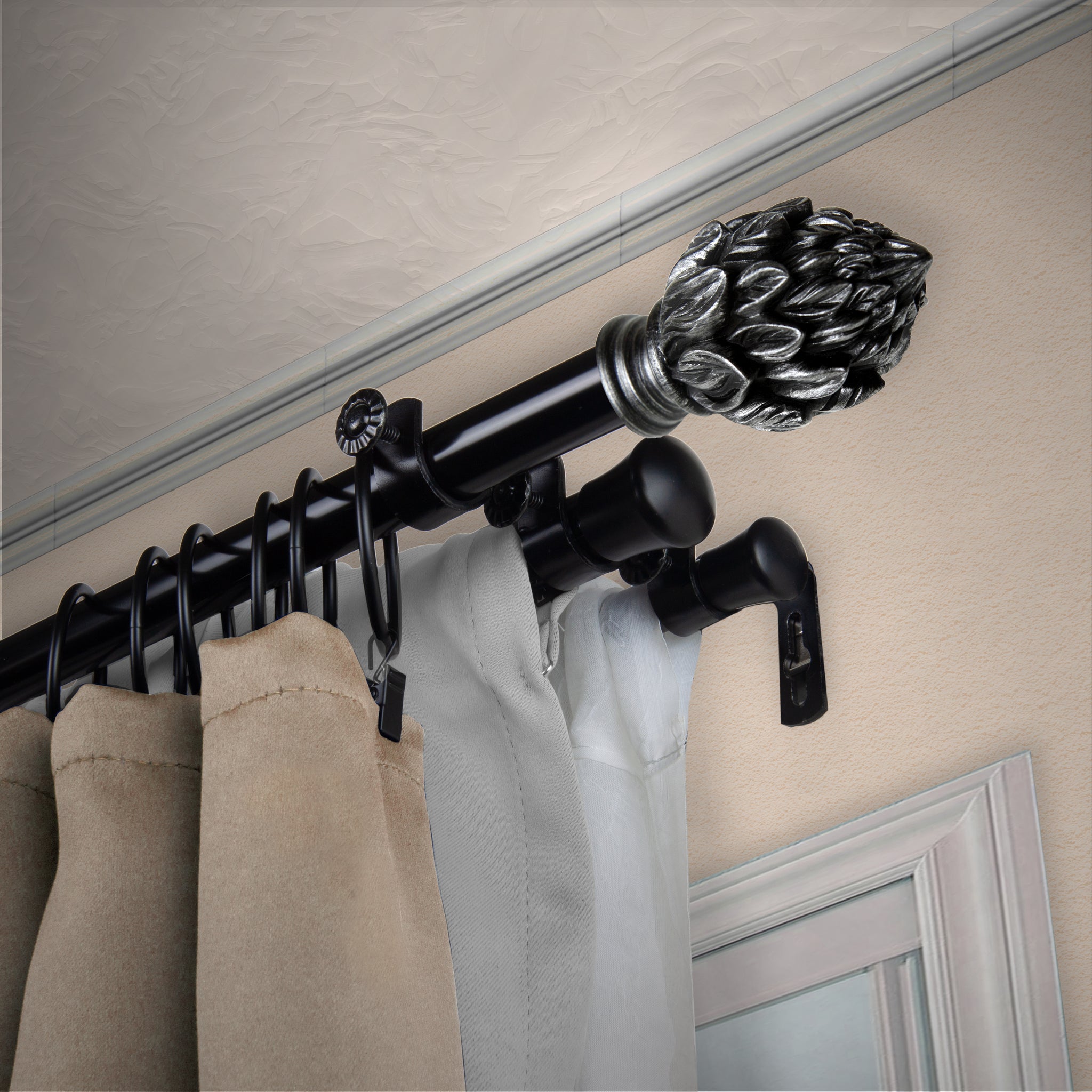 Includes two 13/16" adjustable curtain rods, one 5/8" adjustable back rod, two finials, brackets, and mounting hardware