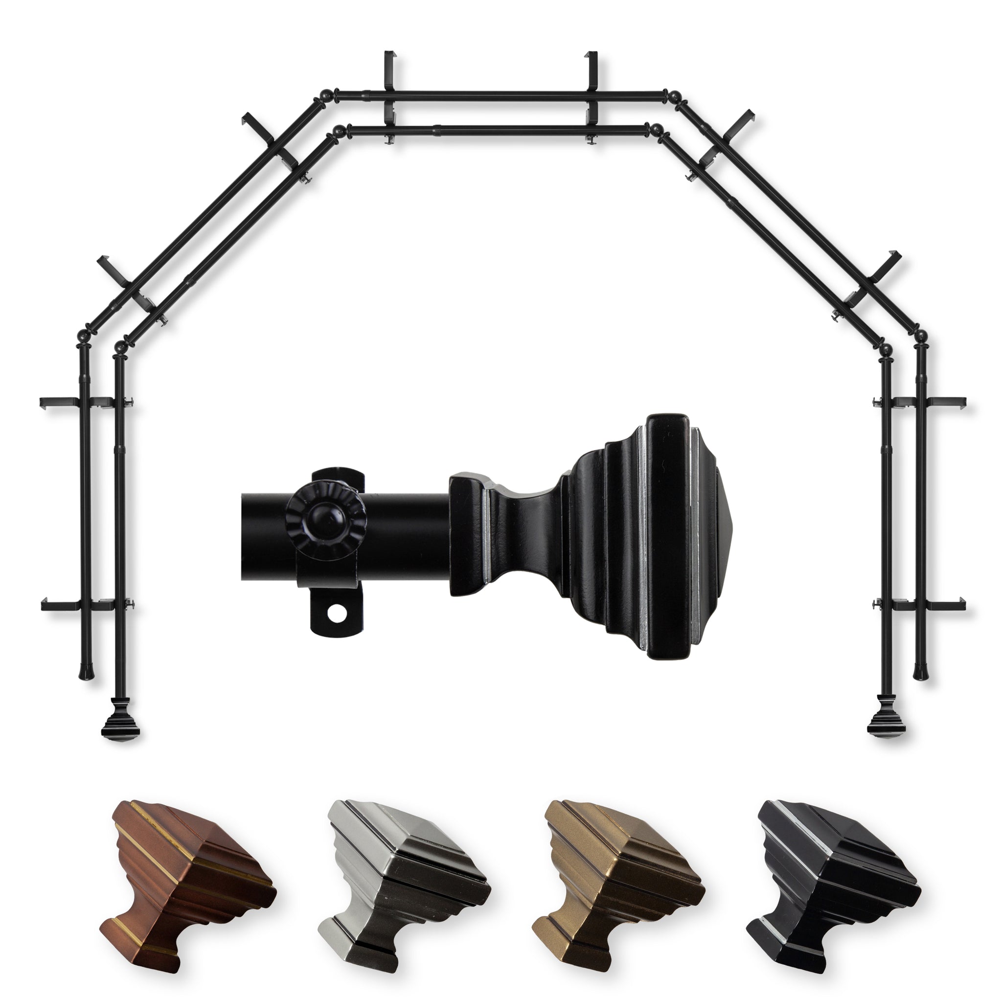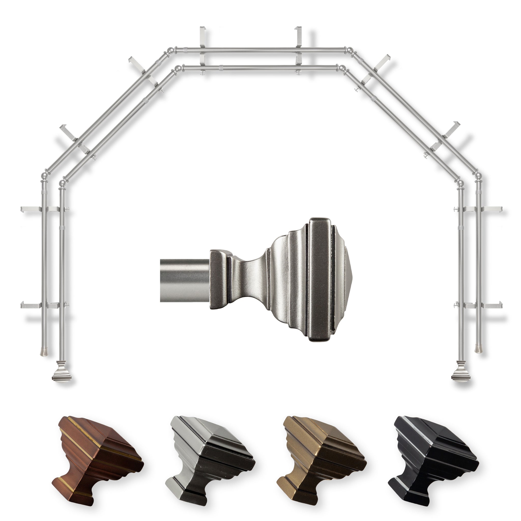 Includes ten 13/16" diameter adjustable poles, one pair of decorative finials, 10 double brackets, 8 corner connectors, and mounting hardware