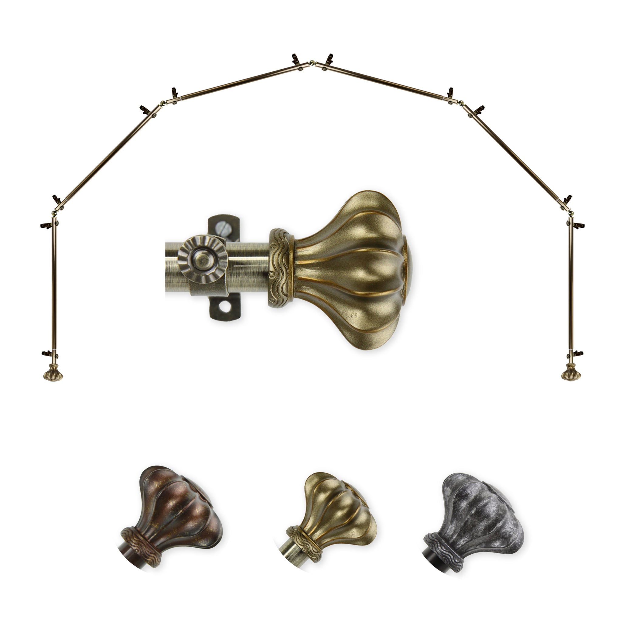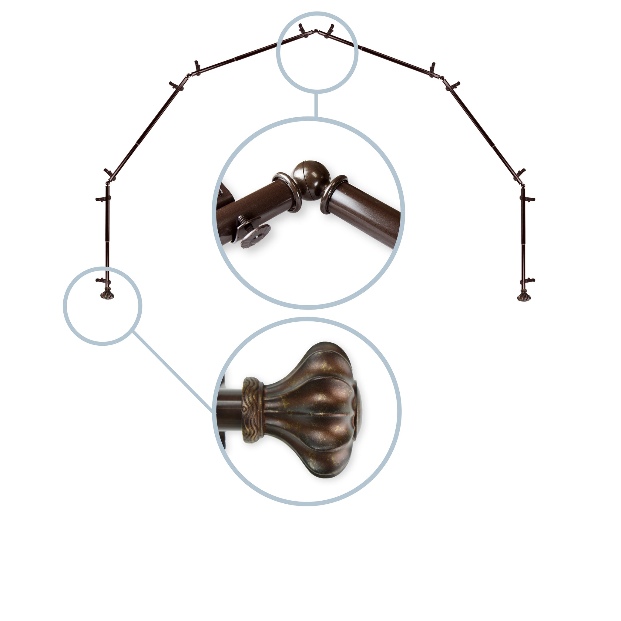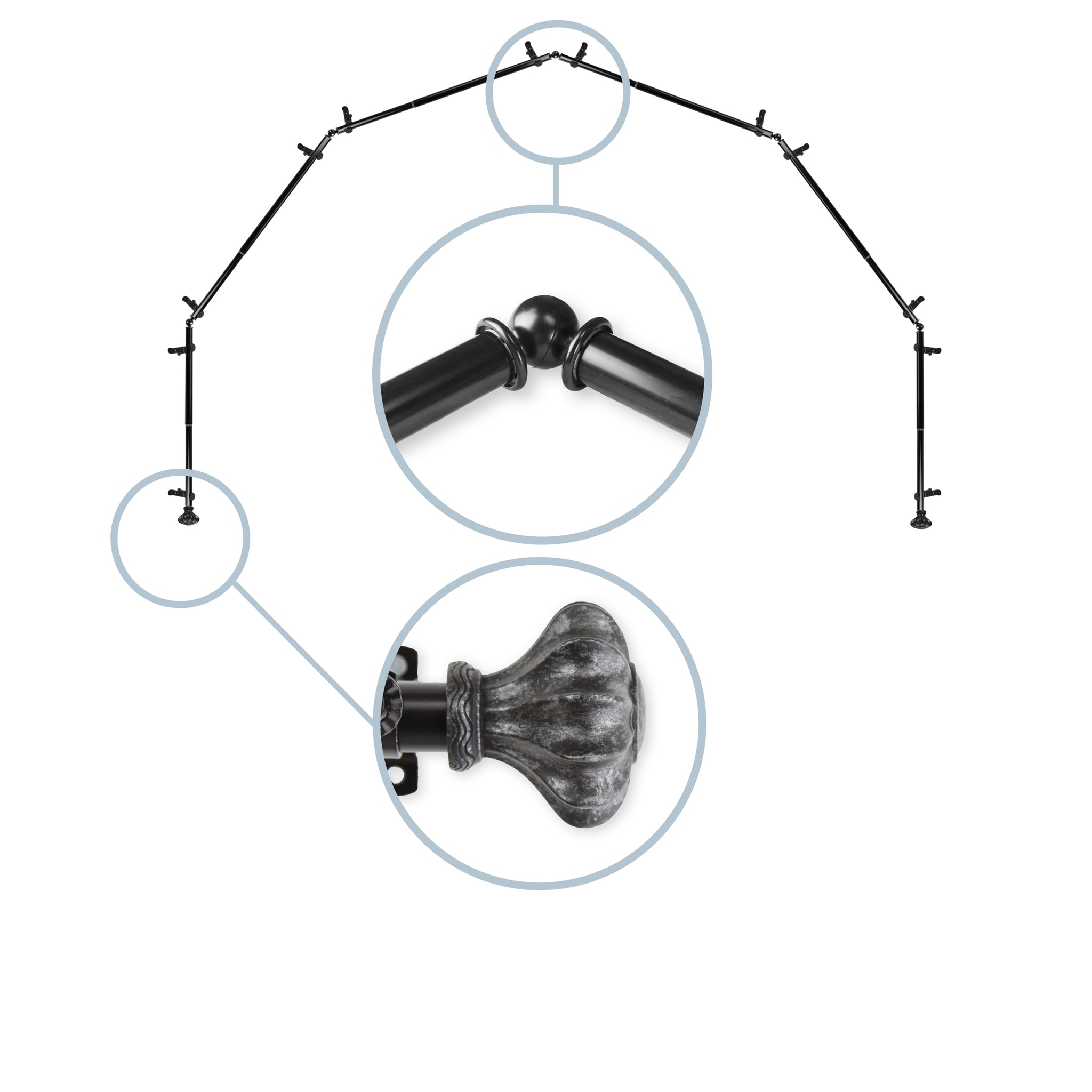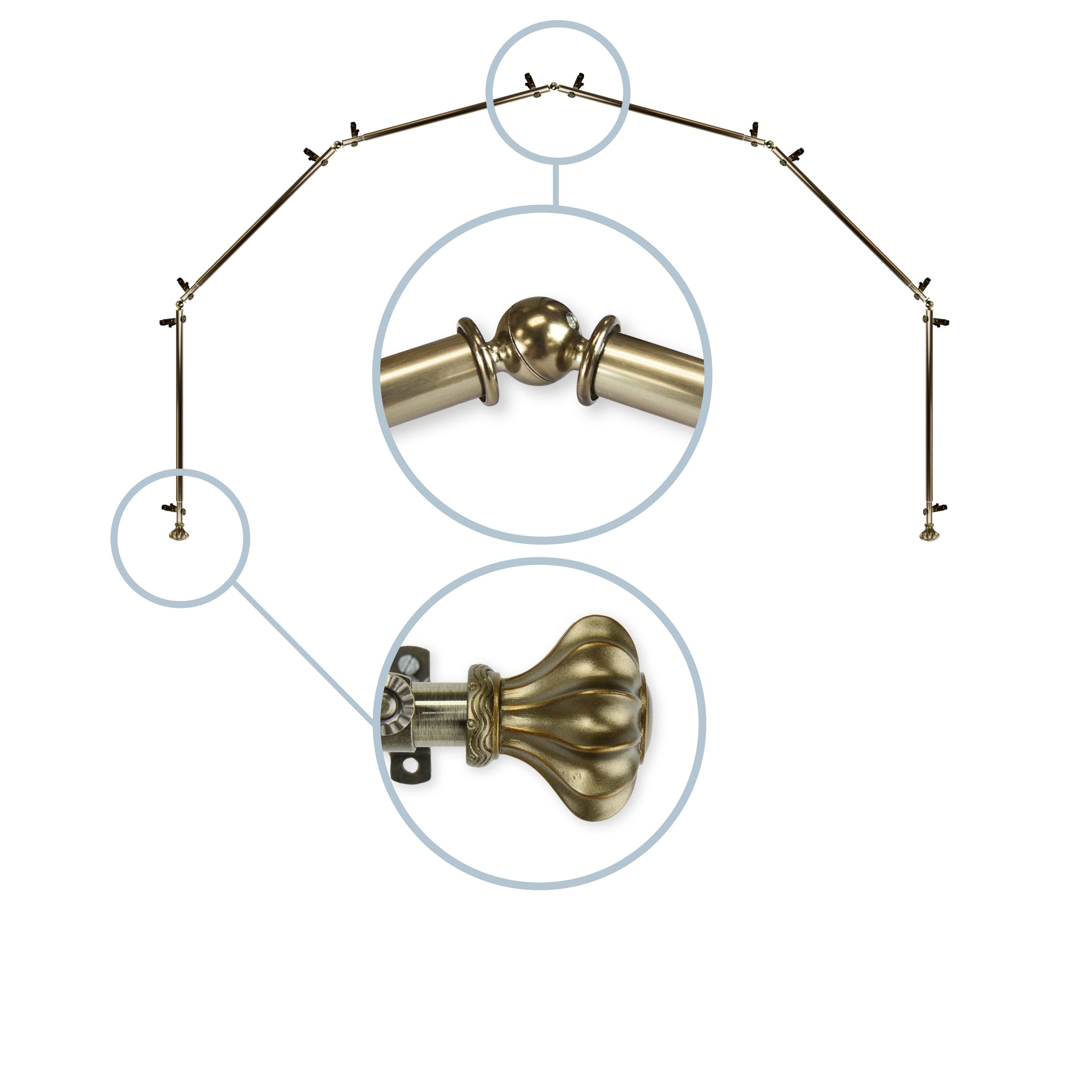 Includes six 13/16" diameter adjustable poles, one pair of decorative finials, 12 single brackets, 5 corner connectors, and mounting hardware