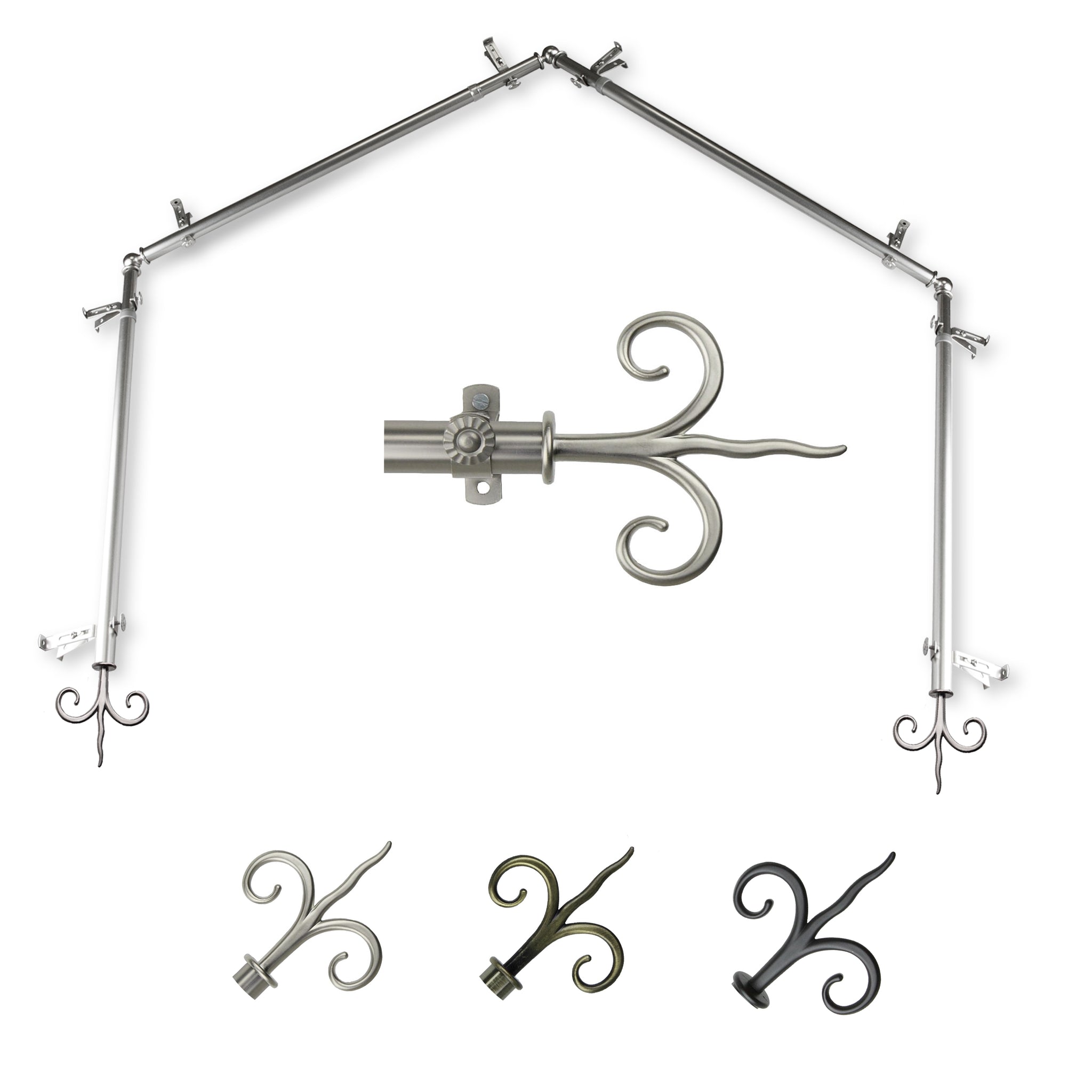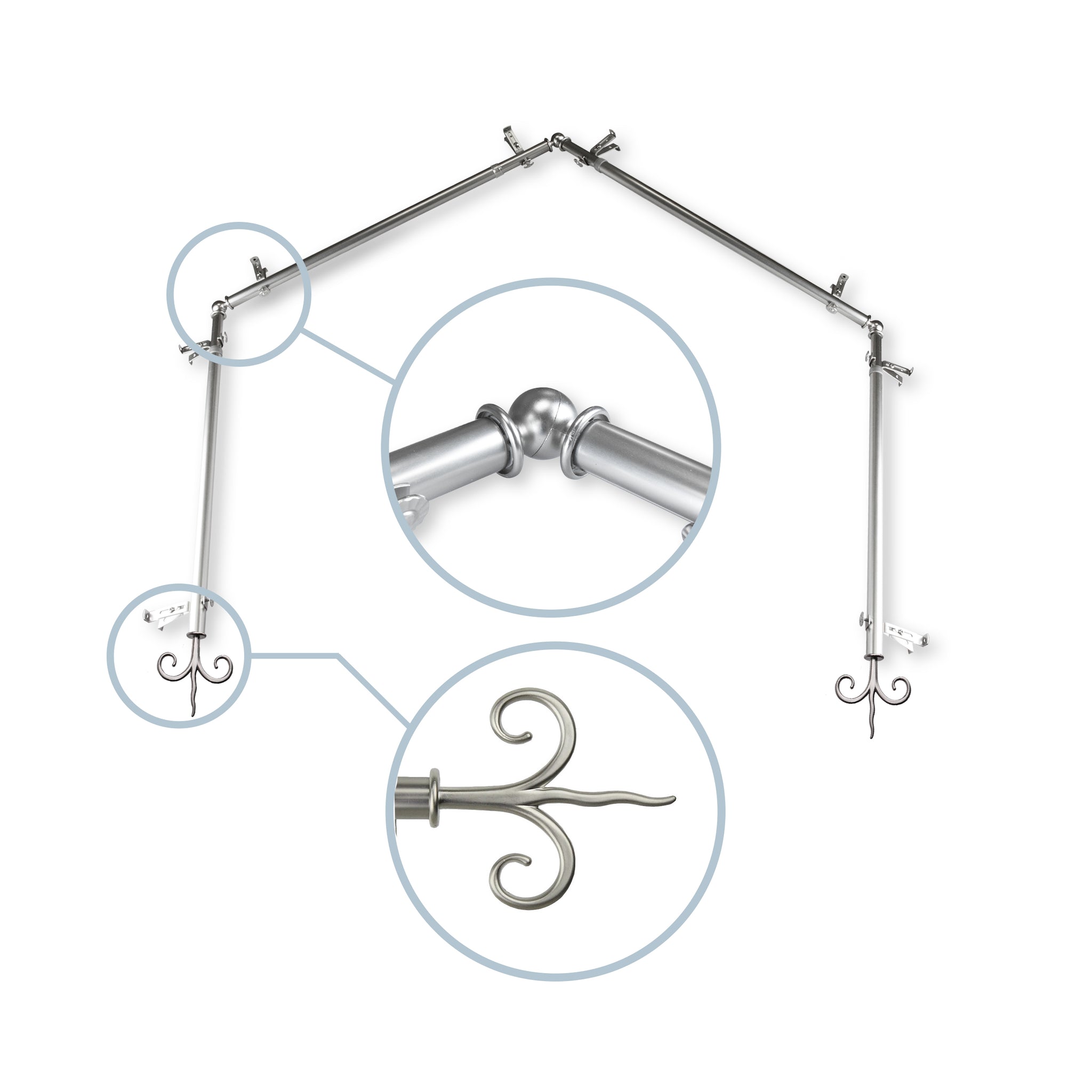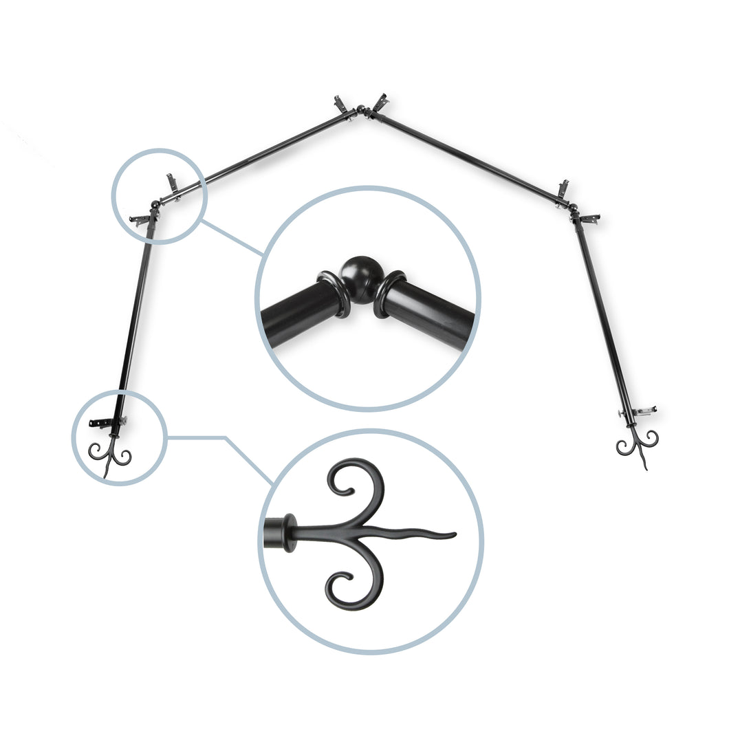 Includes four 13/16" diameter adjustable poles, one pair of decorative finials, 8 single brackets, 3 corner connectors, and mounting hardware