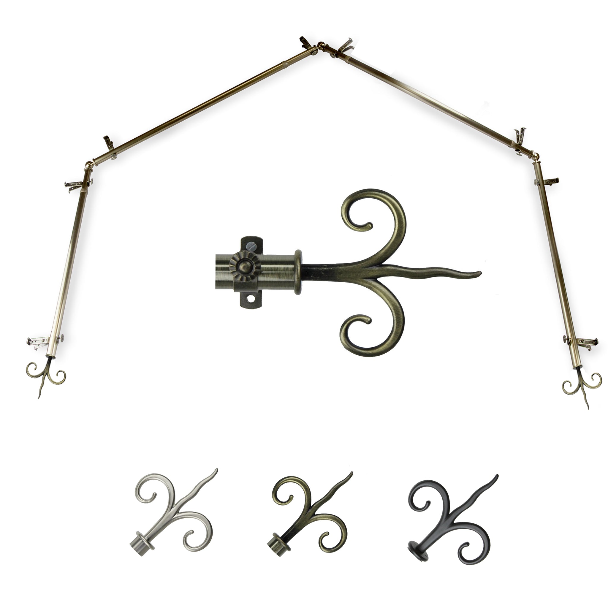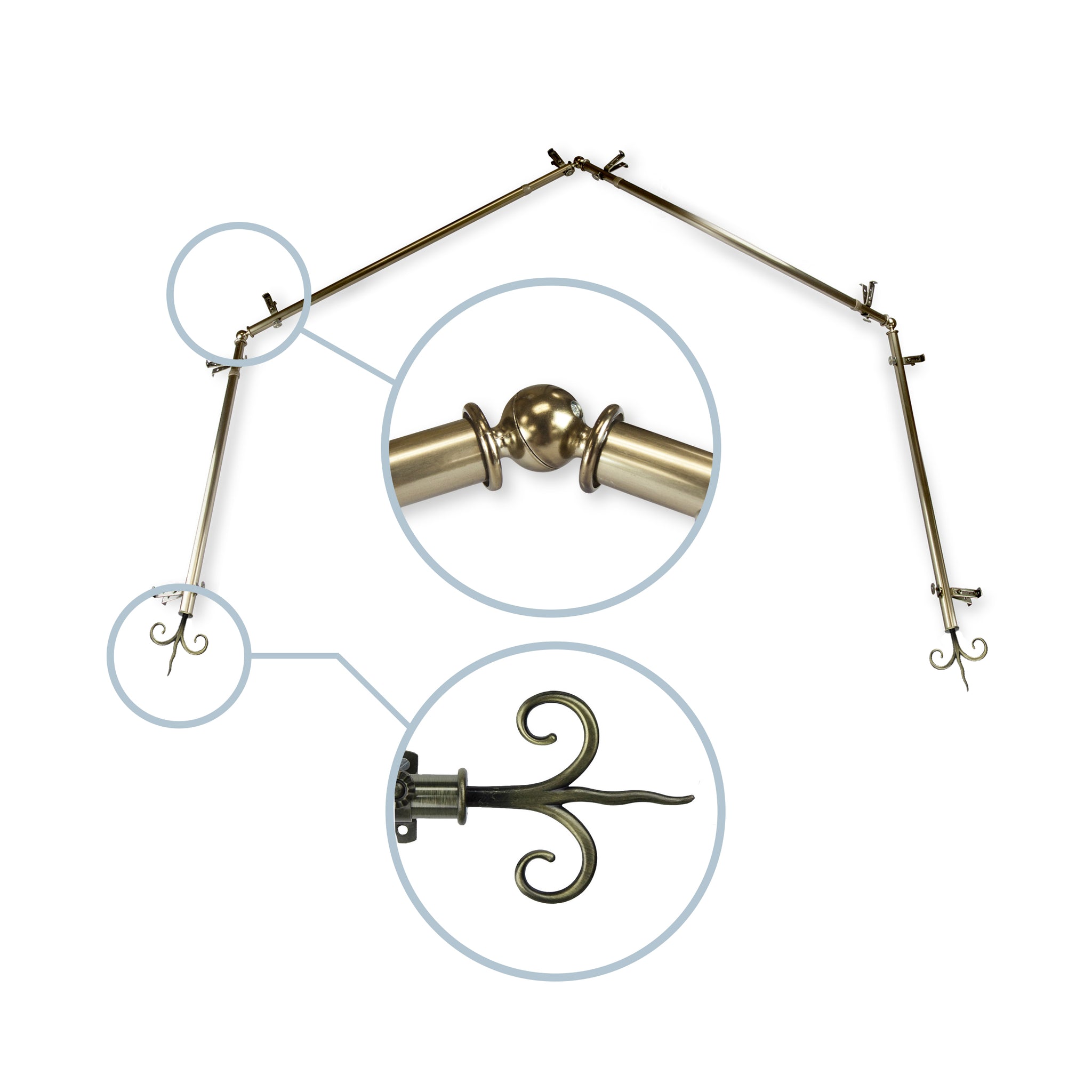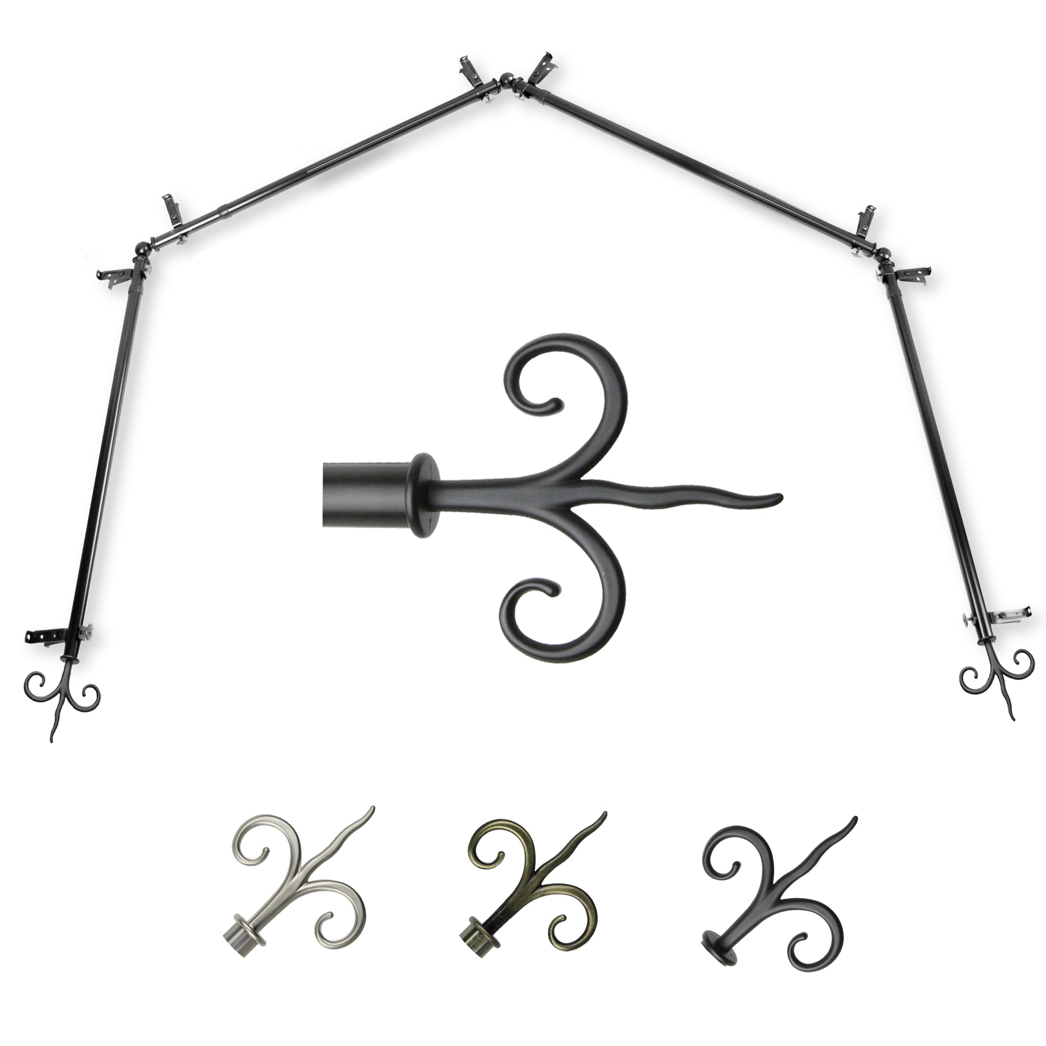 Includes four 13/16" diameter adjustable poles, one pair of decorative finials, 8 single brackets, 3 corner connectors, and mounting hardware