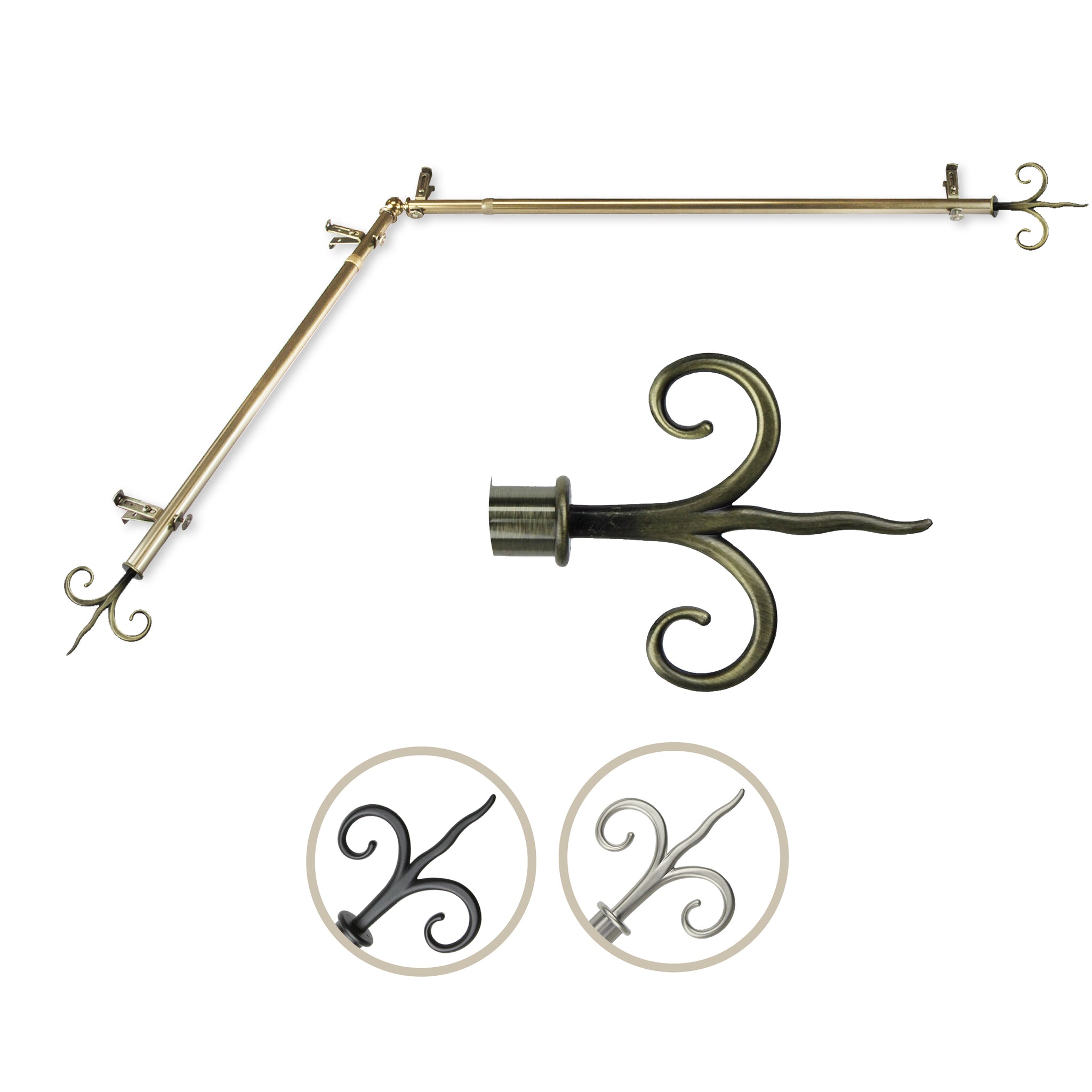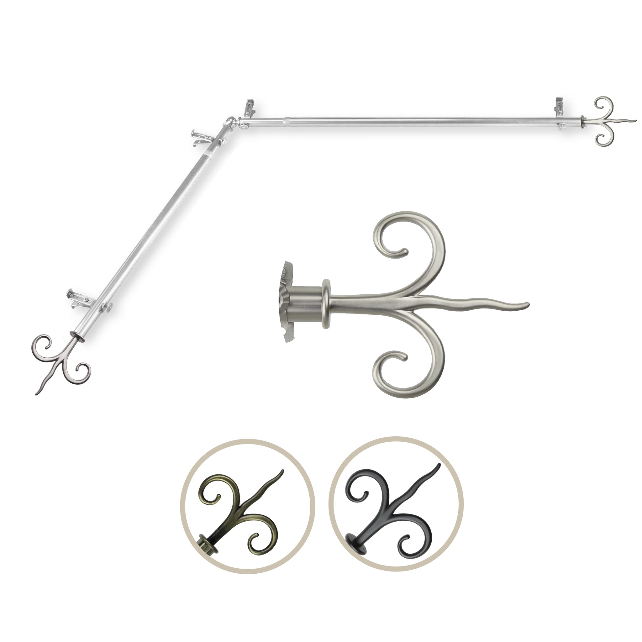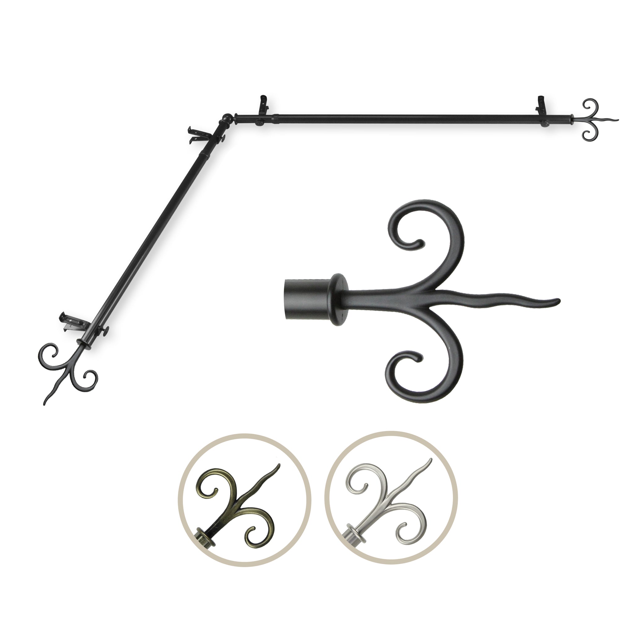 Includes two 13/16" diameter adjustable poles, one pair of decorative finials, one corner connector, brackets and mounting hardware