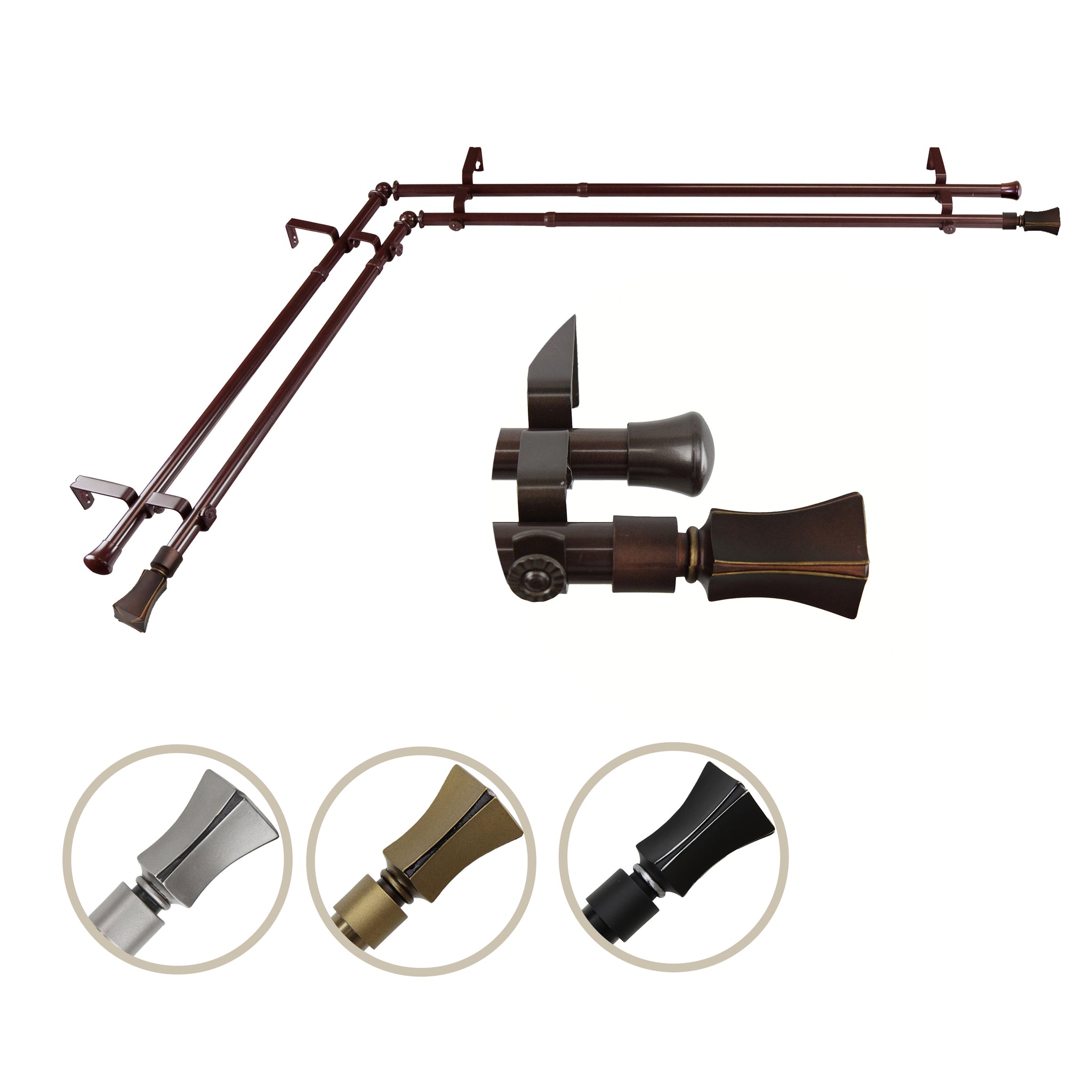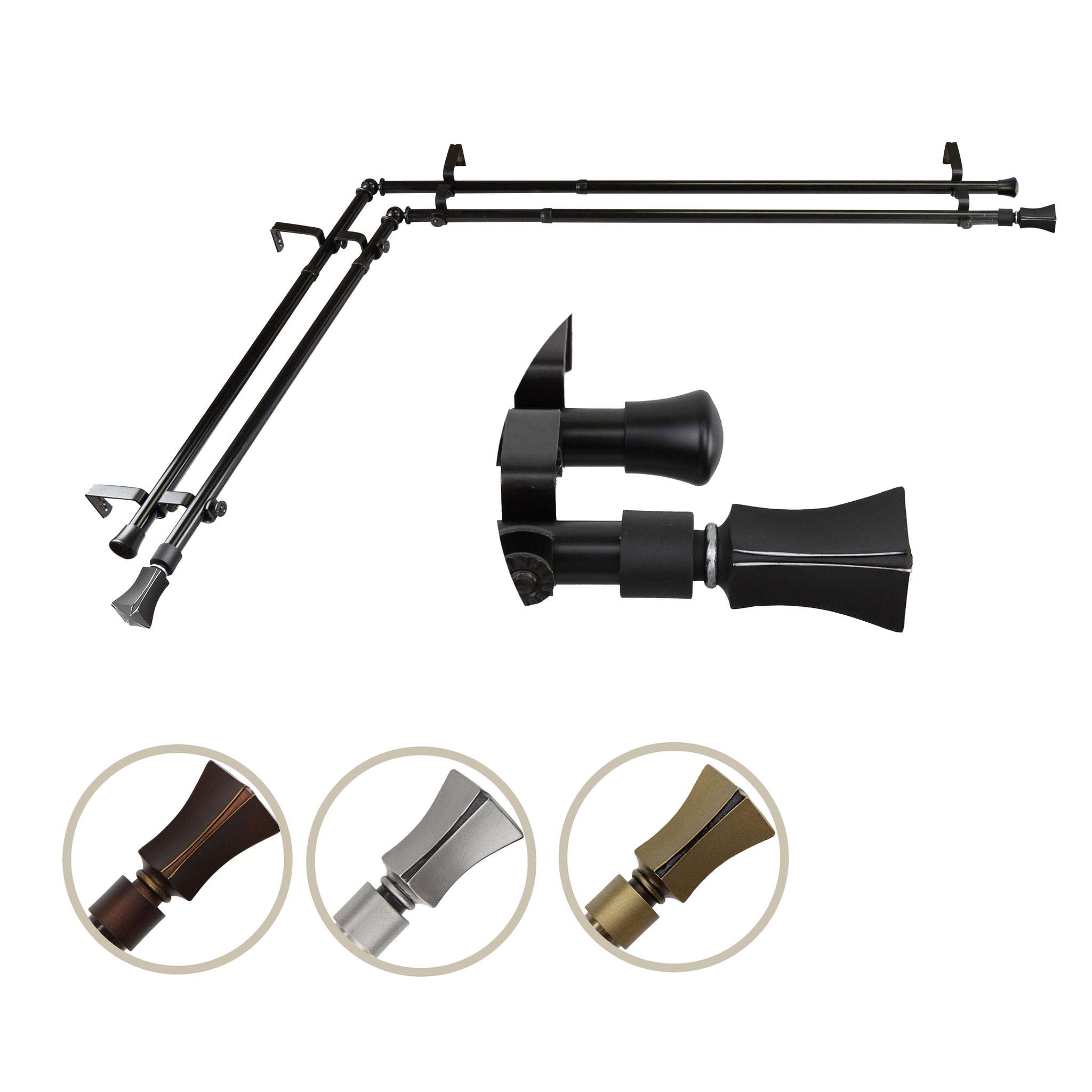 Includes four 13/16" diameter adjustable poles, one pair of decorative finials, one pair of end caps, two corner connectors, brackets, and mounting hardware