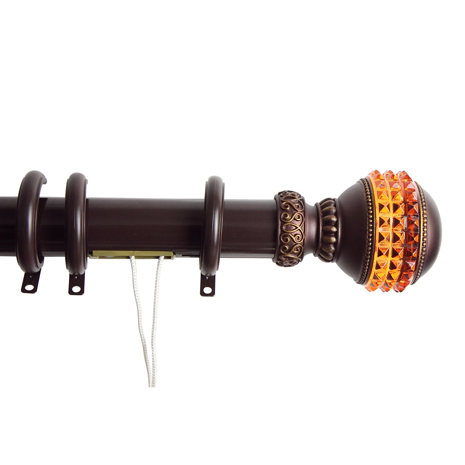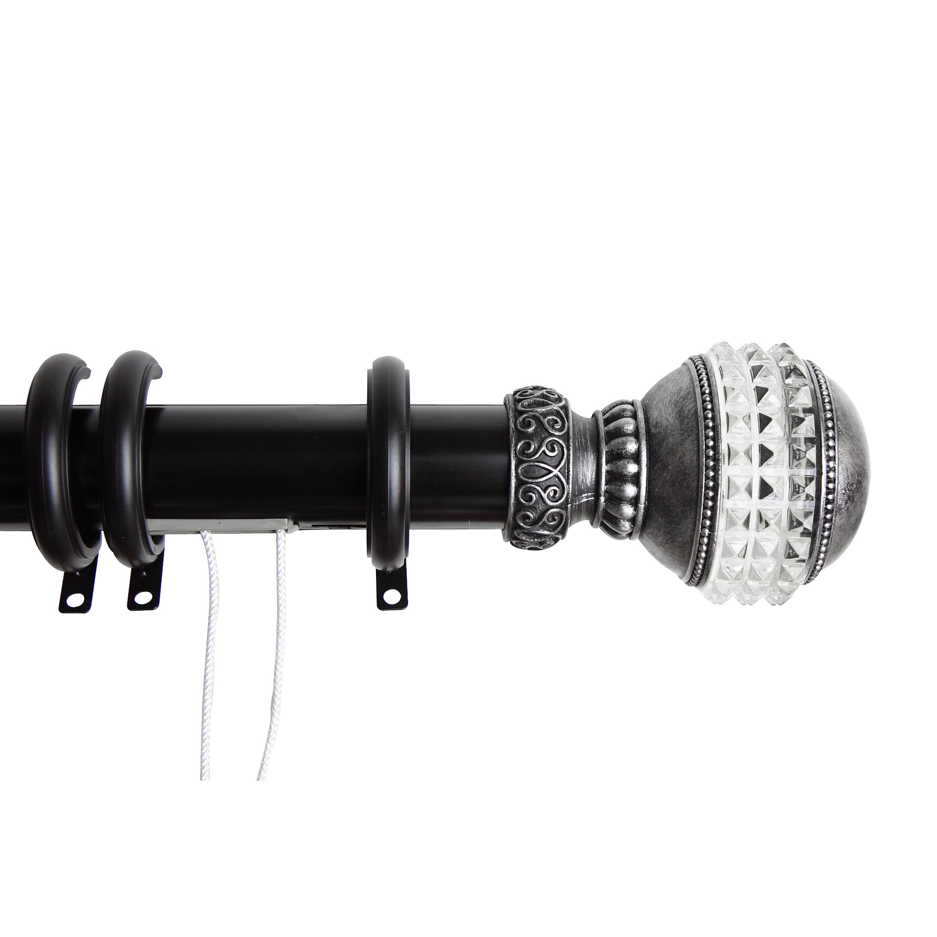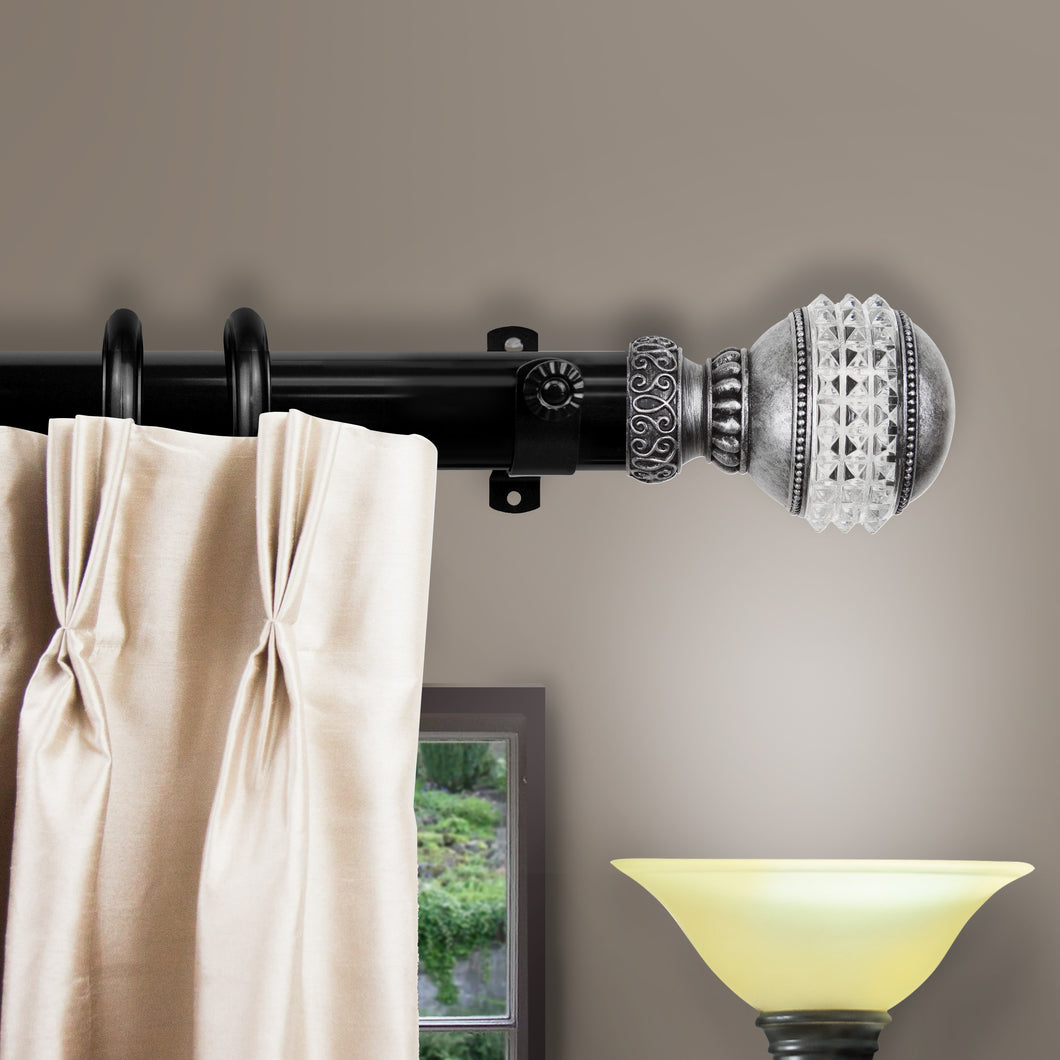Includes one 1.5" diameter adjustable traverse rod w/ rings, one pair of decorative finials, brackets, and mounting hardware