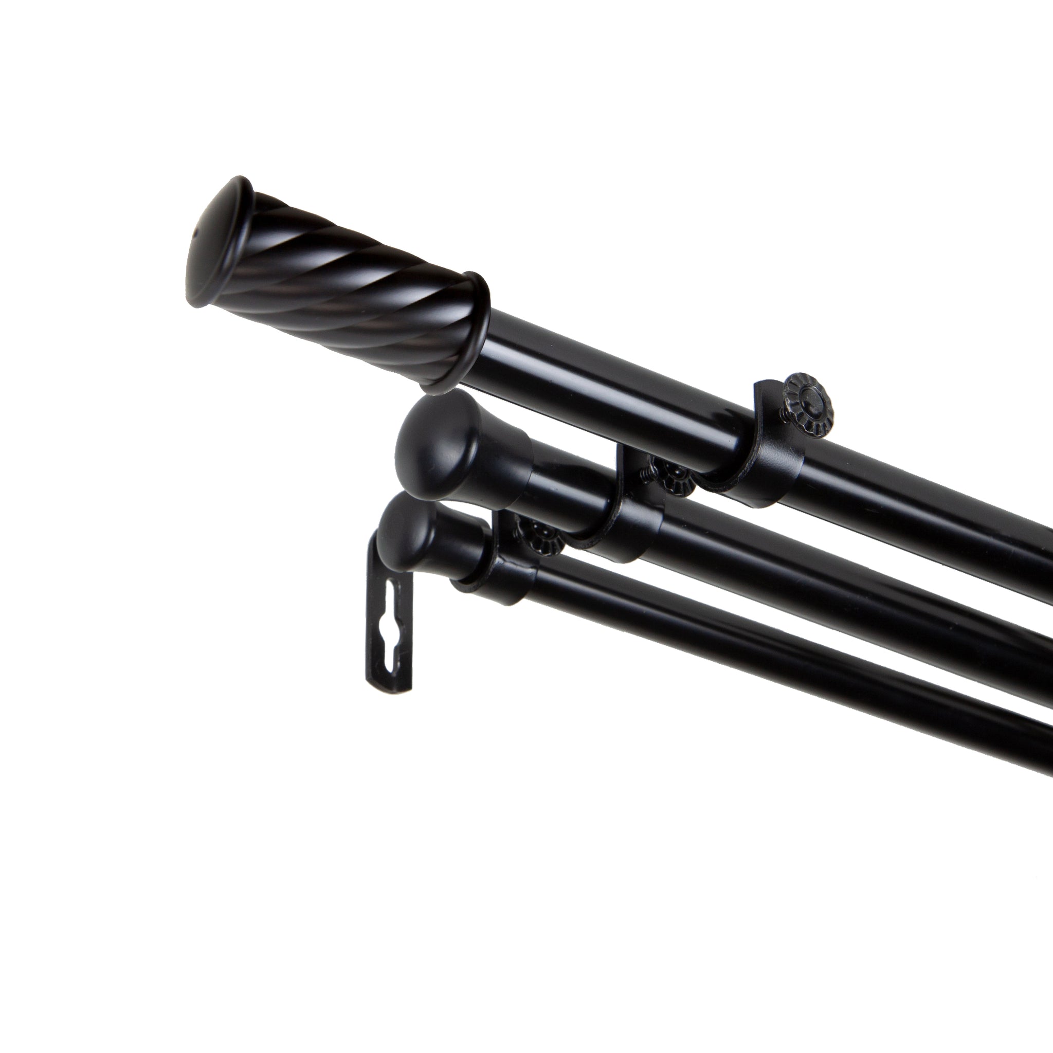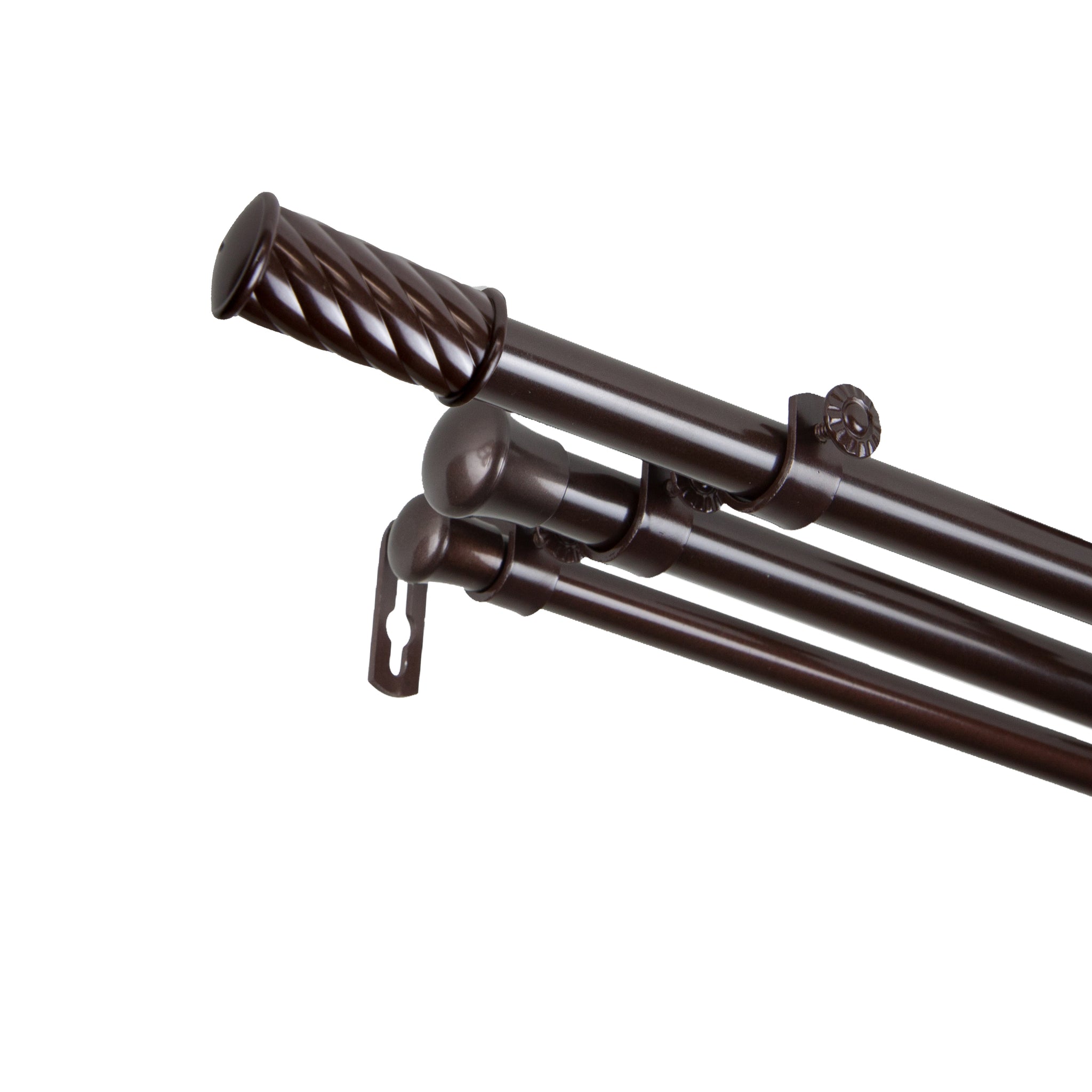 Includes two 13/16" adjustable curtain rods, one 5/8" adjustable back rod, two finials, brackets, and mounting hardware
