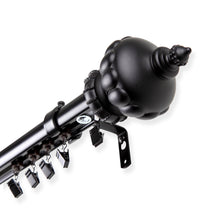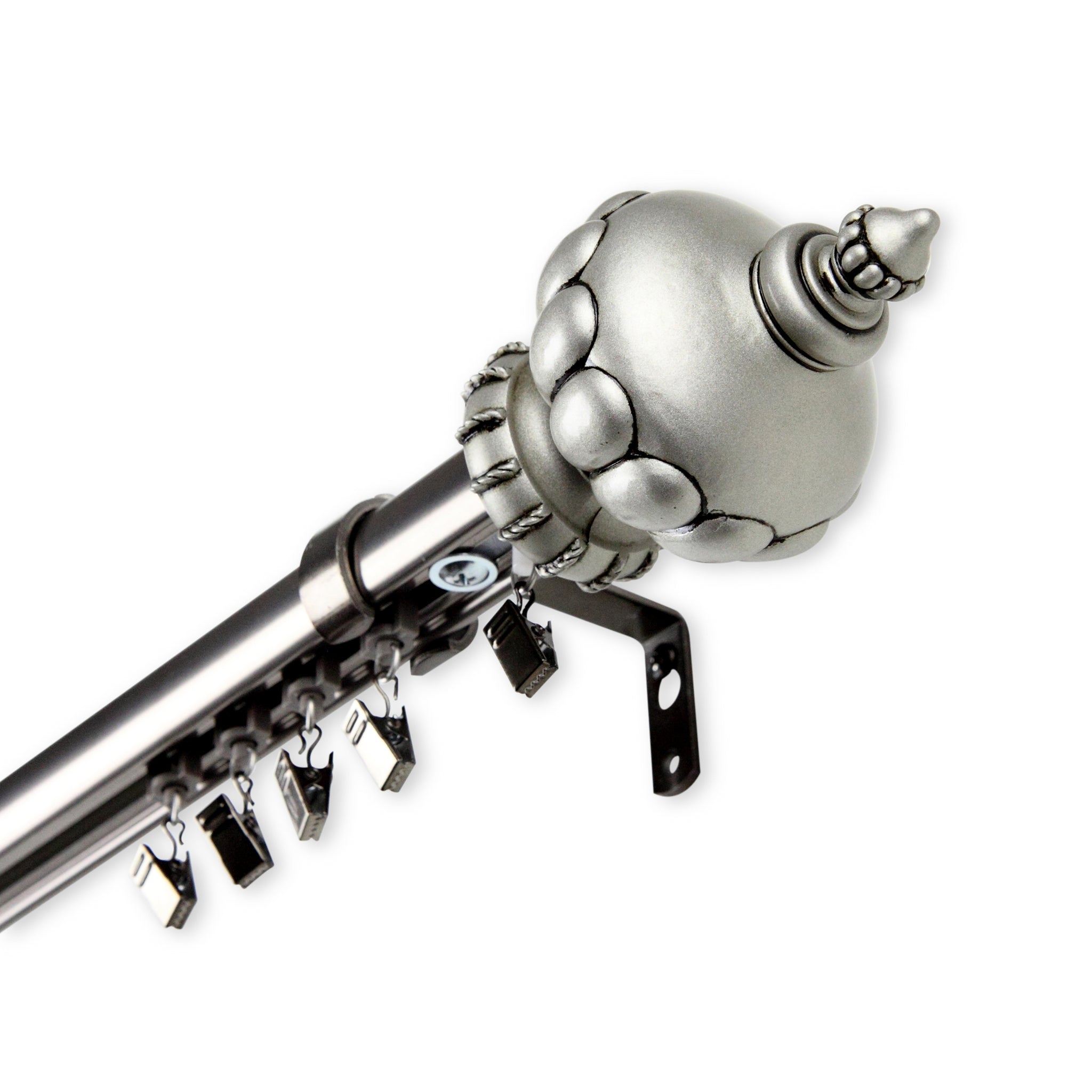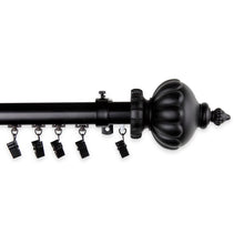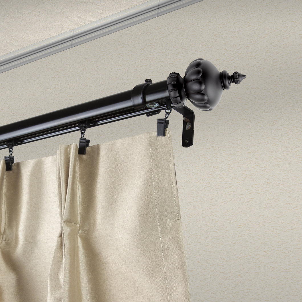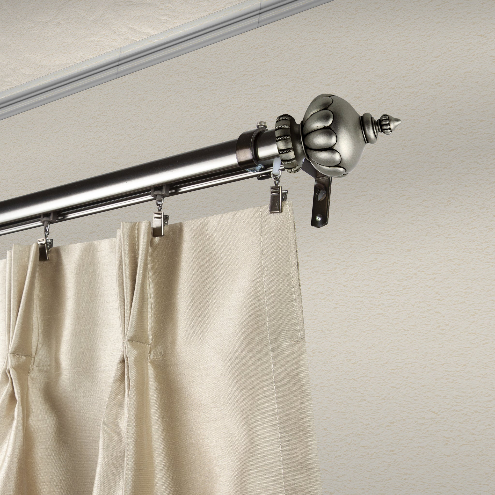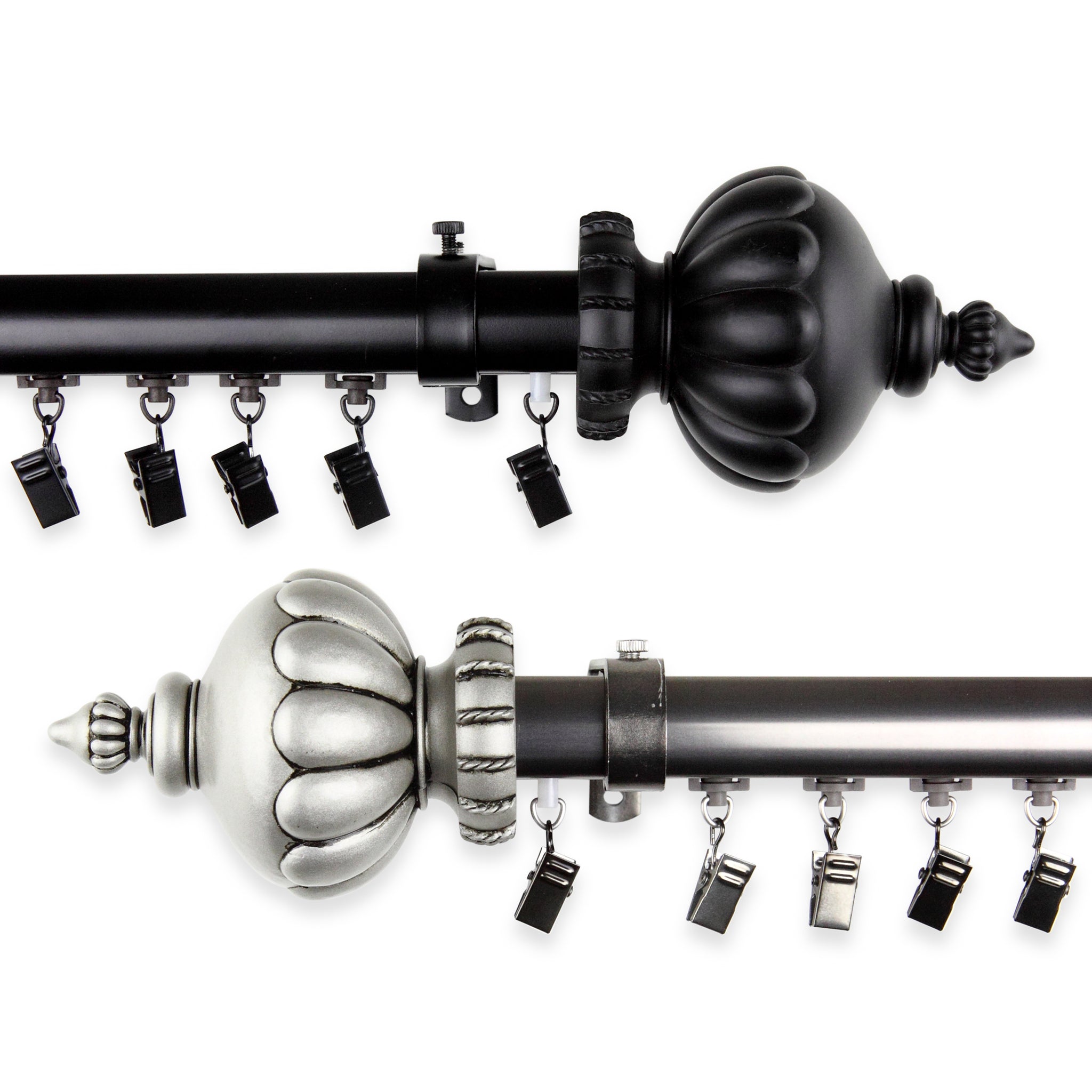 Includes one 1.5" diameter adjustable traverse rod w/ sliders, one pair of decorative finials, brackets, and mounting hardware