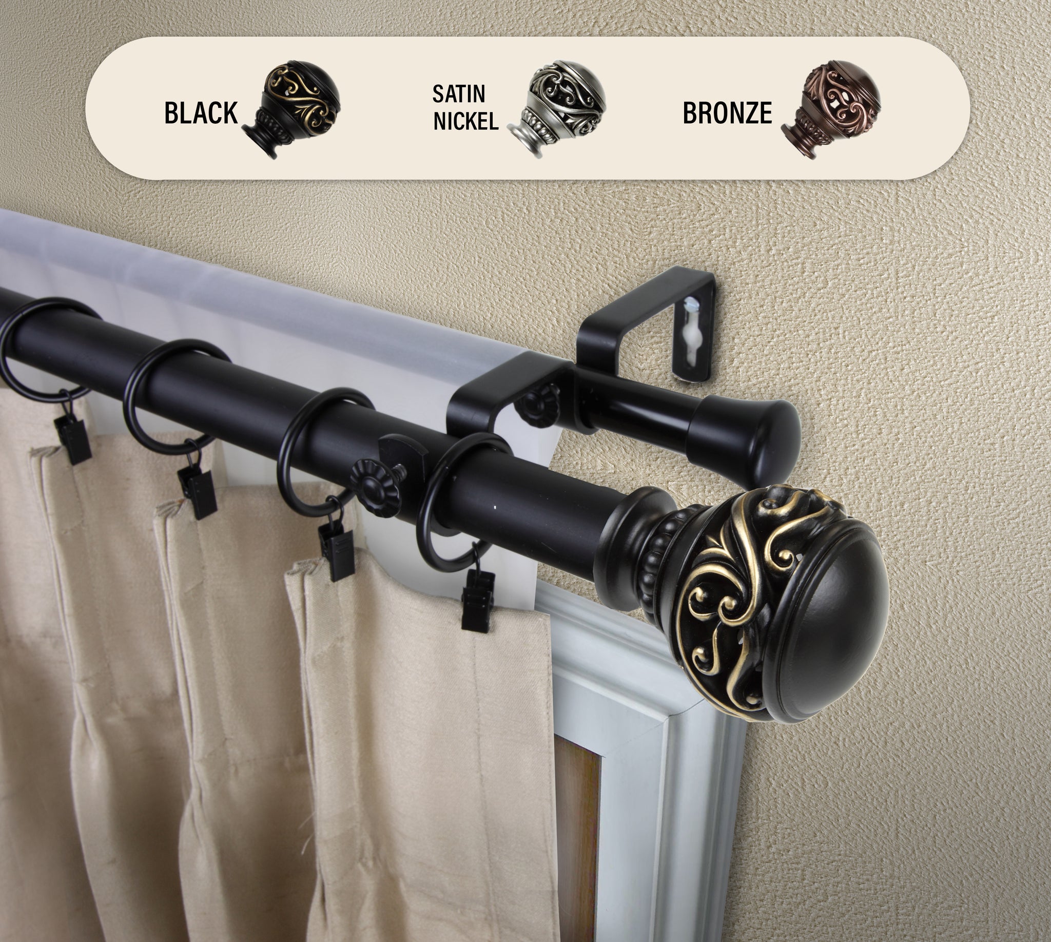 Includes one 1" high-quality steel telescoping pole and one 13/16" adjustable back rod, two finials, double brackets, and mounting hardware