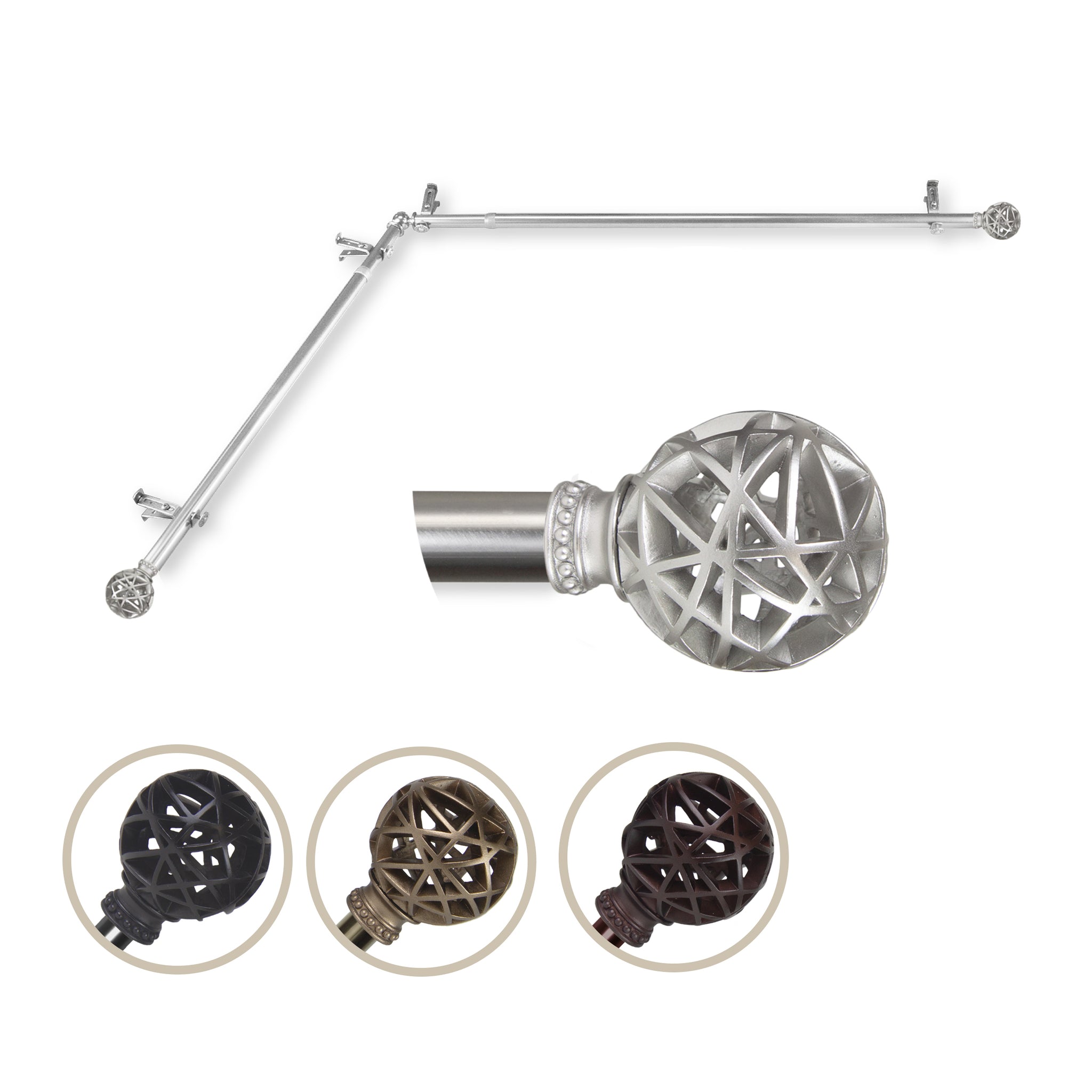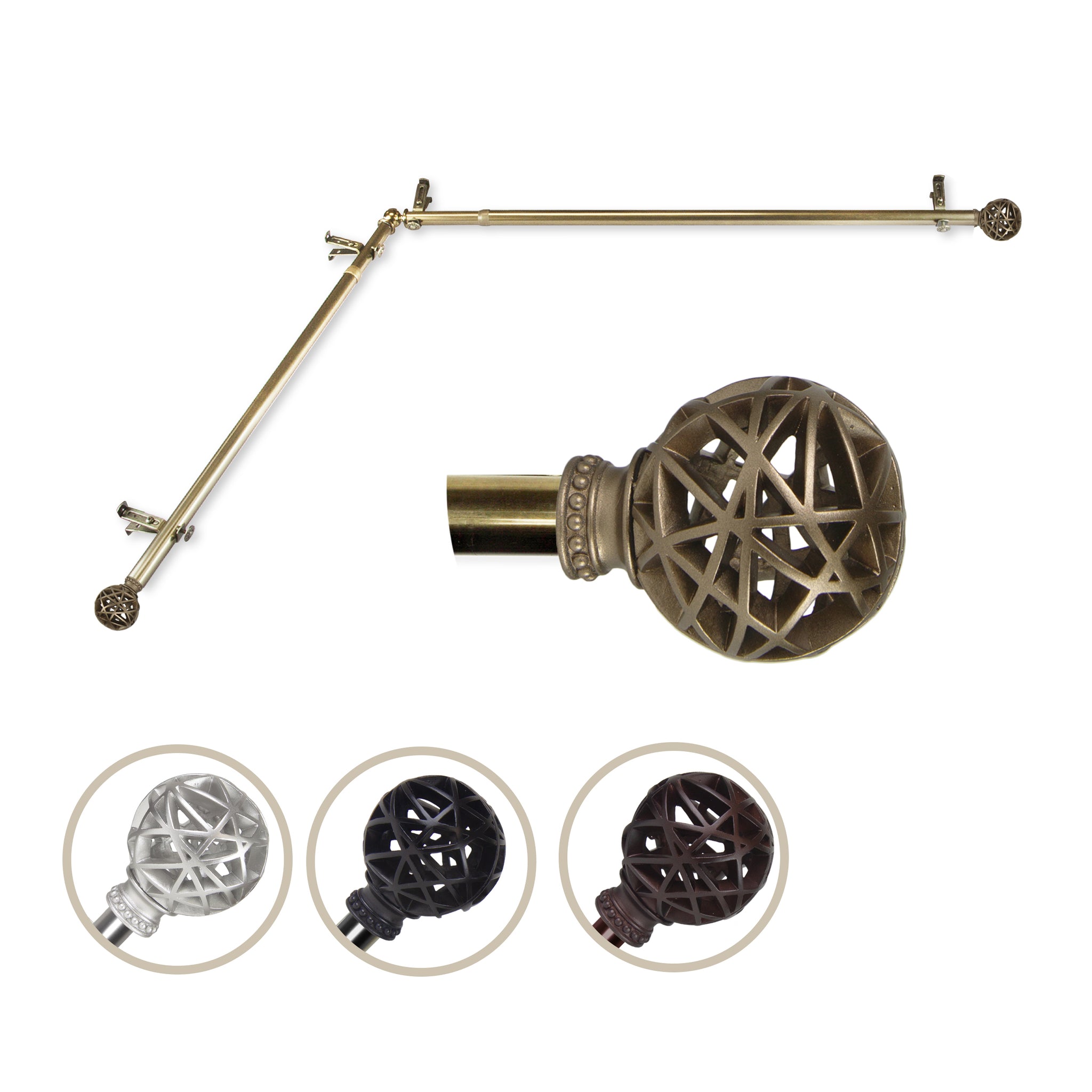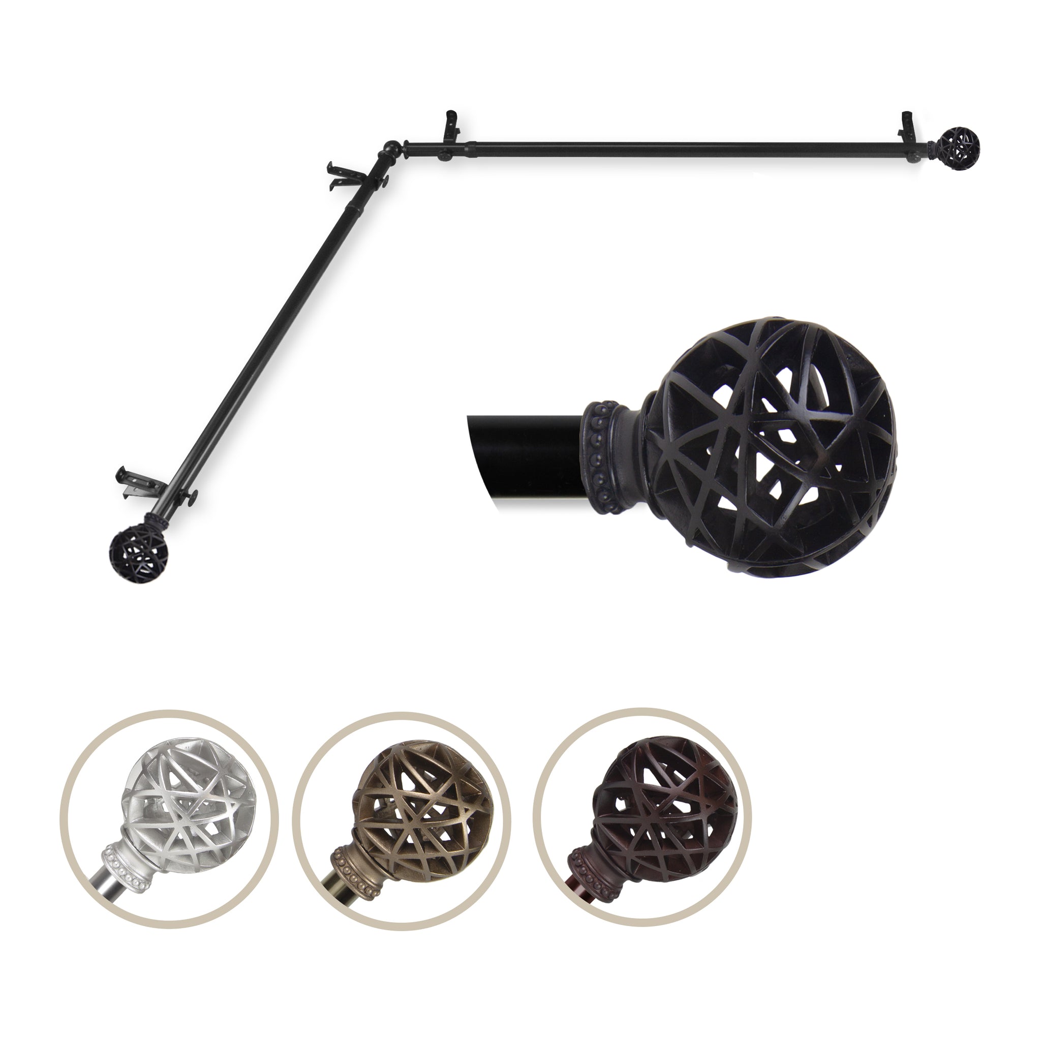 Includes two 13/16" diameter adjustable poles, one pair of decorative finials, one corner connector, brackets and mounting hardware