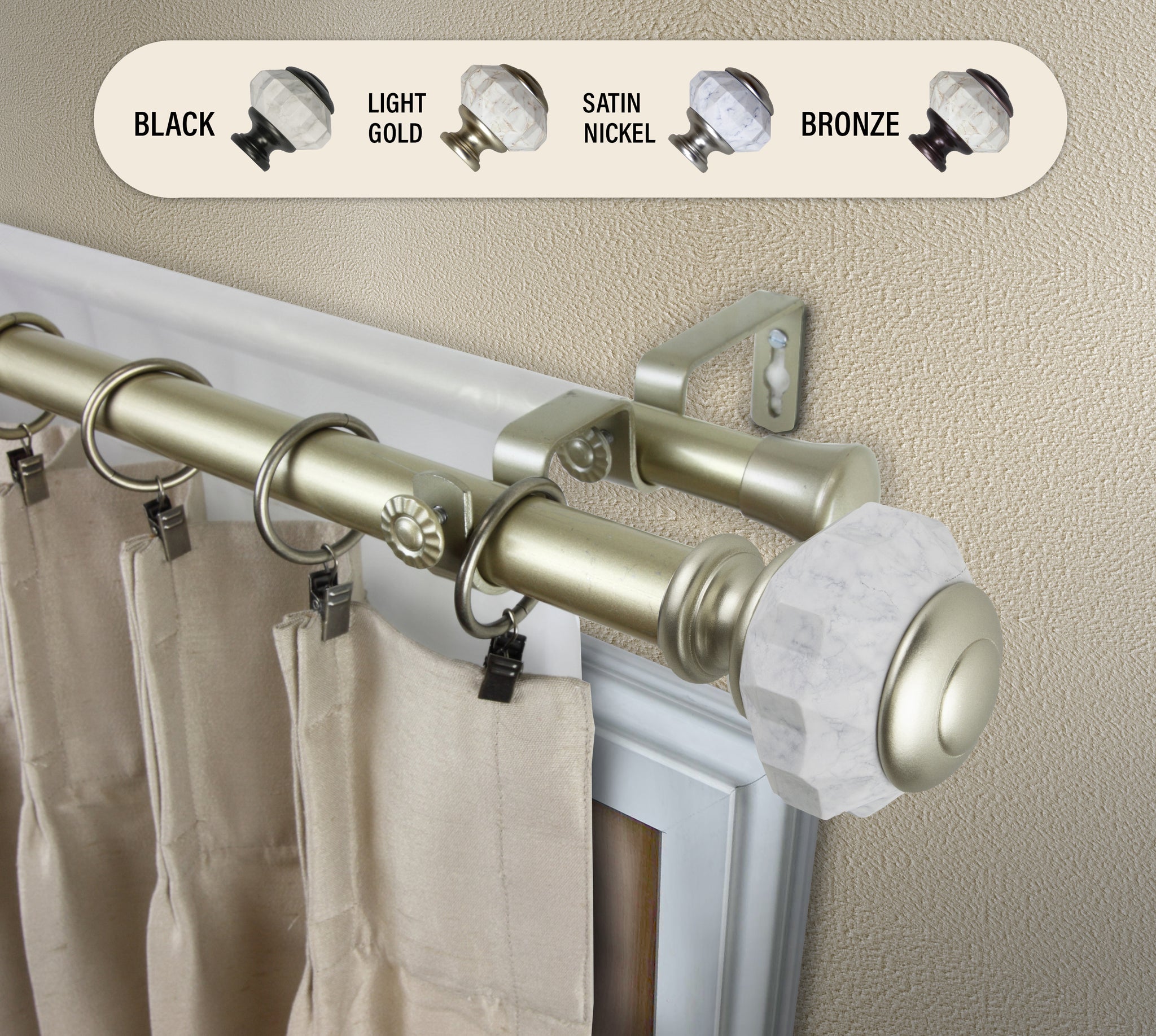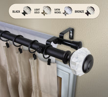 Includes one 1" high-quality steel telescoping pole and one 13/16" adjustable back rod, two finials, double brackets, and mounting hardware