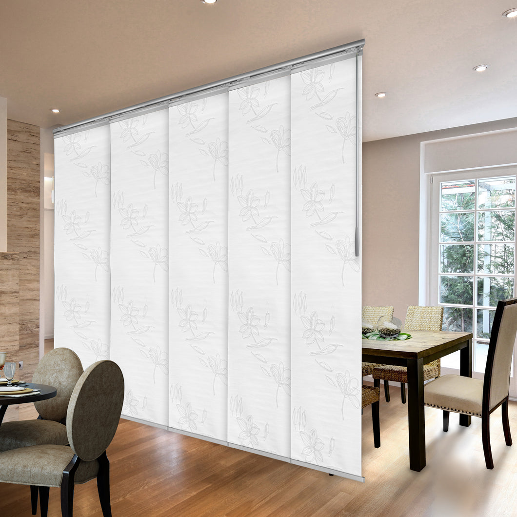 Patented Sliders Design: Durable and smooth operation, the patented sliders are made with aluminum and fitted with bearings that allow the sliders to glide across the rail. The sliders are also stacked closer together than conventional panel tracks, which reduces light bleed coming from the gaps between panels.