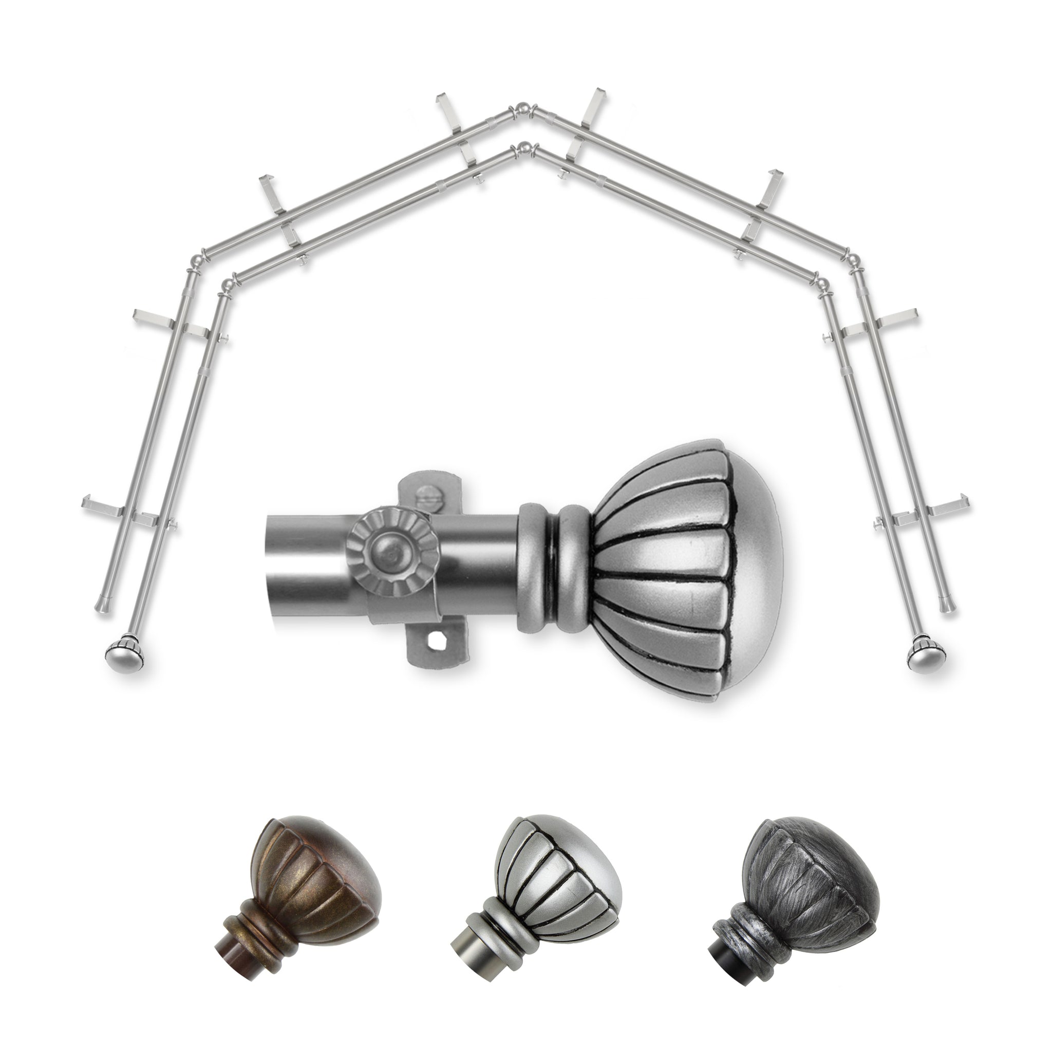 Includes eight 13/16" diameter adjustable poles, one pair of decorative finials, 8 double brackets, 6 corner connectors, and mounting hardware