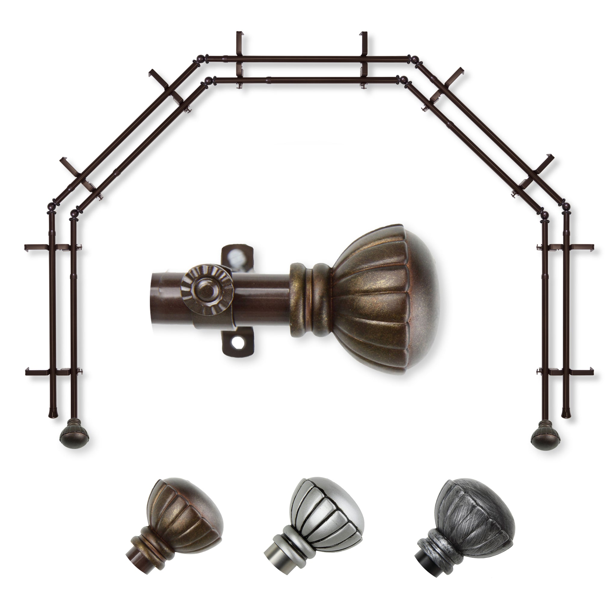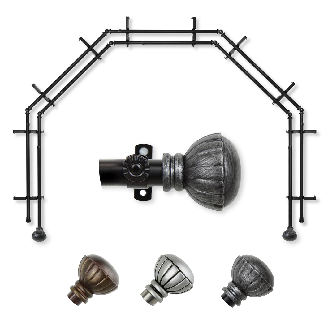 Includes ten 13/16" diameter adjustable poles, one pair of decorative finials, 10 double brackets, 8 corner connectors, and mounting hardware