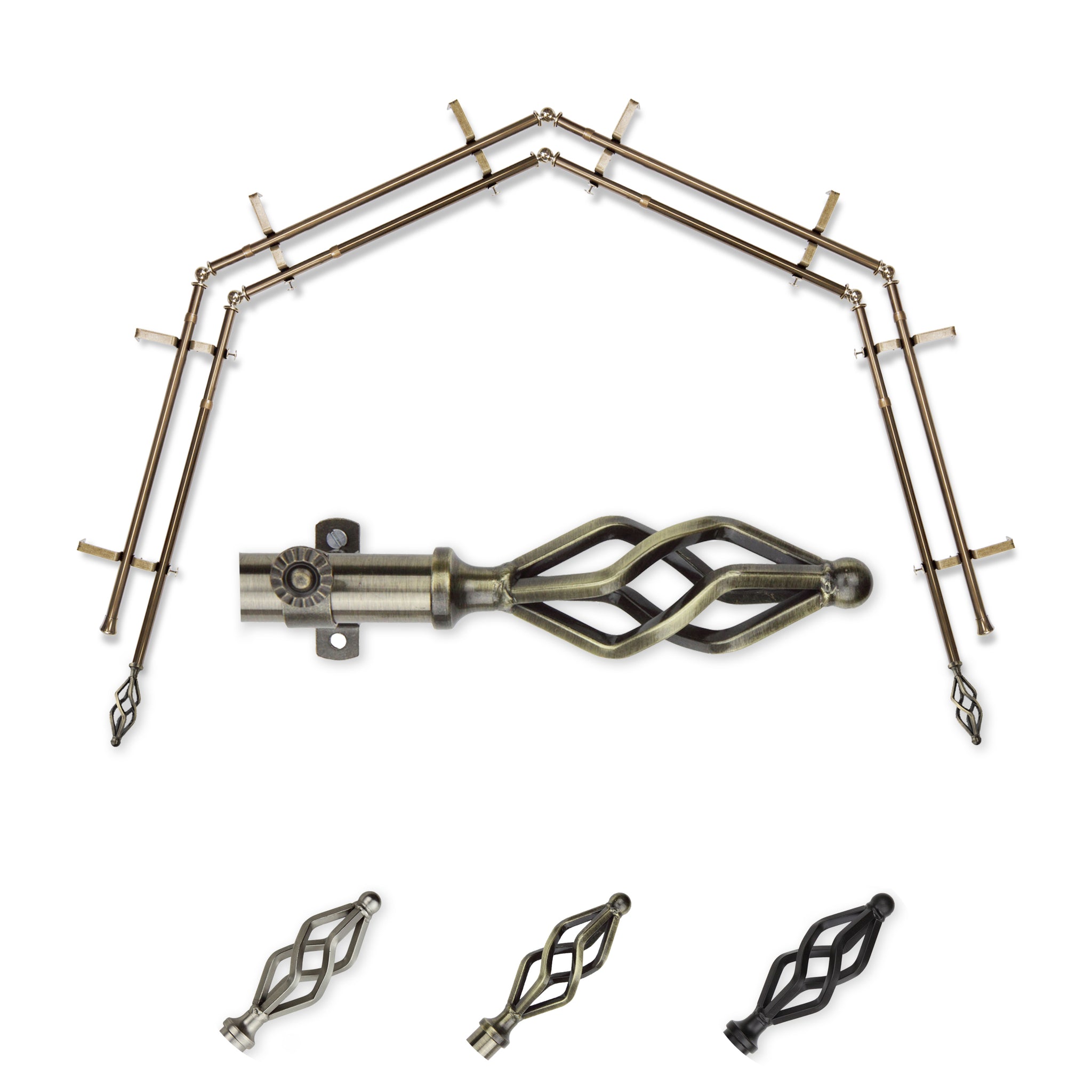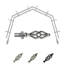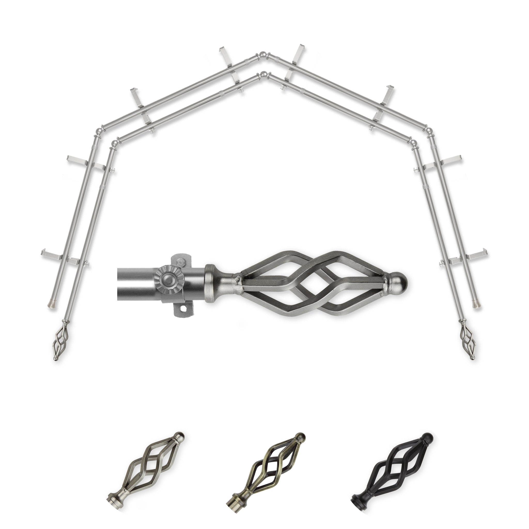 Includes eight 13/16" diameter adjustable poles, one pair of decorative finials, 8 double brackets, 6 corner connectors, and mounting hardware
