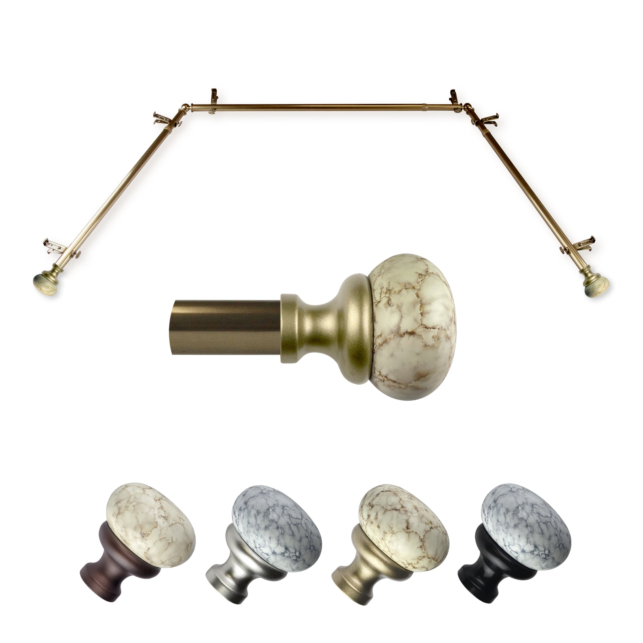 Includes two 13/16" diameter adjustable 20-36 inch poles, one adjustable 38-72 inch pole, one pair of finials, 6 brackets, 2 corner connectors, and mounting hardware