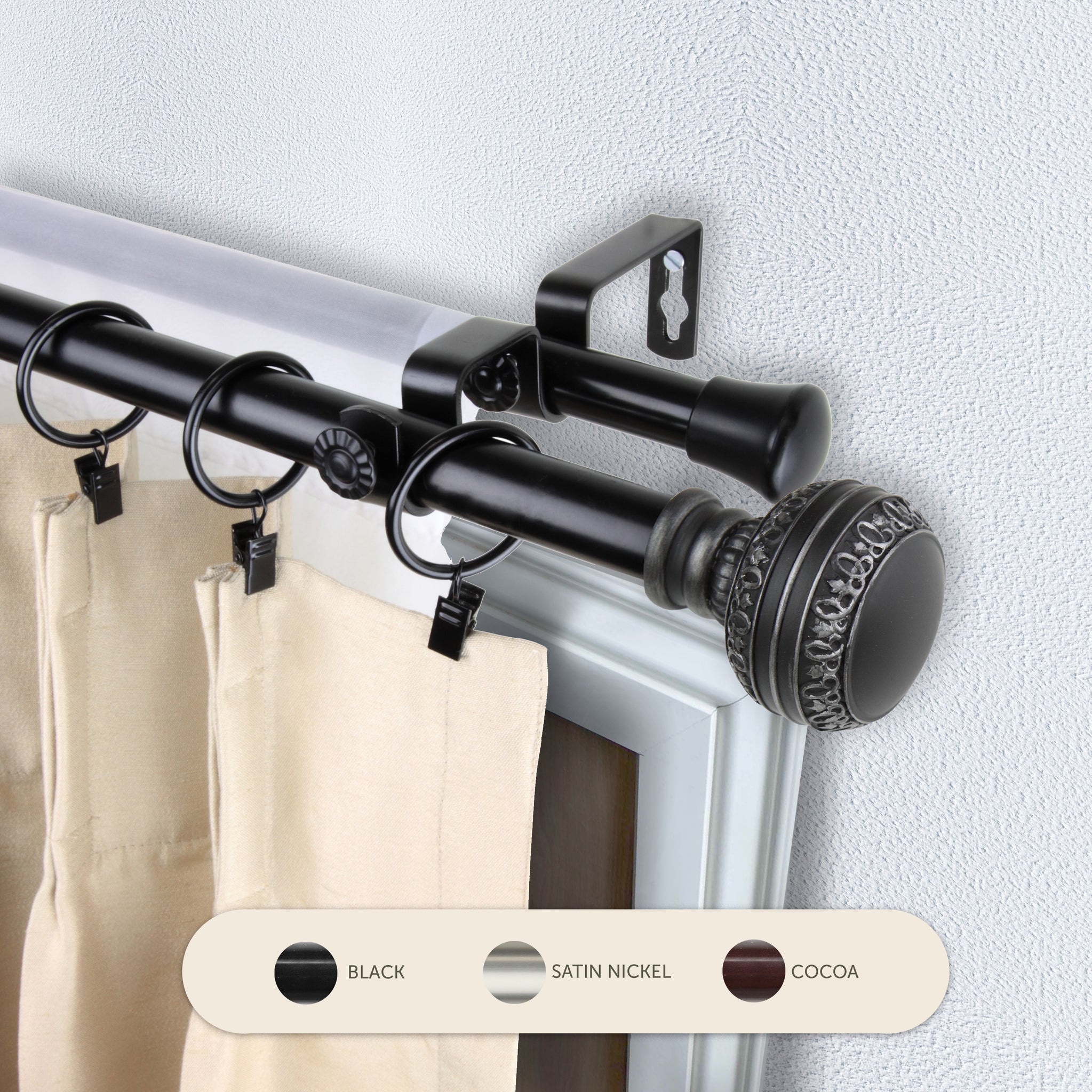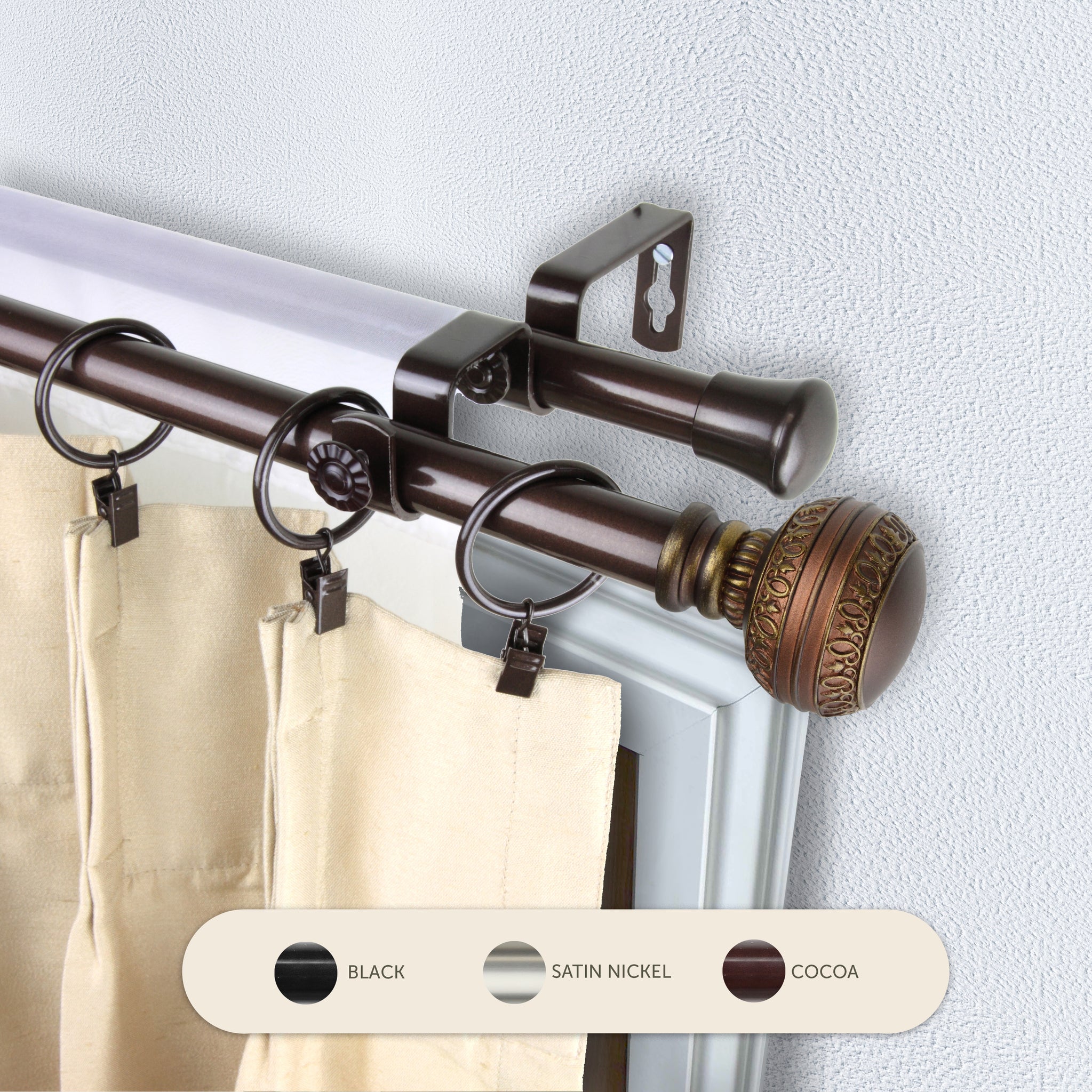 Includes two 13/16" adjustable high-quality steel telescoping poles, two finials, double brackets, and mounting hardware