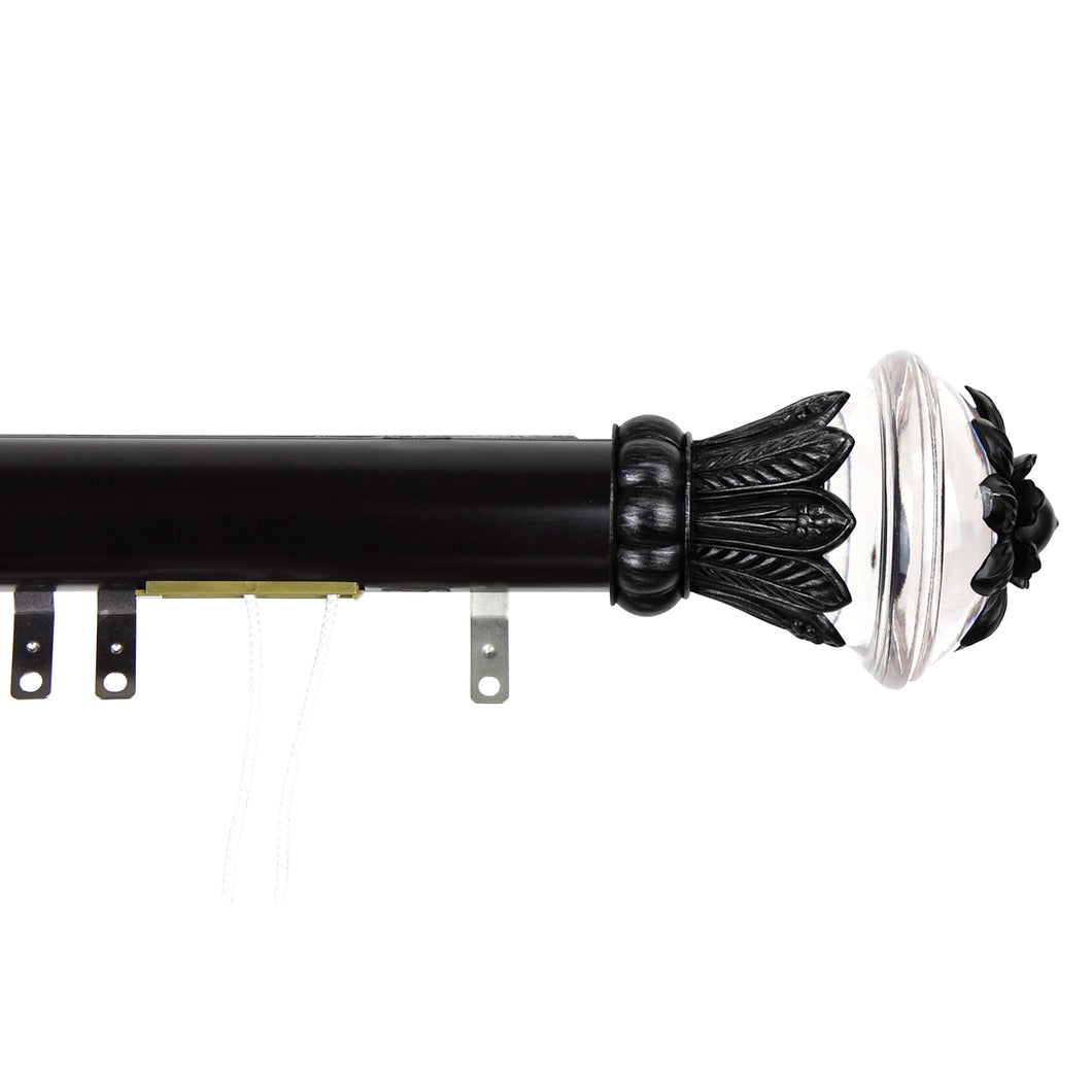 Includes one 1.5" diameter adjustable traverse rod w/ sliders, one pair of decorative finials, brackets, and mounting hardware