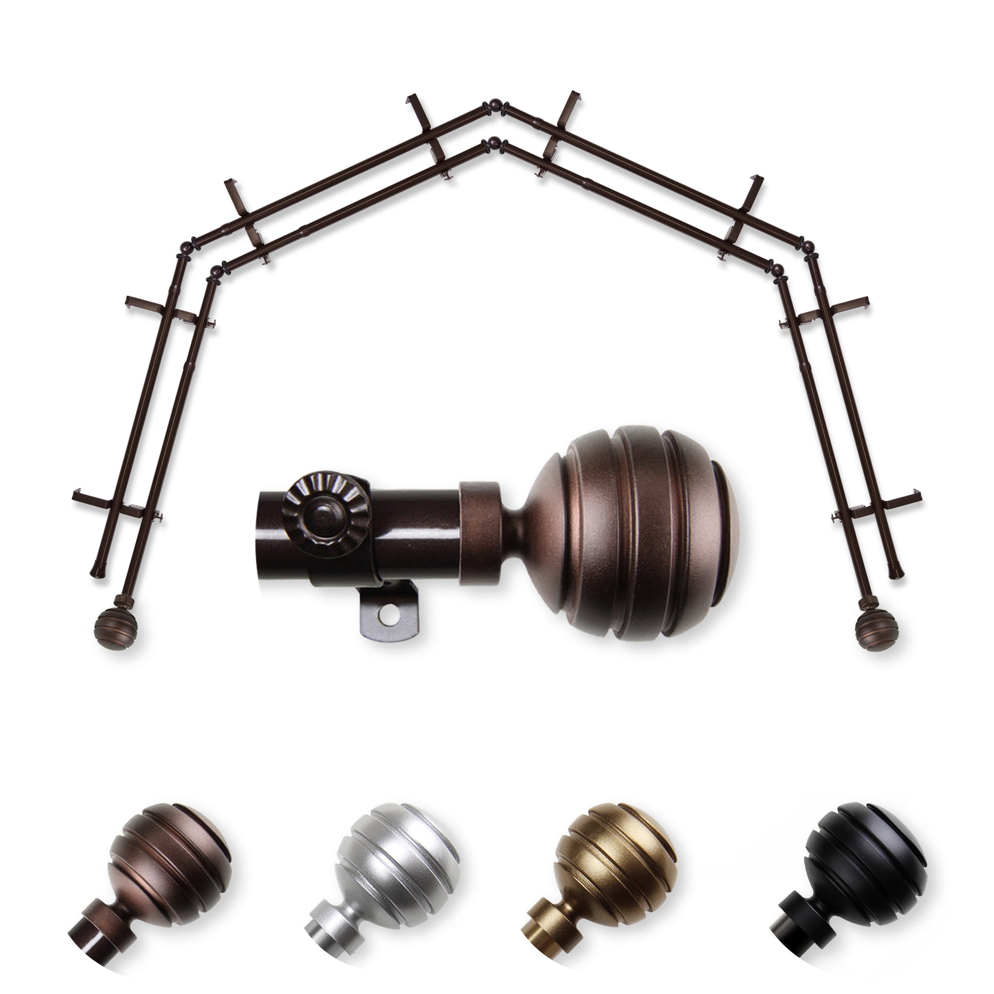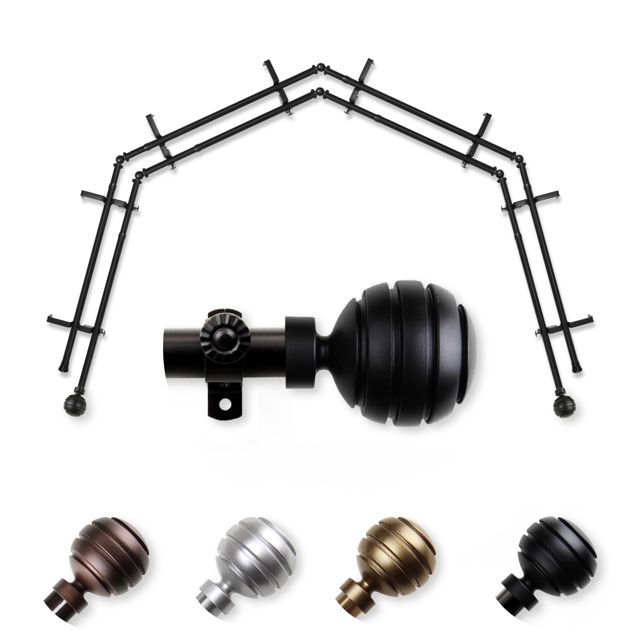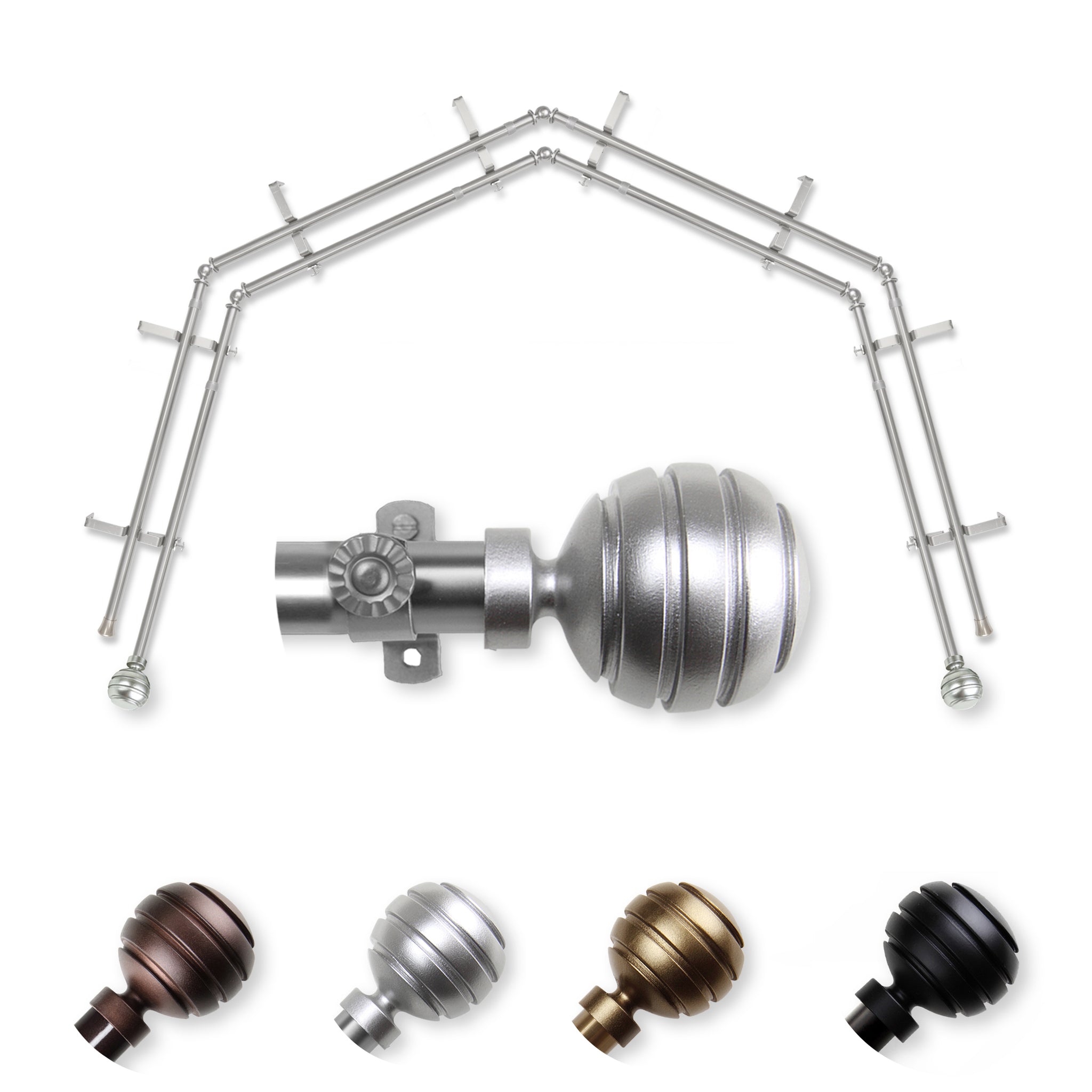 Includes eight 13/16" diameter adjustable poles, one pair of decorative finials, 8 double brackets, 6 corner connectors, and mounting hardware