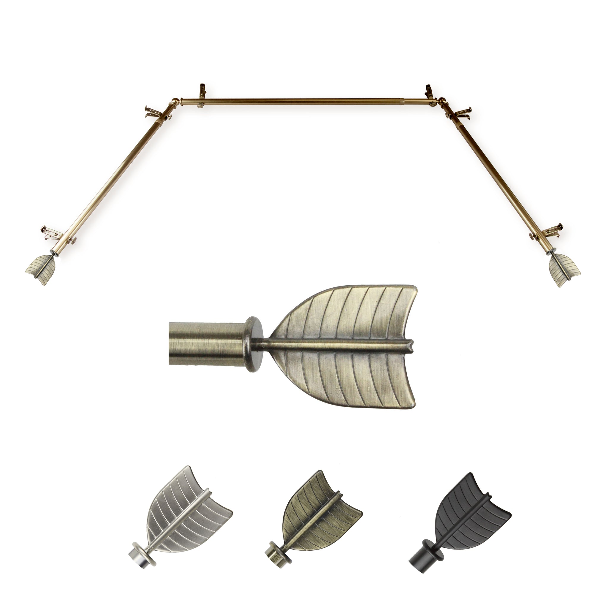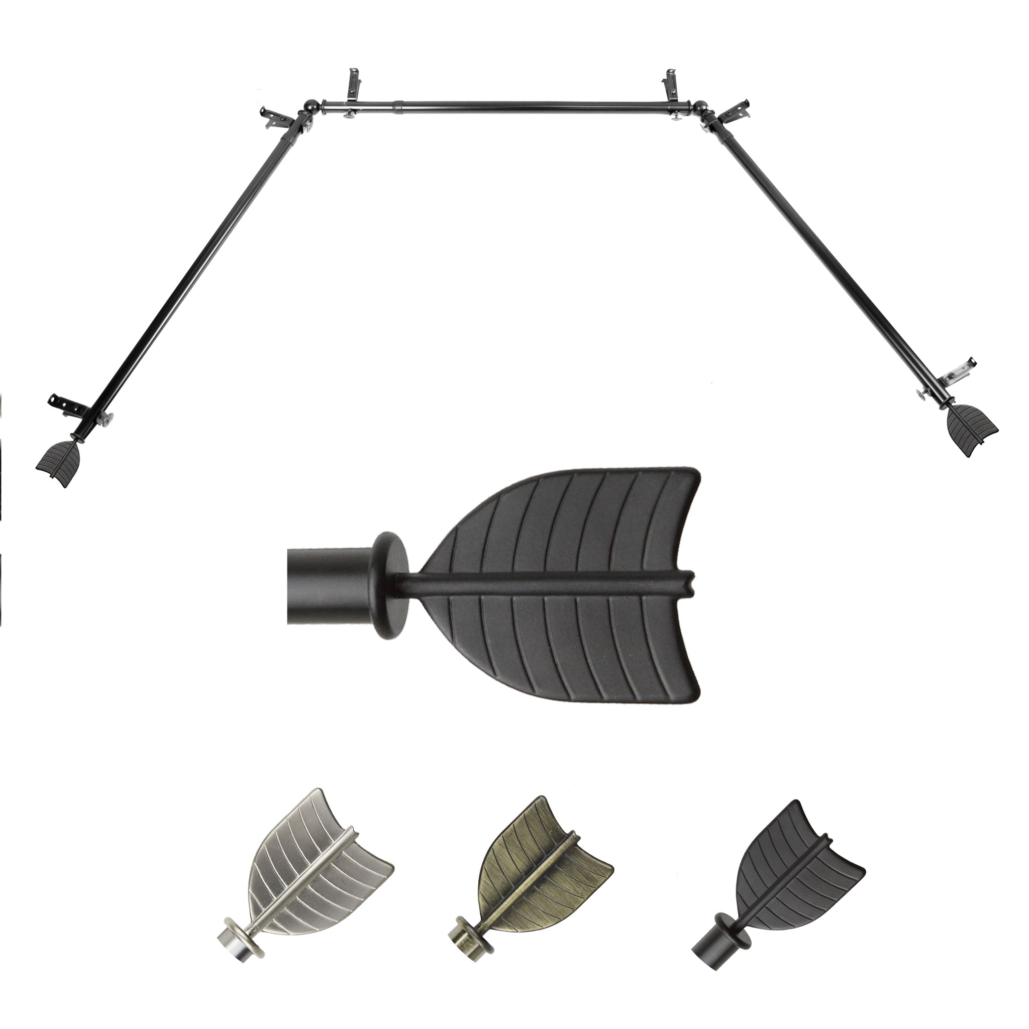 Includes two 13/16" diameter adjustable 20-36 inch poles, one adjustable 38-72 inch pole, one pair of finials, 6 brackets, 2 corner connectors, and mounting hardware