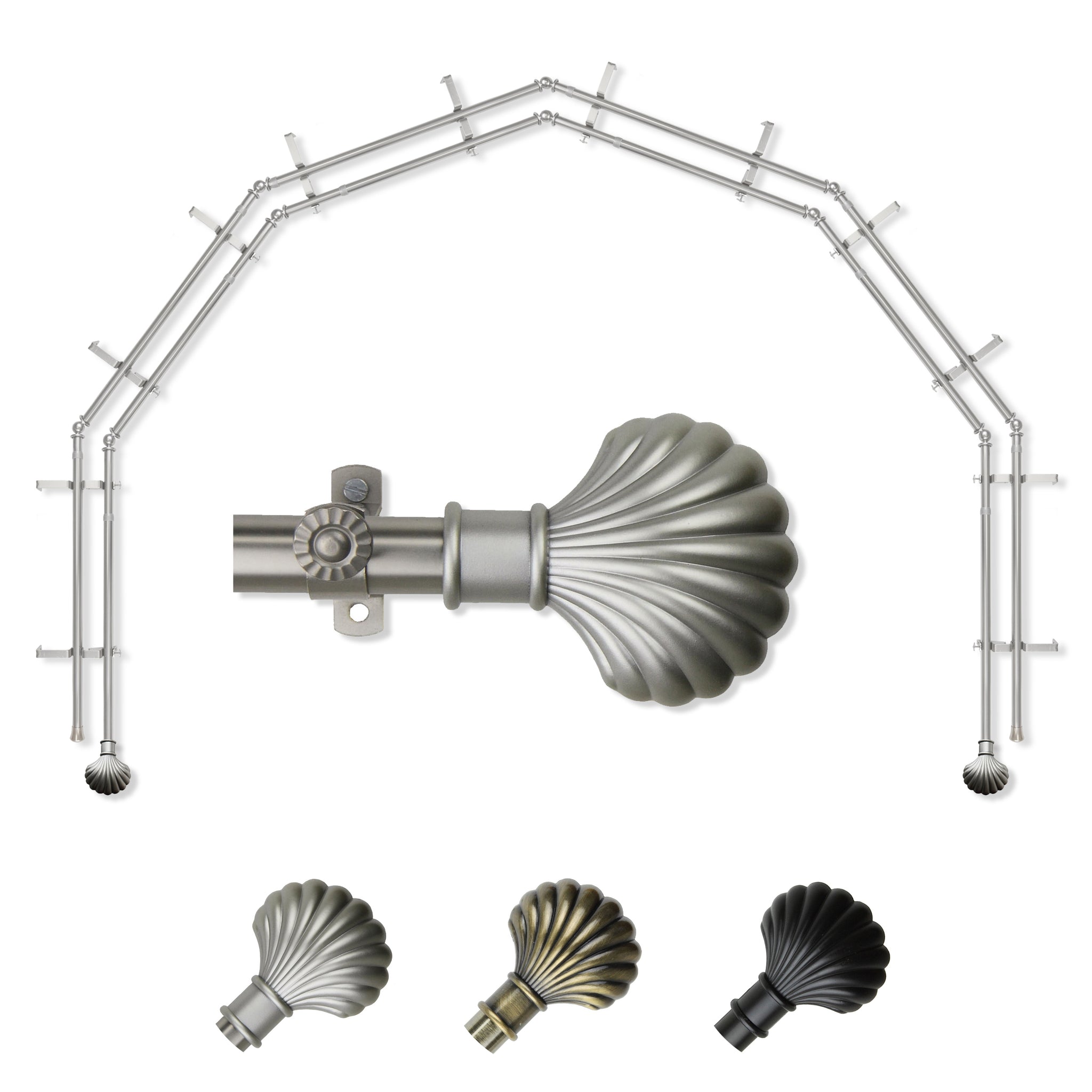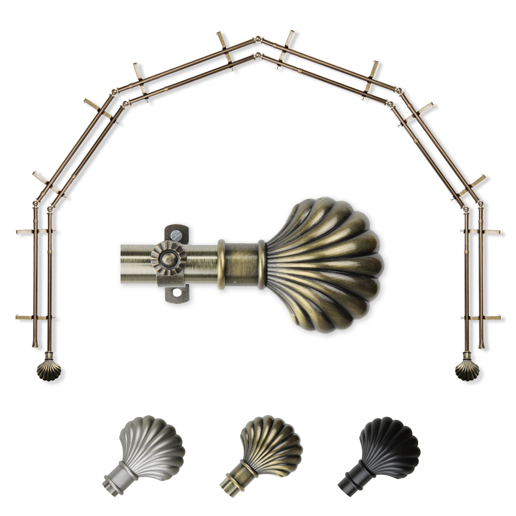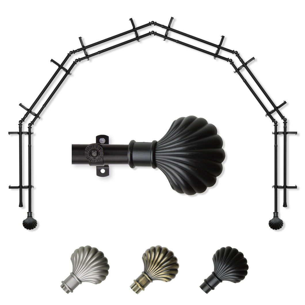 Includes twelve 13/16" diameter adjustable poles, one pair of decorative finials, 12 double brackets, 10 corner connectors, and mounting hardware
