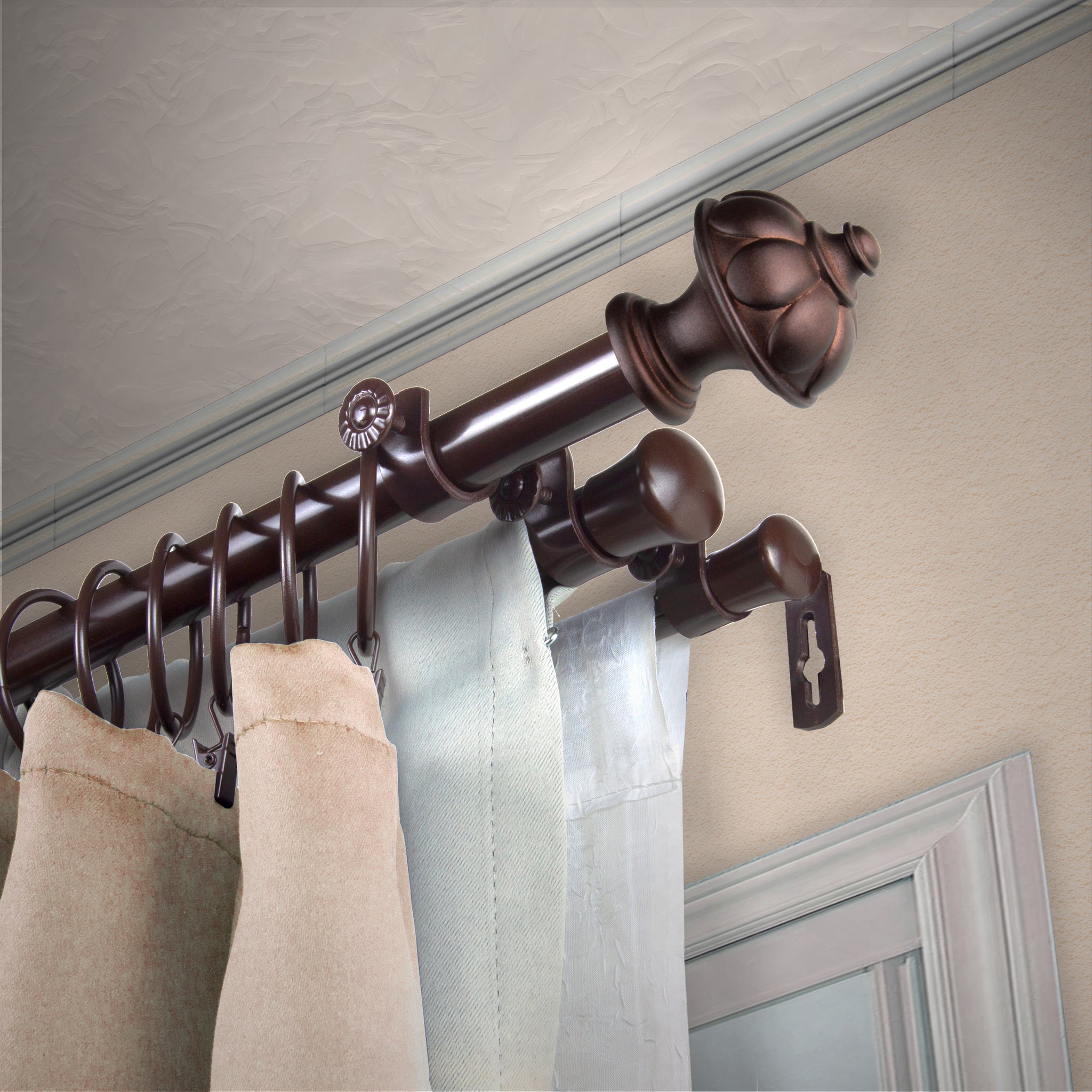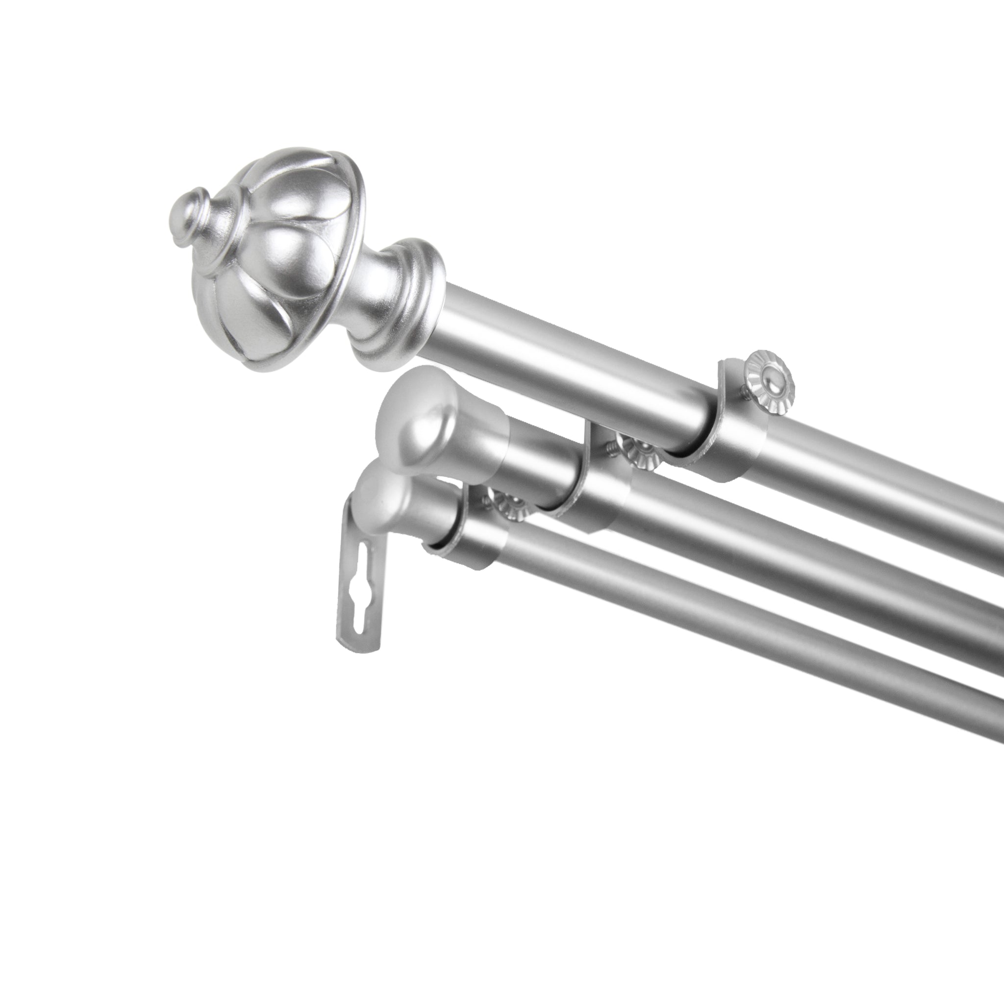 Includes two 13/16" adjustable curtain rods, one 5/8" adjustable back rod, two finials, brackets, and mounting hardware