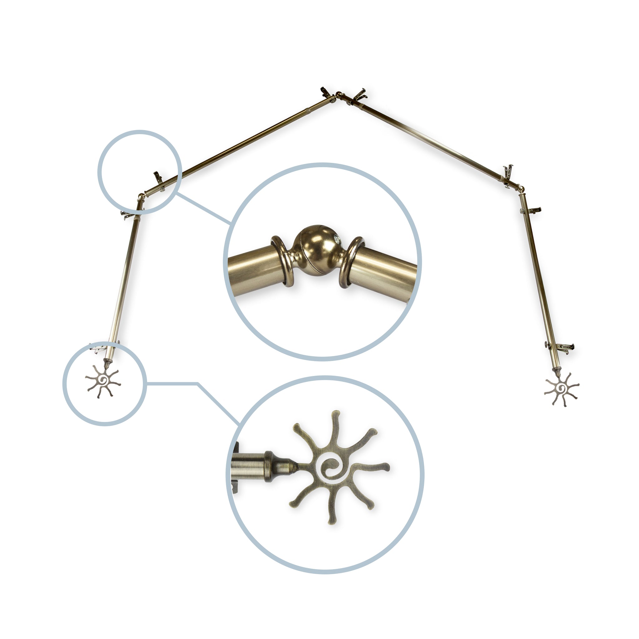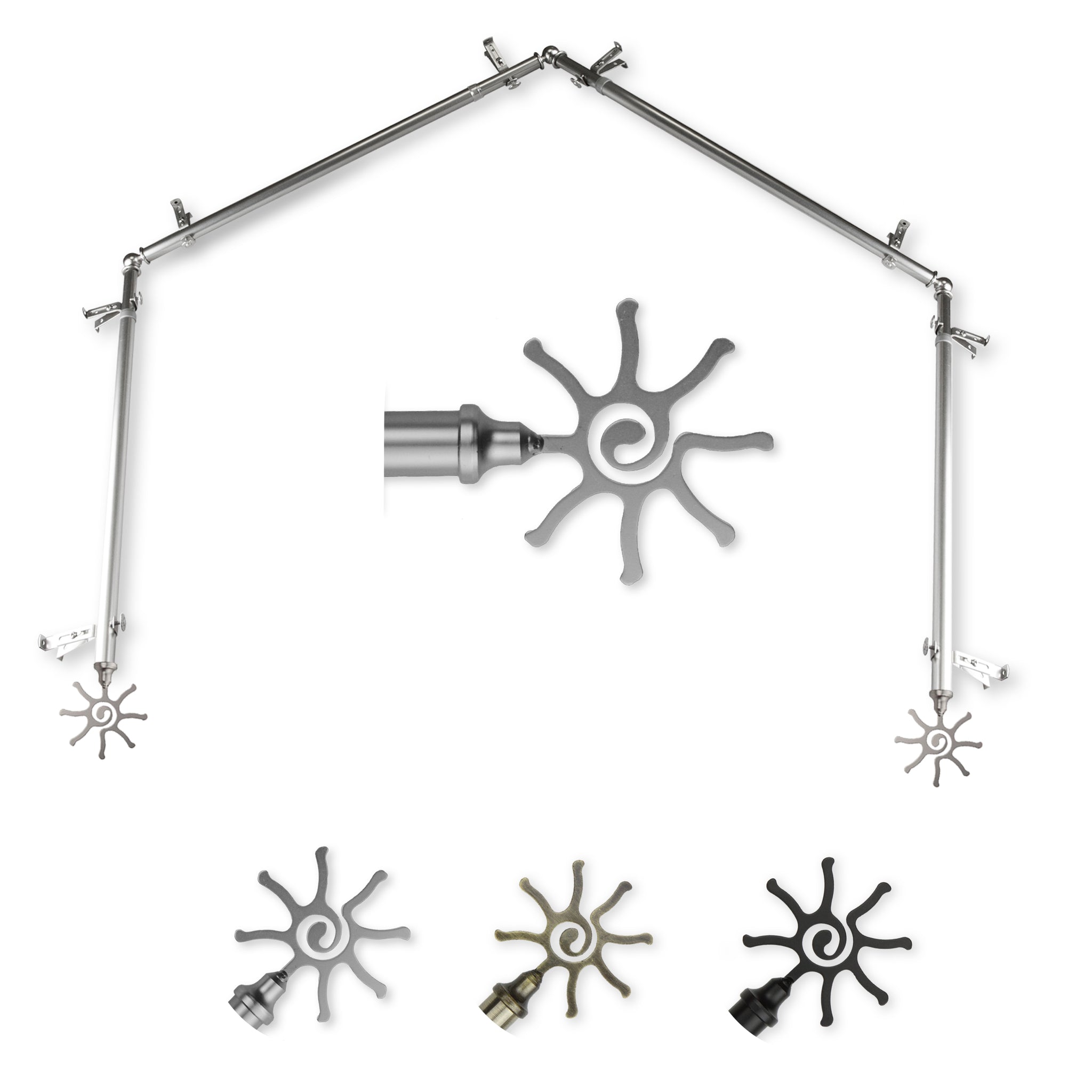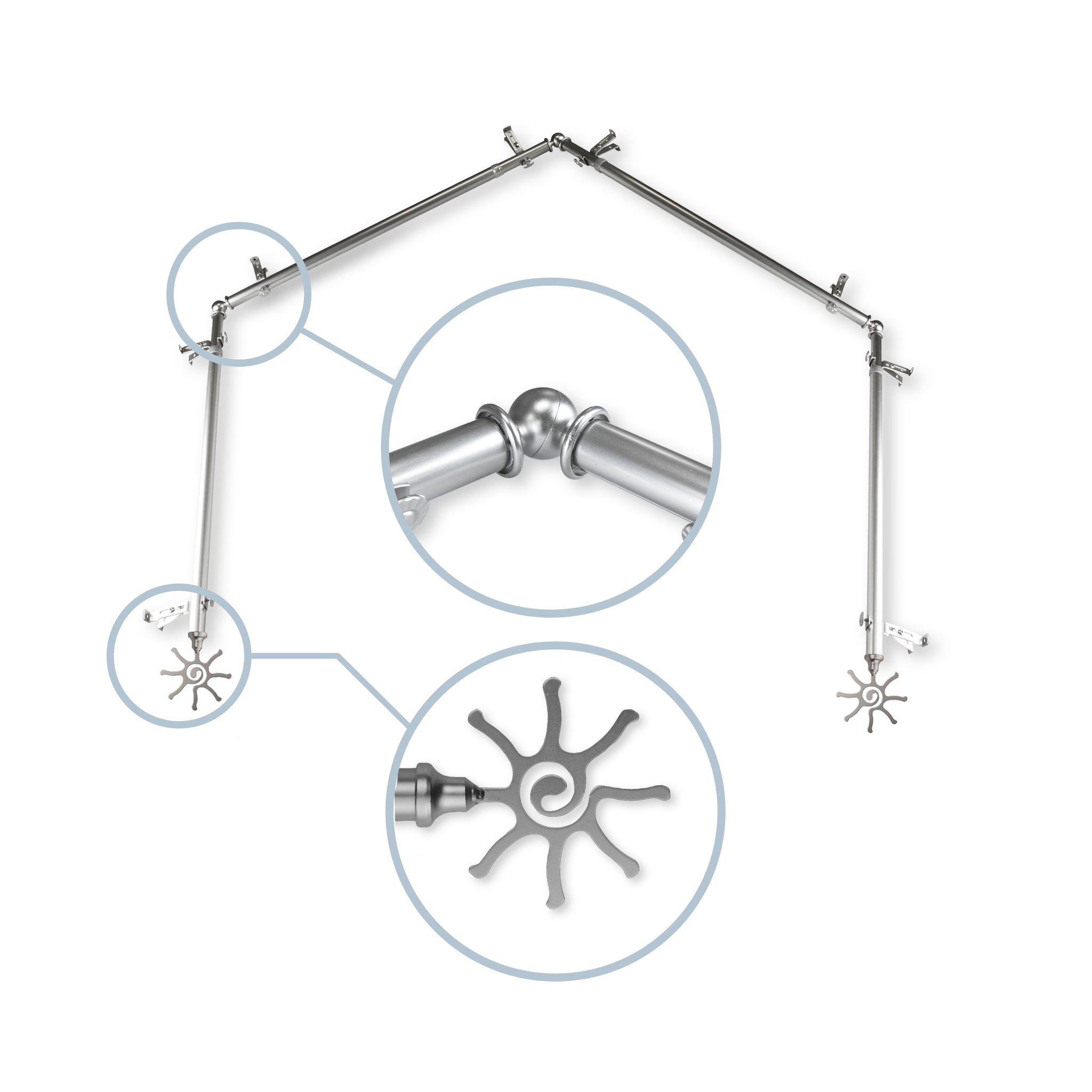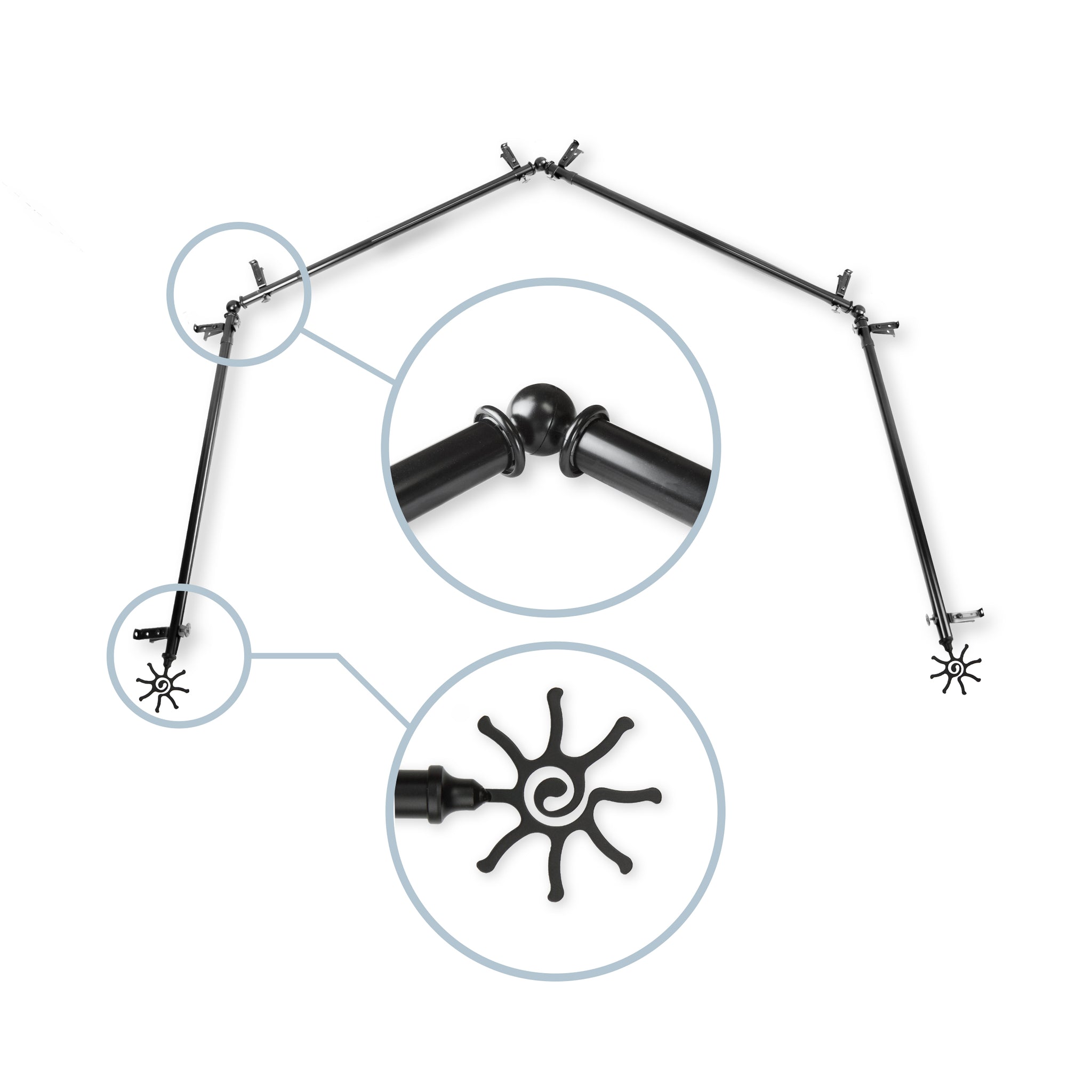 Includes four 13/16" diameter adjustable poles, one pair of decorative finials, 8 single brackets, 3 corner connectors, and mounting hardware