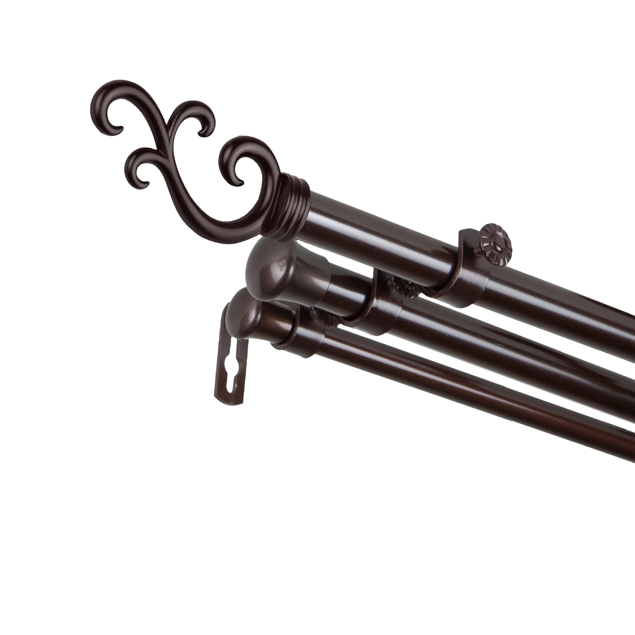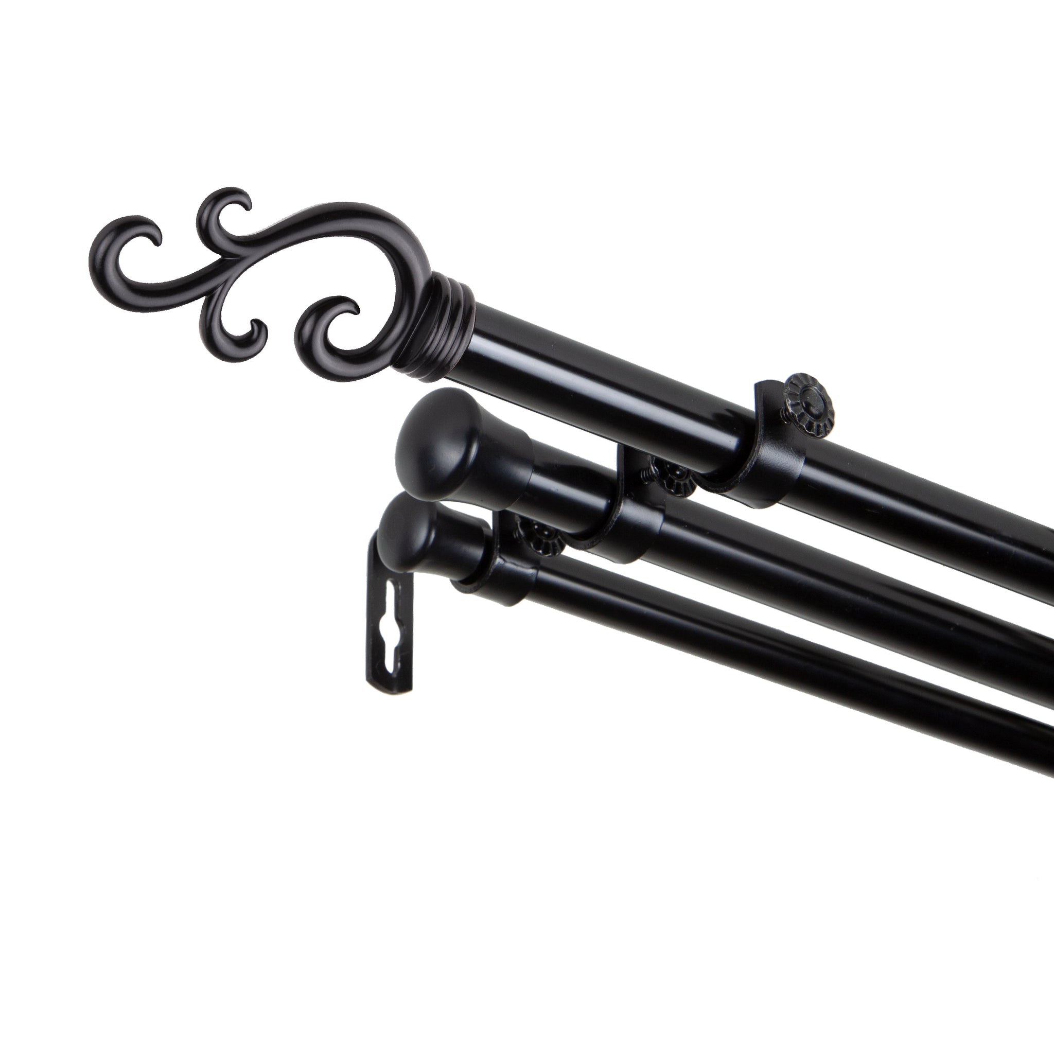 Includes two 13/16" adjustable curtain rods, one 5/8" adjustable back rod, two finials, brackets, and mounting hardware