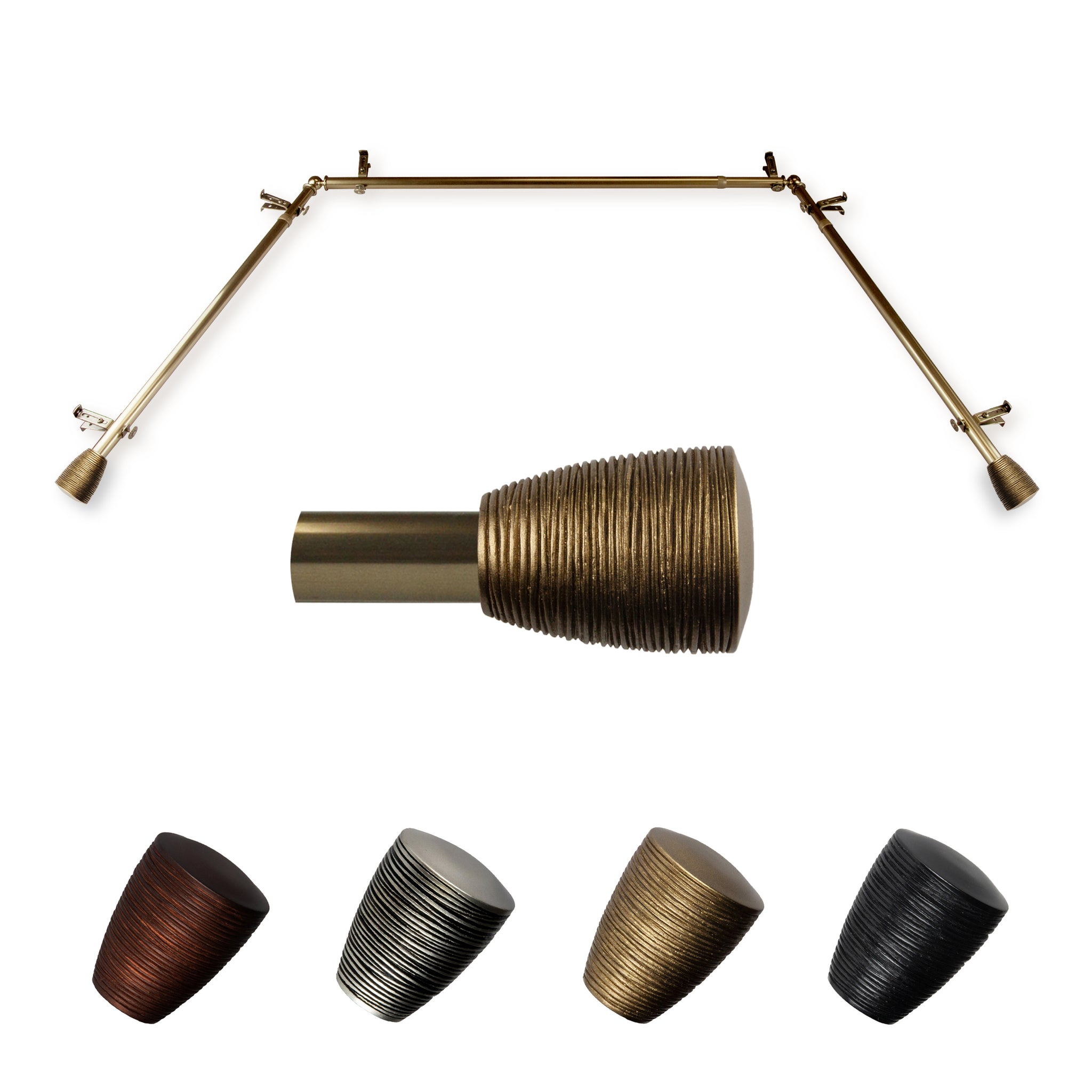 Includes two 13/16" diameter adjustable 20-36 inch poles, one adjustable 38-72 inch pole, one pair of finials, 6 brackets, 2 corner connectors, and mounting hardware