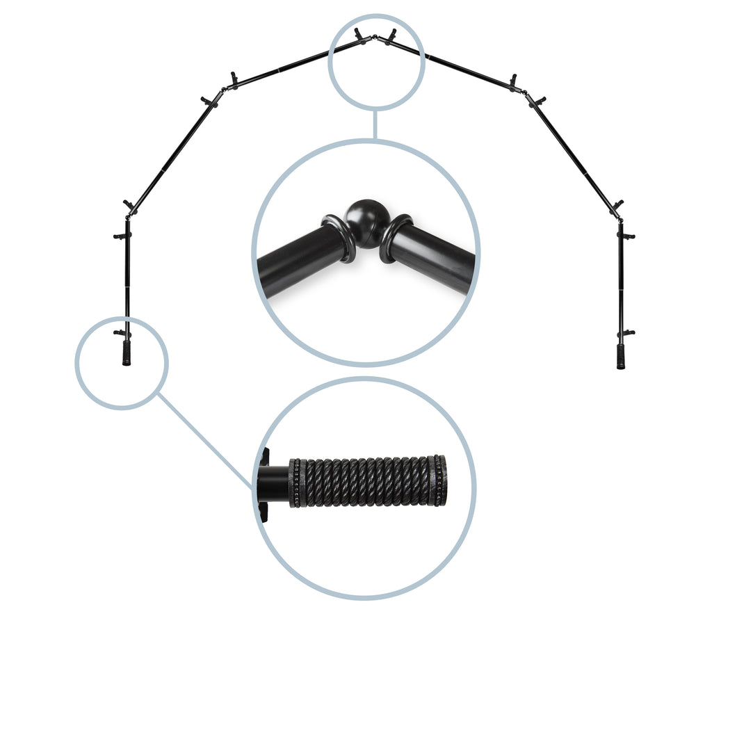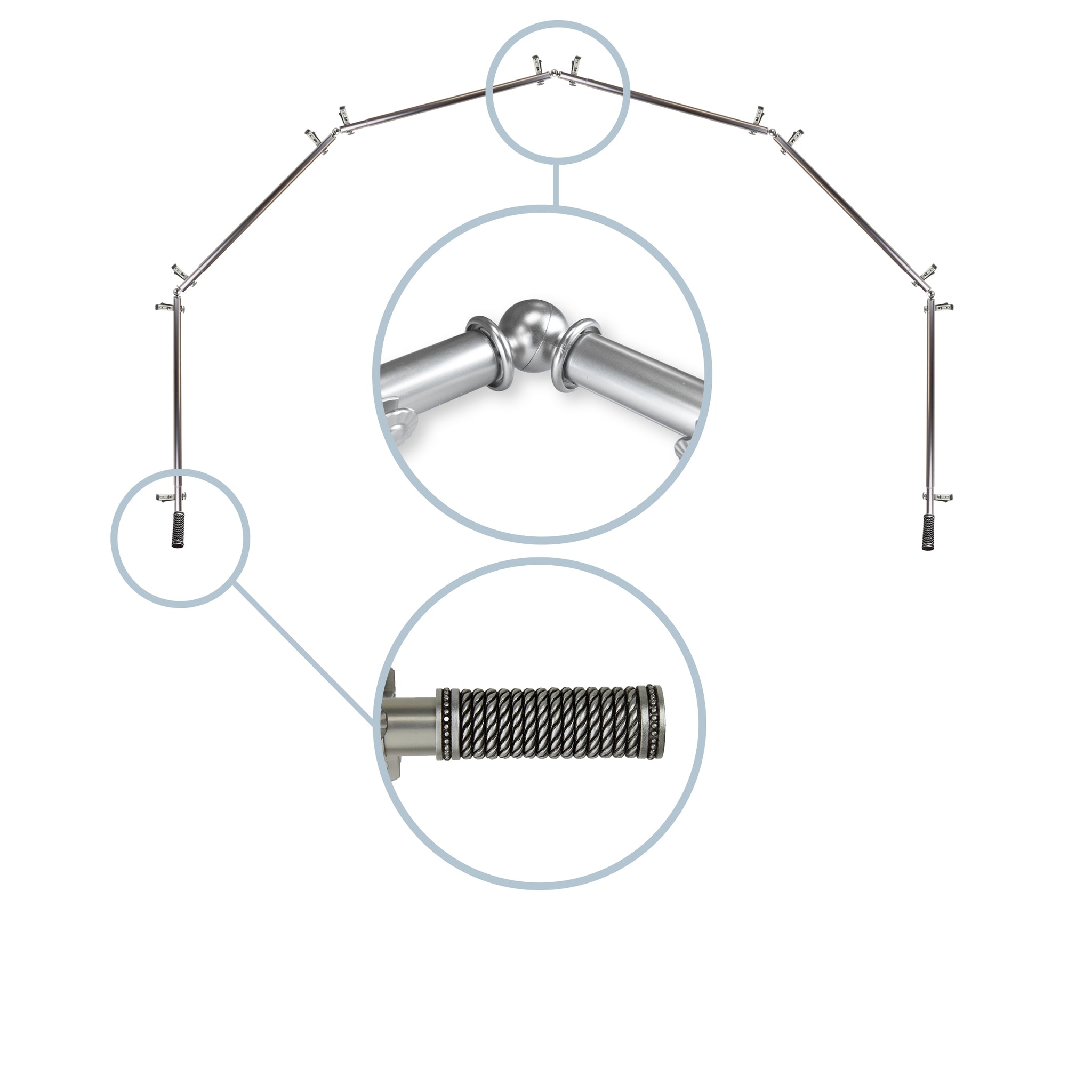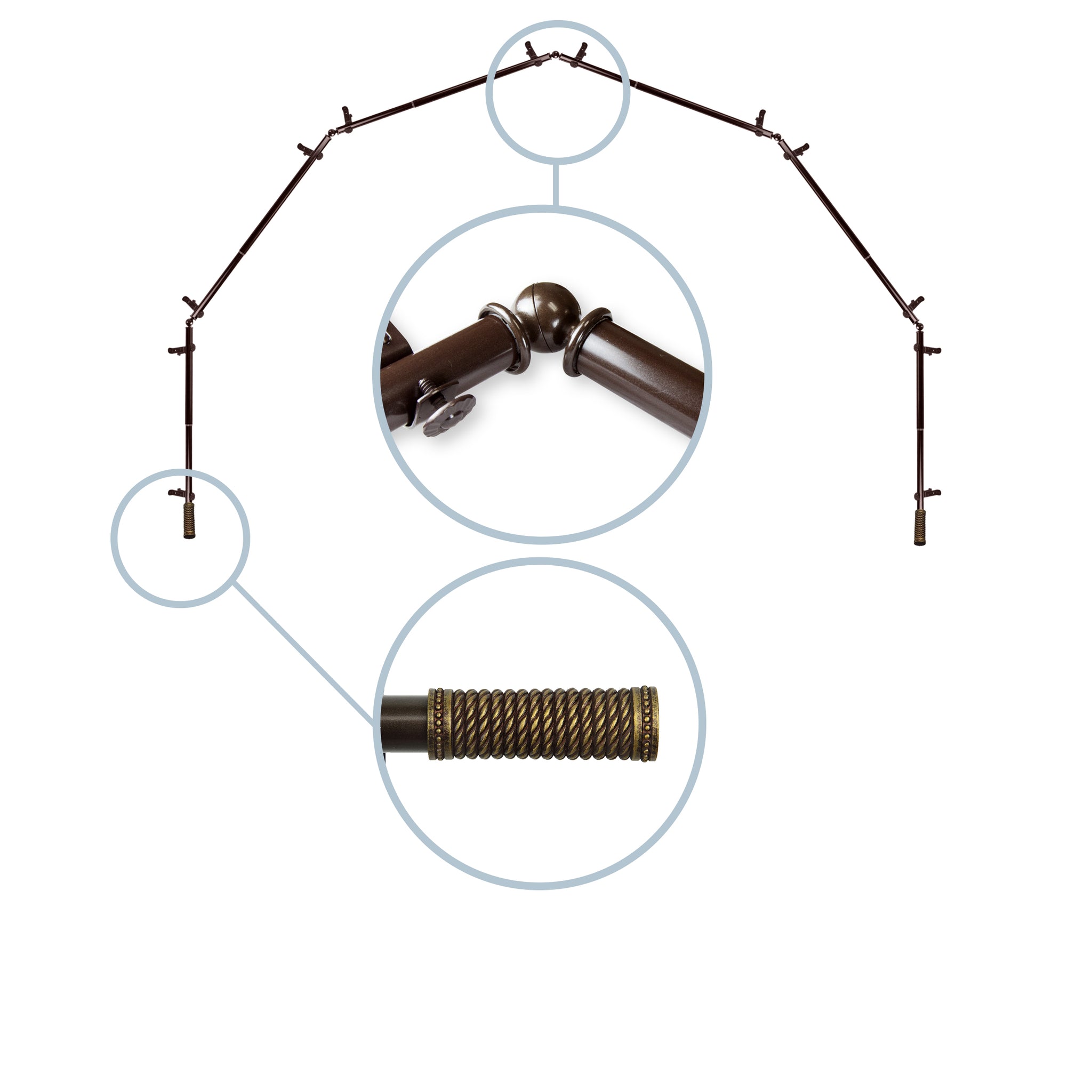 Includes six 13/16" diameter adjustable poles, one pair of decorative finials, 12 single brackets, 5 corner connectors, and mounting hardware